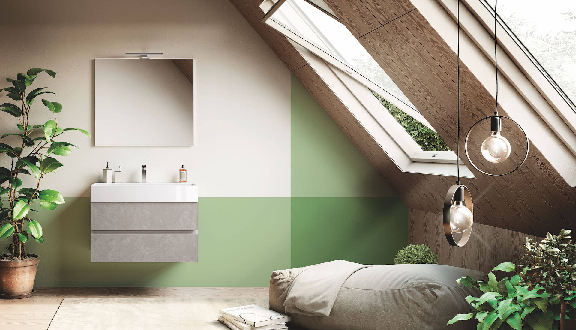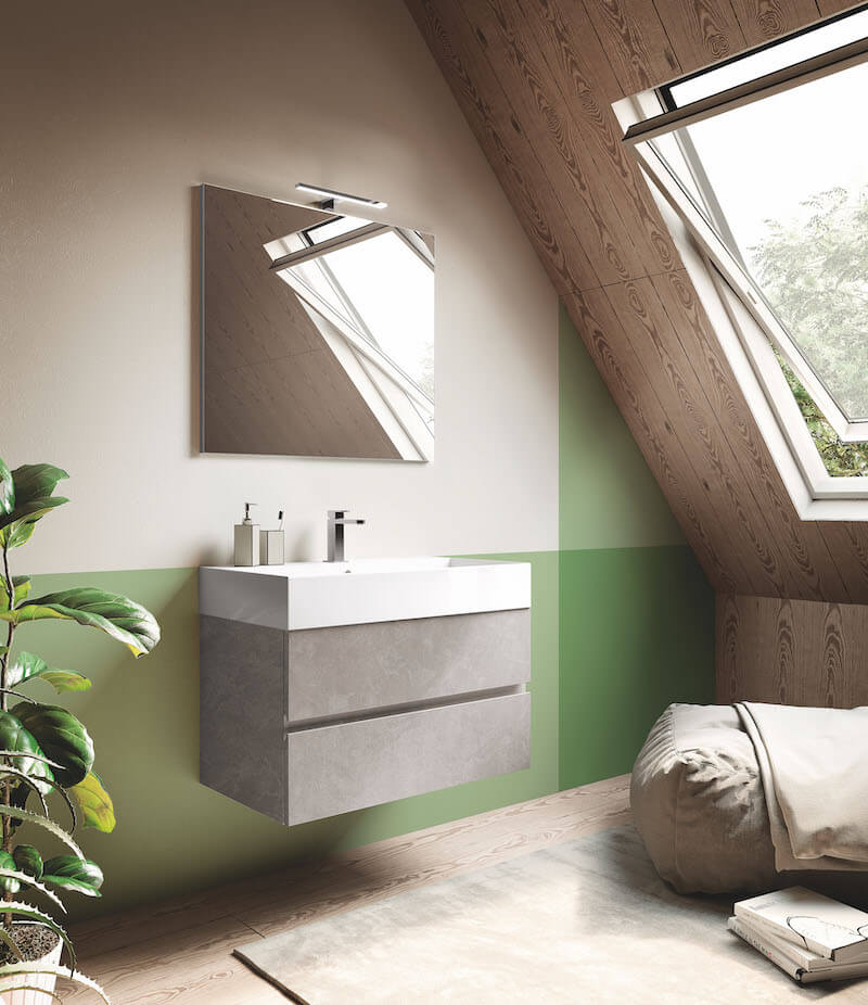 The Ares Lunar surface with a cement effect perfectly matches the pure, smooth white of the ceramic console.