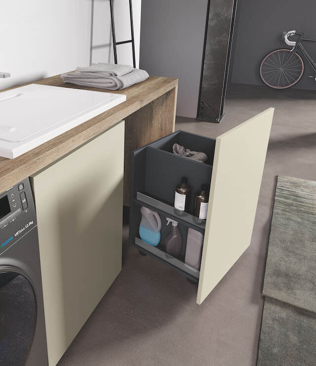 In this composition that makes functionality its strong point, a large worktop integrates a large ceramic sink, composes a structure that encloses washing machine and practical pull-out trolleys for linen and ready to use objects. In detail, you can see the large ceramic bathtub with the practical wash-tub axis in the position of use, made of gelcooked material (Ocritech White Glossy).