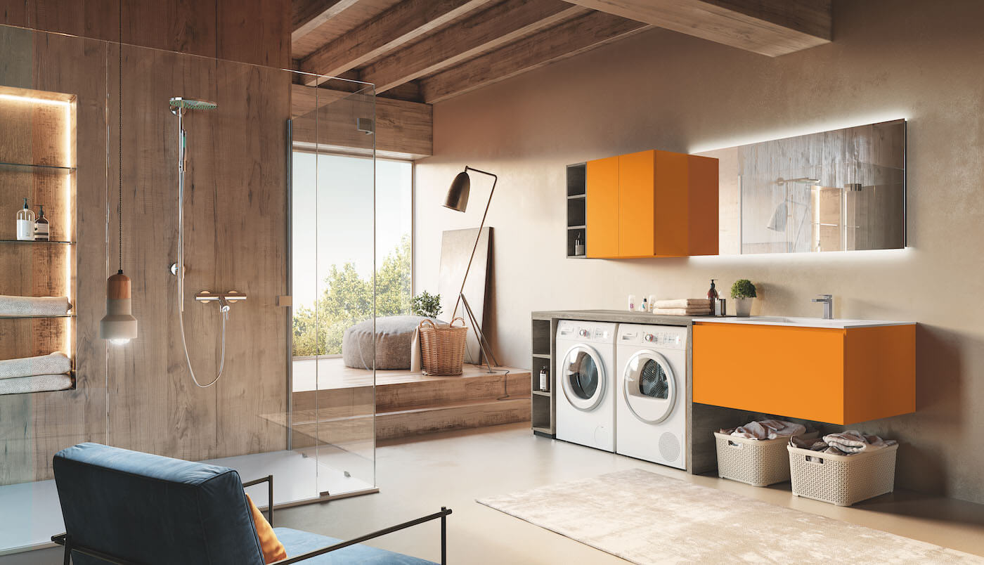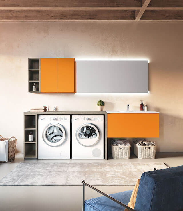 An important composition that solves the entire laundry space, presenting capable containers and housing for appliances. Interesting is the open compartment next to the washing machine, where you can place detergents and anything else useful for its use.