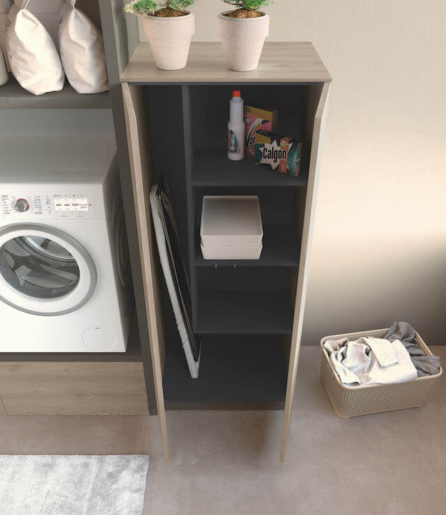 In this proposal we started from the basic element of the simple wash-house with a dedicated base, integrating a functional bridge solution, able to accommodate appliances and flanking a column with an equipped compartment. A complete solution. The divider inside the column, allows you to accommodate your choice, ironing board or a complete set of brooms and brushes, with their products for use.