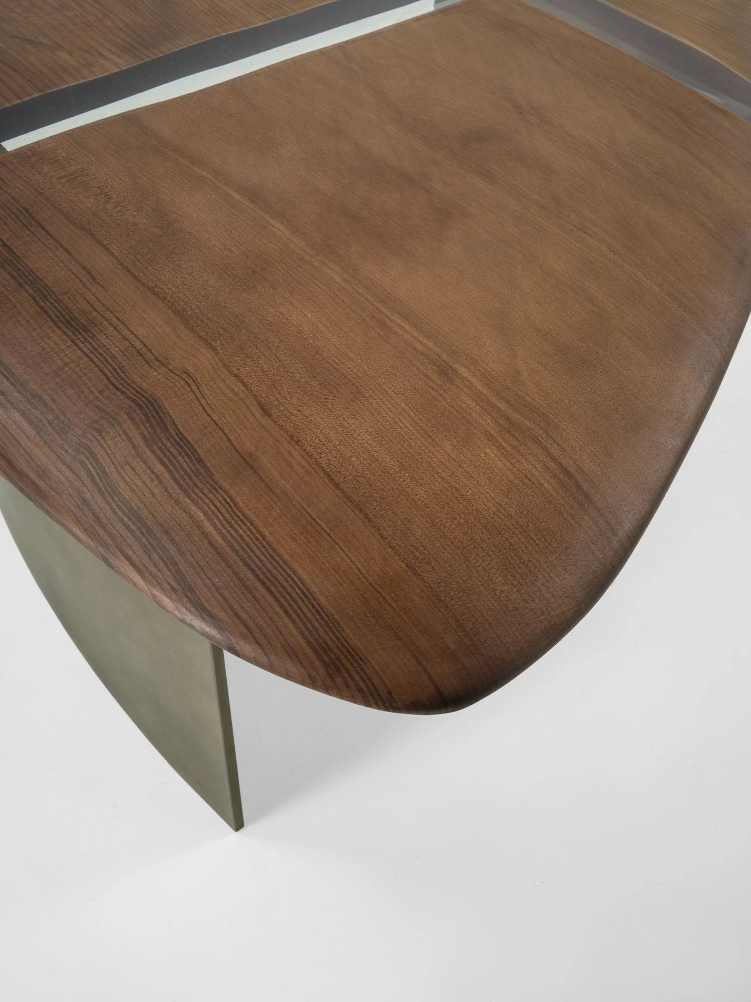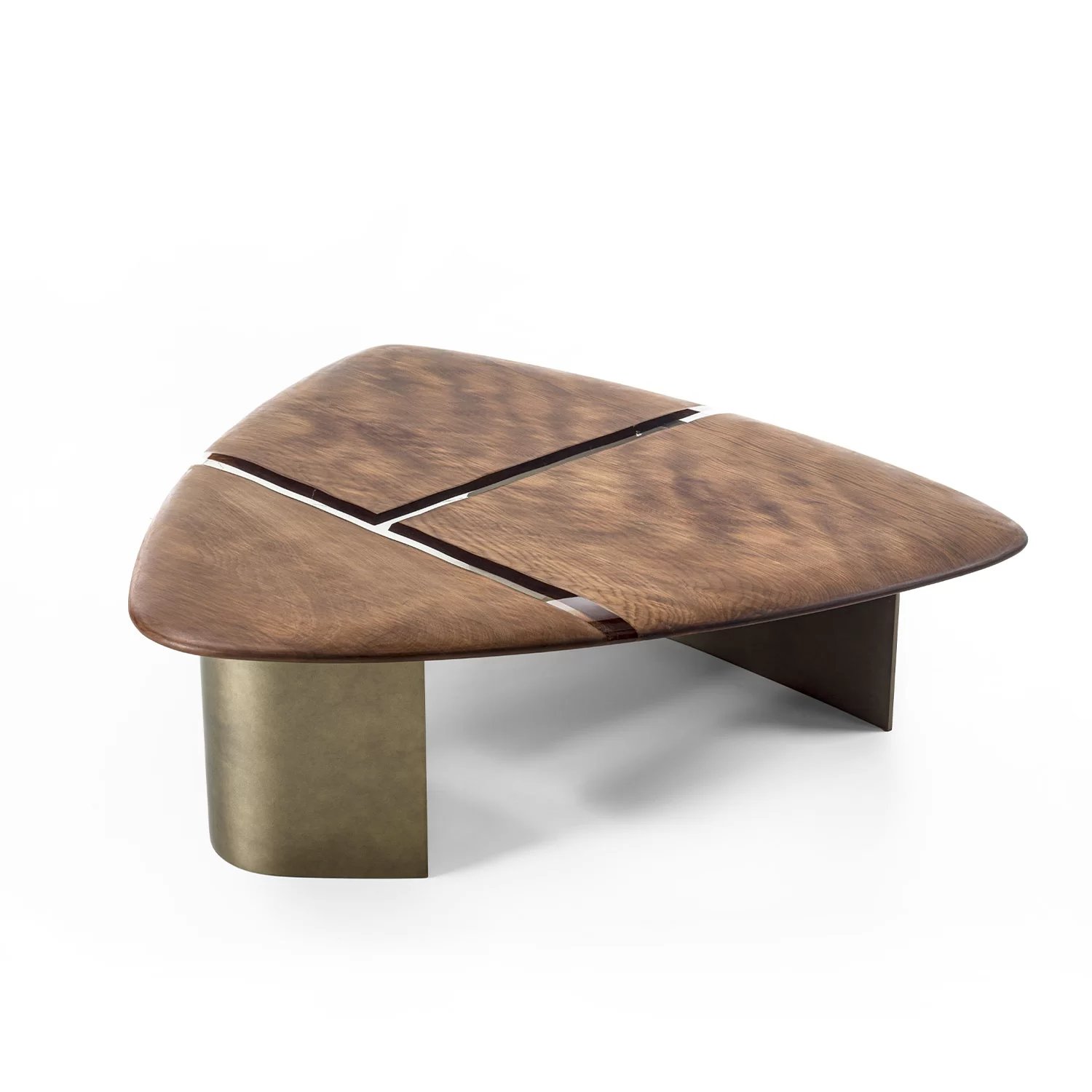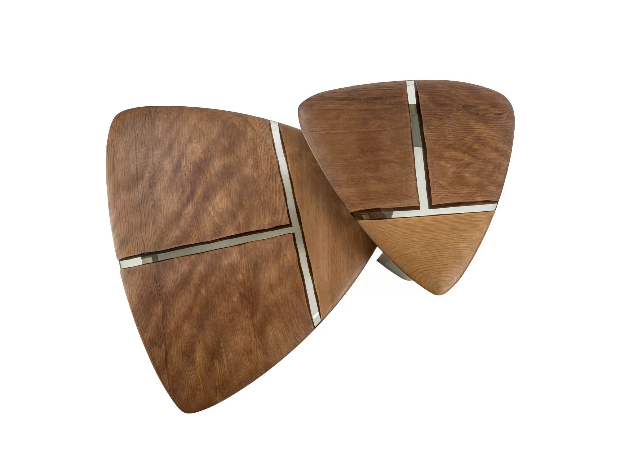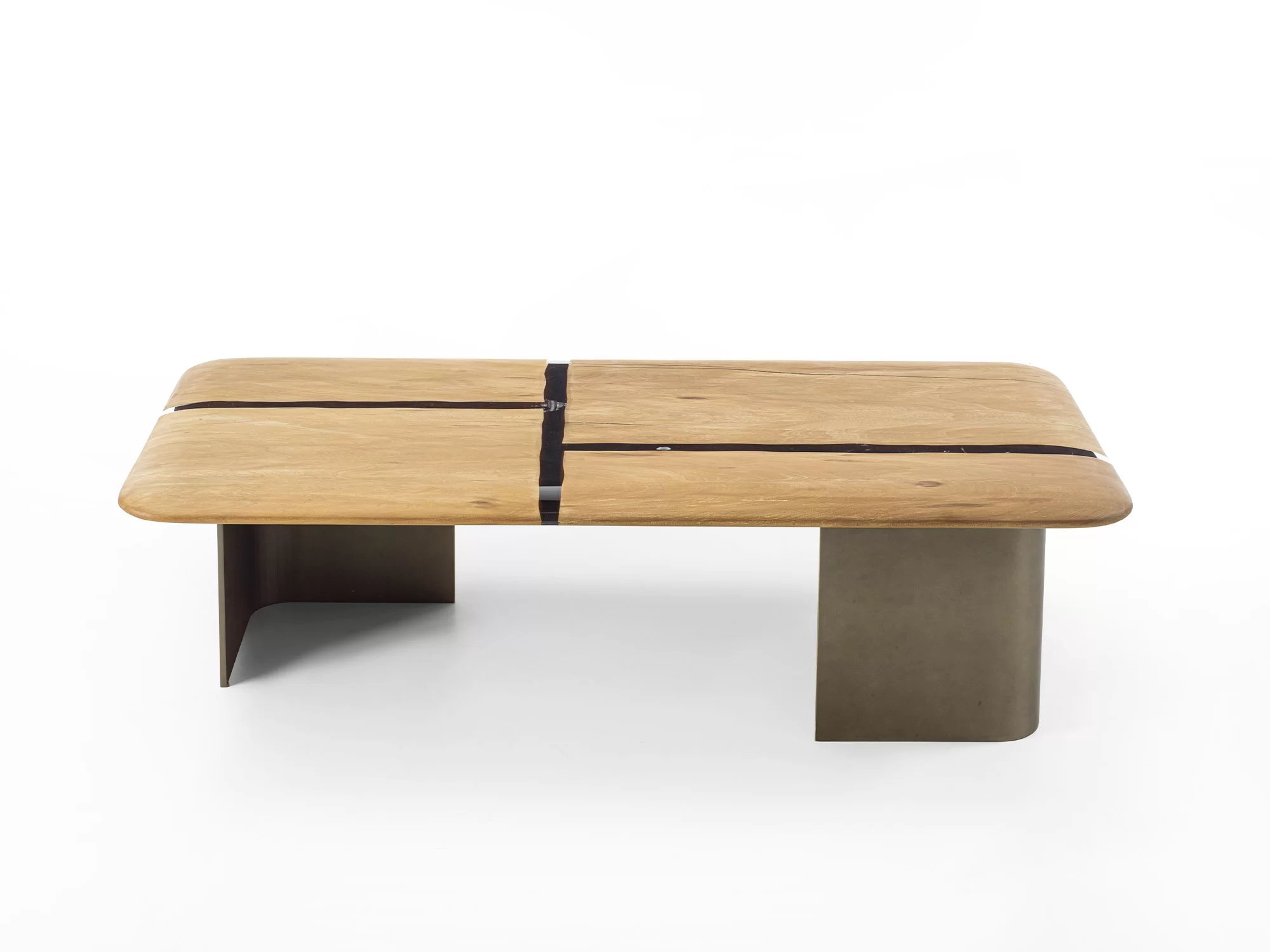 Tavolini il cui top nasce dall’accostamento di parti in legno di Kauri con inserti in resina, che insieme creano geometrie dinamiche e raffinate, abbinato ad una base in ferro, disponibile in due altezze. Gli spessori assottigliati tramite lavorazione a saponetta del top donano leggerezza e sinuosità.