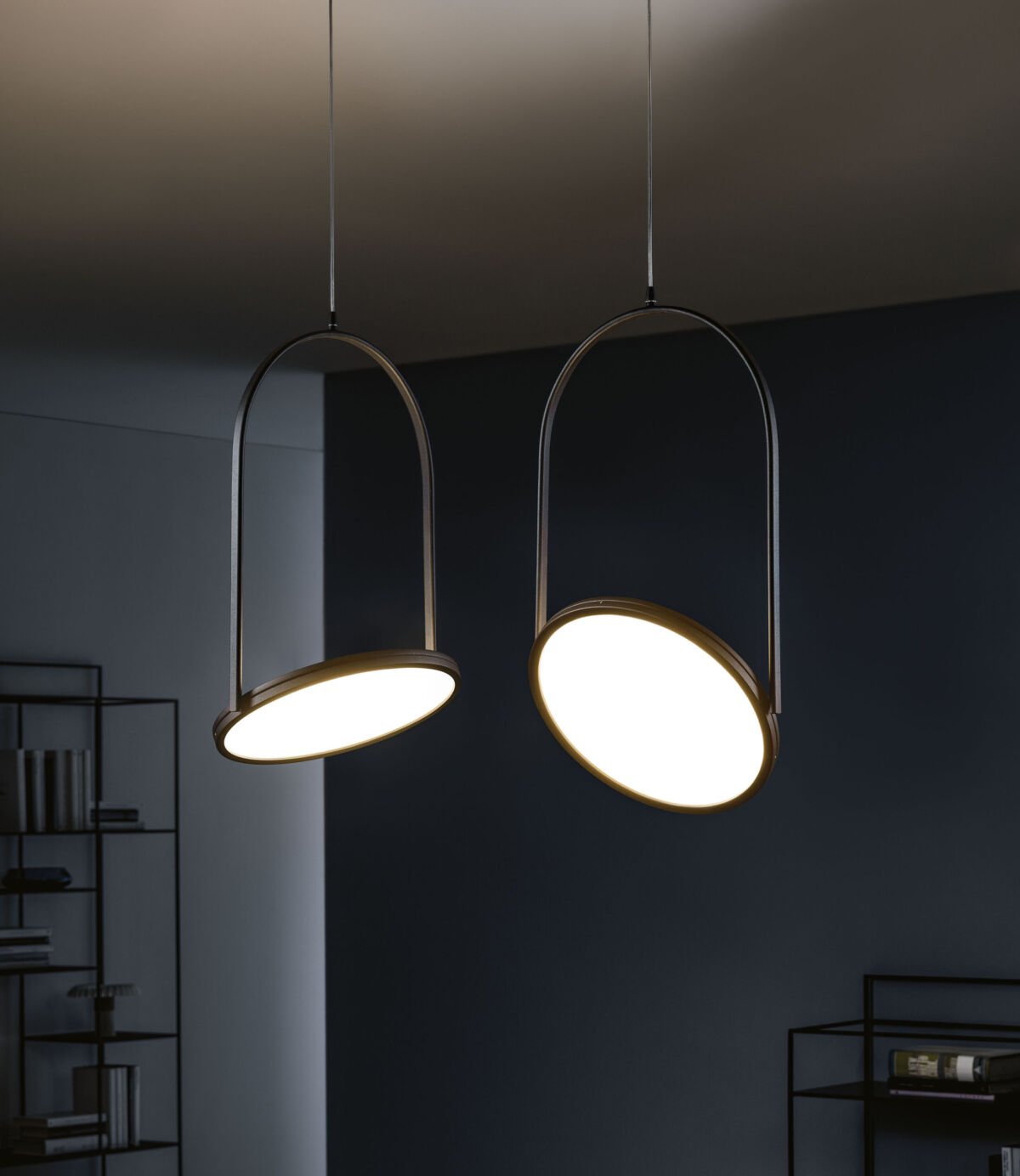 Lampada Led a sospensione caratterizzata da una piastra circolare luminosa orientabile ed un design raffinato ed essenziale. Il disco luminoso emette una luce calda da entrambi i lati e può ruotare di 180° permettendo composizioni ed effetti luminosi sempre nuovi.