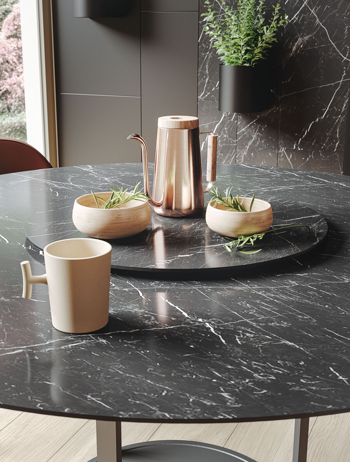 Tavolo da pranzo rotondo caratterizzato da un design essenziale ma elegante ed inedito. La base in metallo dai tratti sottili ed il vassoio rotante posizionato al centro del piano sottolineano la vocazione alla condivisione del tavolo Twirl. Le numerose combinazioni di materiali e finiture possibili, rendono il tavolo Twirl adatto ad ogni ambiente. Vassoio opzionale a scelta tra le numerose finiture di vetro, ceramica e metallo.
