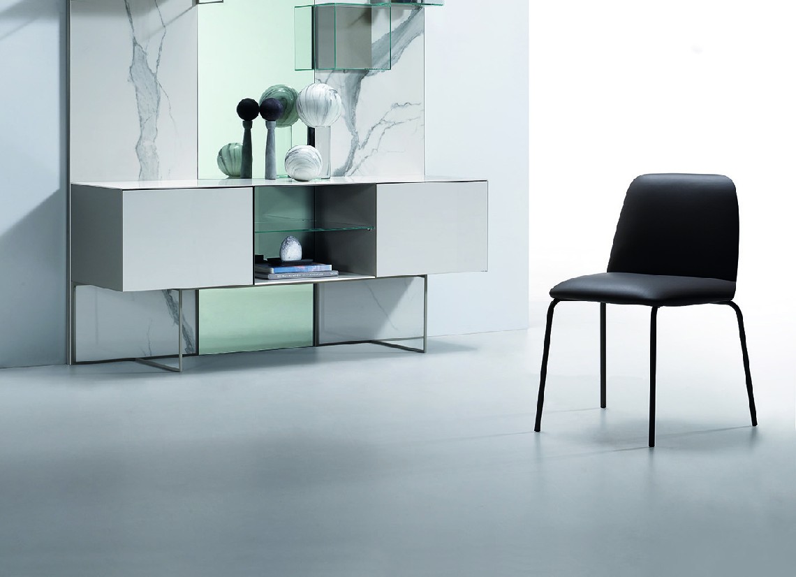 Mantra è una collezione di sedie disponibile in due versioni: con imbottitura liscia o lavorata a triangoli. La seduta è disponibile in pelle, velluto o ecopelle.