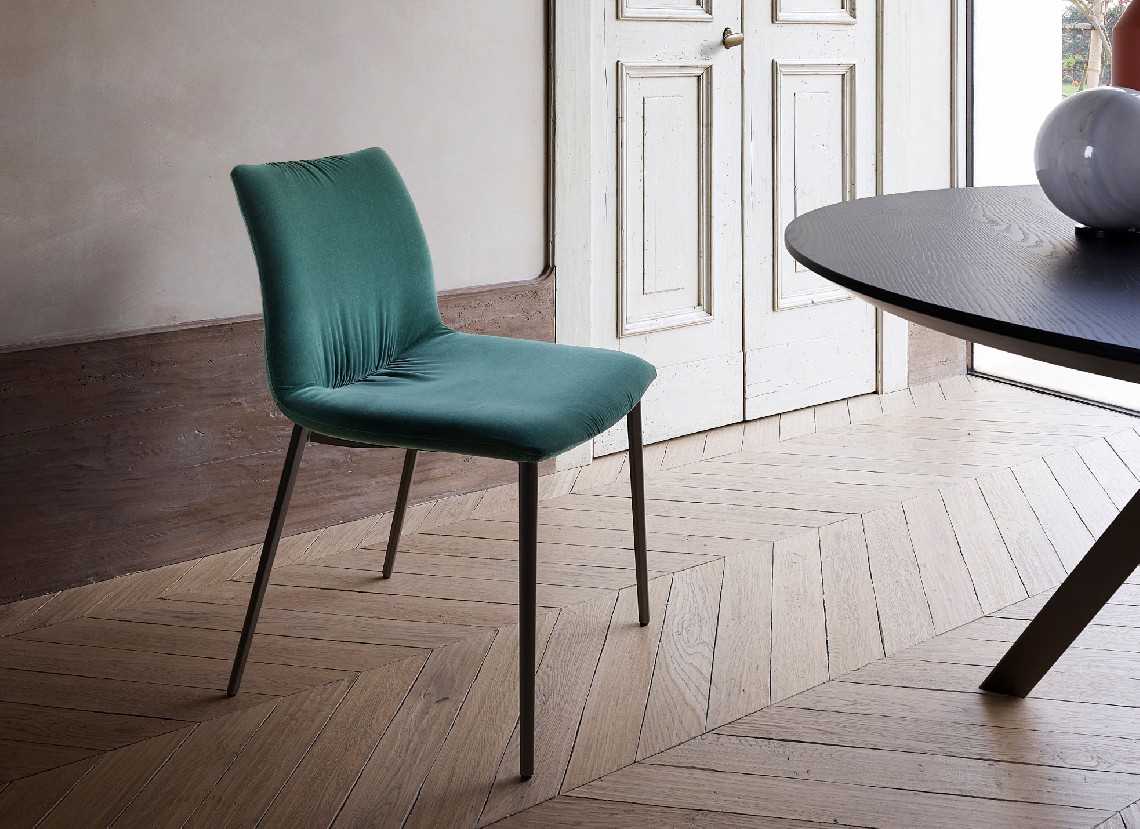Collection of chairs, easy chairs and stool with painted metal structure and soft seat available in leather, synthetic leather or velvet.