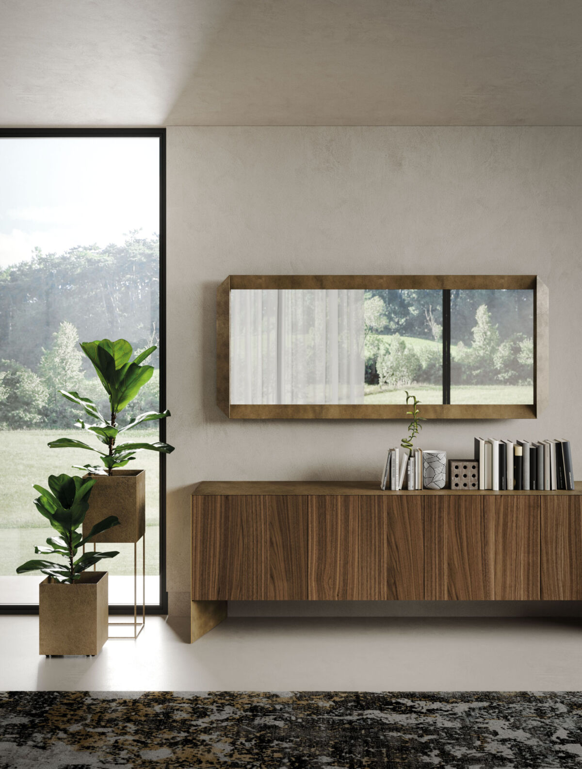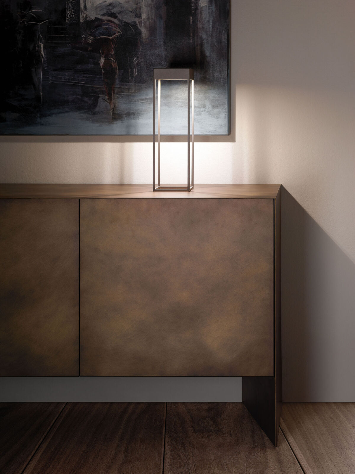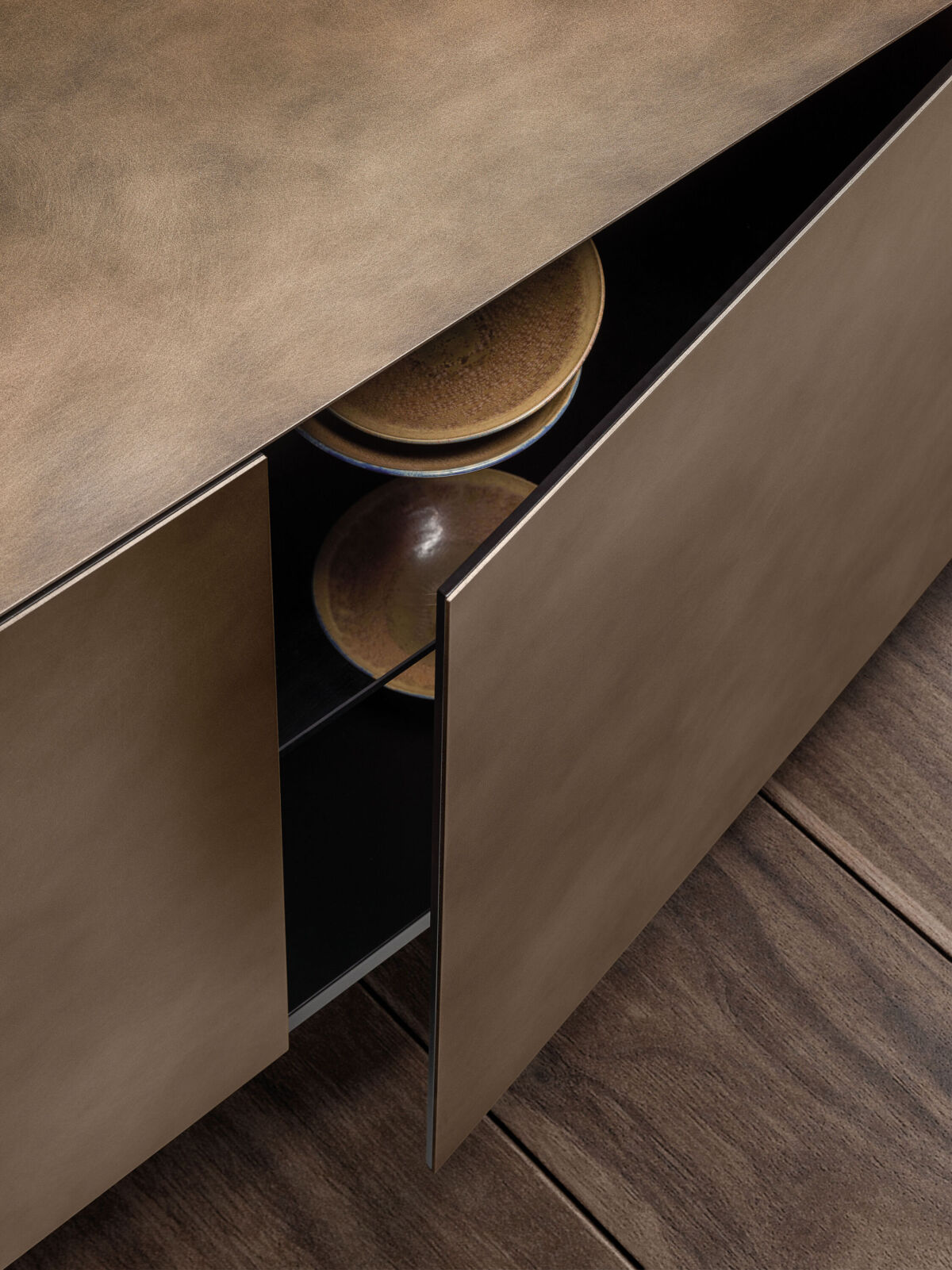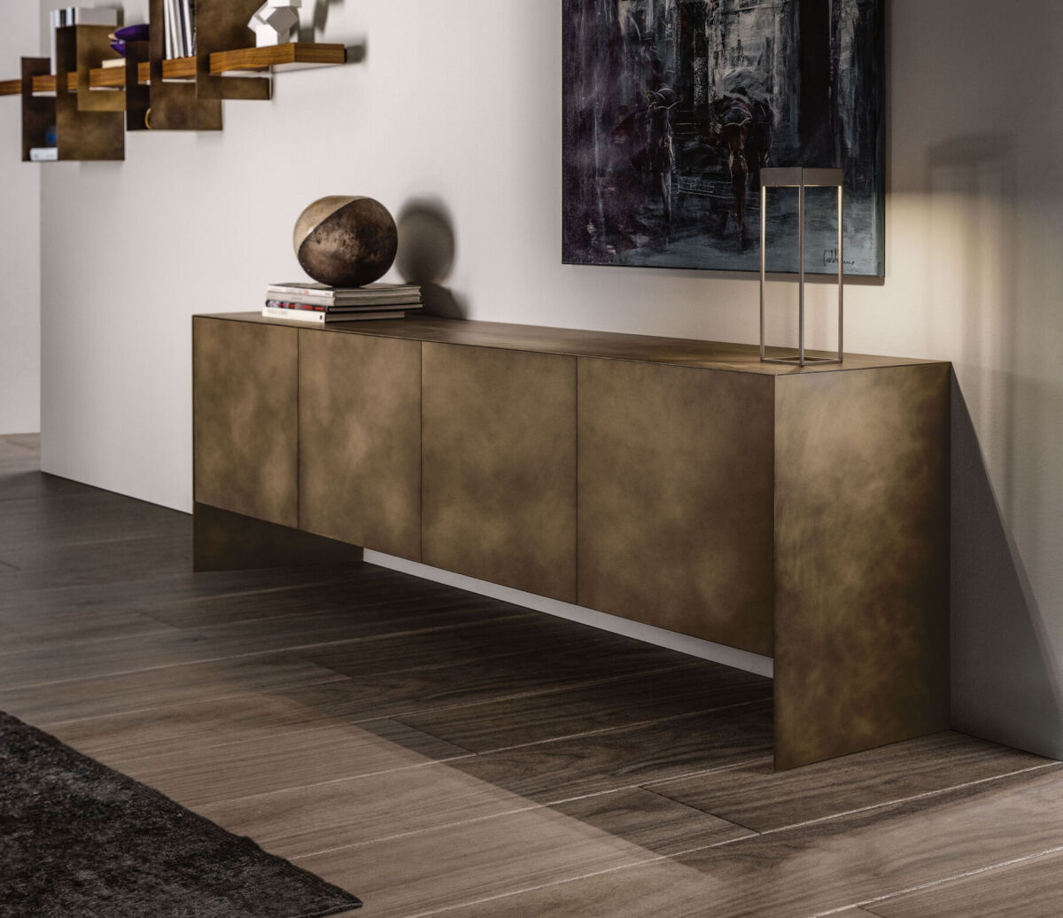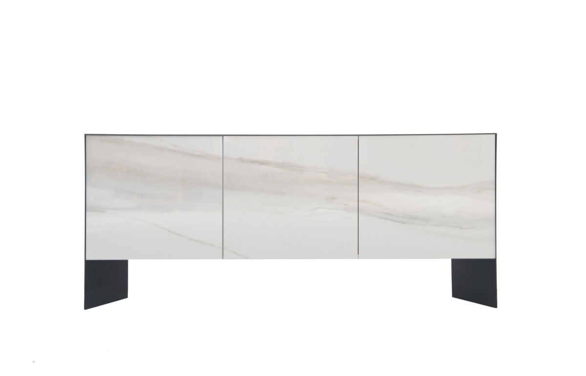 Sideboard with metal structure and doors available in wood, ceramics or metal. Black lacquered inner compartment with glass shelves.