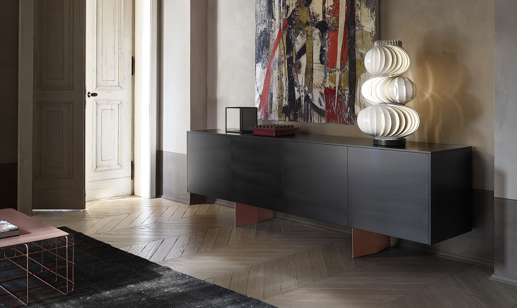 Sideboard with four or three doors made in wood, diamond shaped feet in painted metal.