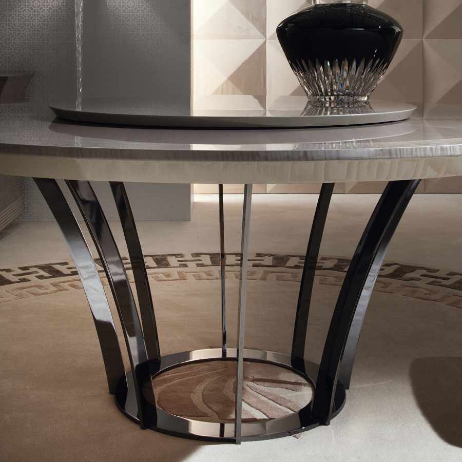 Round table in tiger African sycomore veneer with high gloss polyester finish. Fixed top with base in stainless steel in storm dark grey finish. White maple fine line inlay in the top.