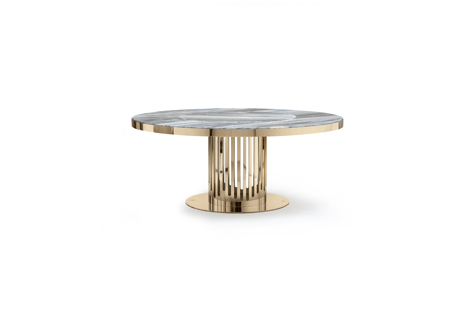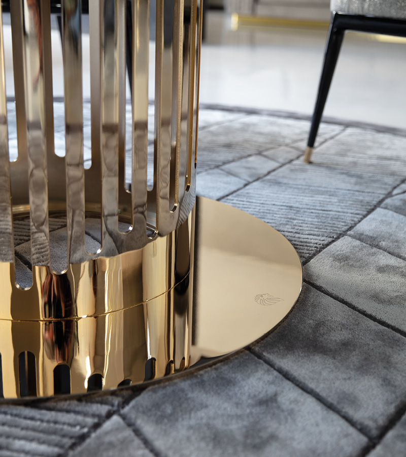 Round table in light gold chrome stainless steel with marble top. Giorgio Collection logo on the metal base.