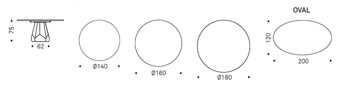 The Zermatt family of tables features a central base packed with corners and verticals. More precisely, it is formed of 15 sides that repeat around the central column with geometric precision. Each side of this prism appears to be a different colour, as light is reflected in varying intensity depending on the angle.