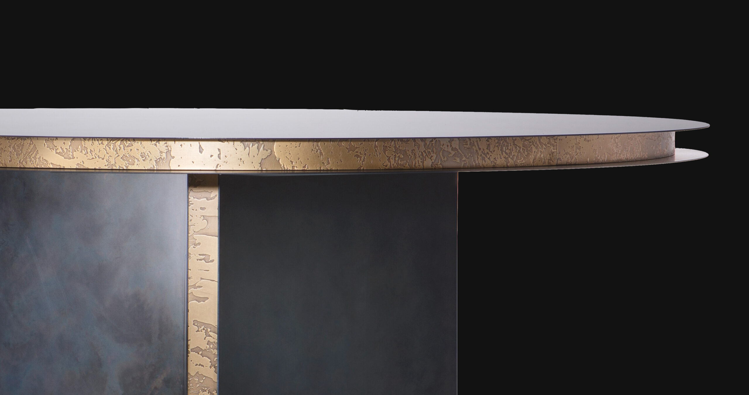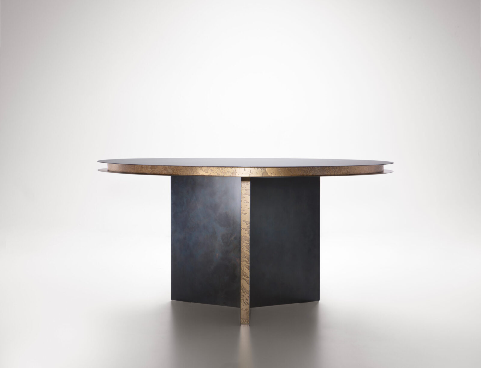 I volumi puri e precisi della collezione di tavoli Folio sono caratterizzati da una composizione di piani ortogonali realizzati in lastre di metallo. Le lastre equidistanti scandiscono la forma di Folio e generano un interessante gioco di ombre in contrasto con la luce riflettente del piano orizzontale. I tavoli sono disponibili con top tondo e rettangolare e la base di appoggio è attentamente studiata per garantire il giusto confort delle gambe, quando seduti.