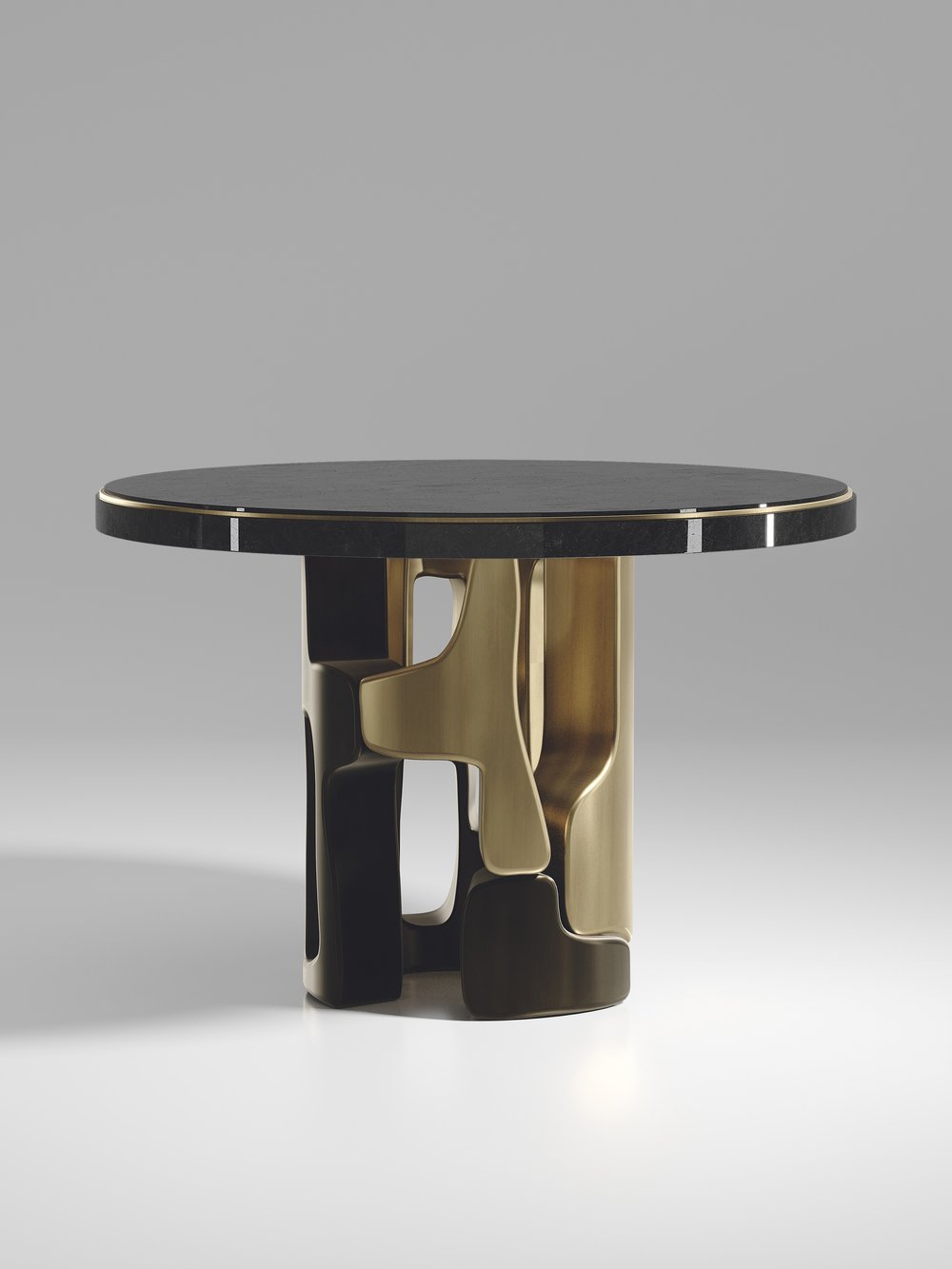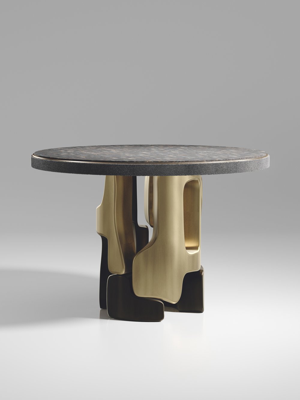 The Apoli Breakfast Table by Kifu Paris is both dramatic and organic its unique design. The tiger eye blue top sits on an ethereal geometric and sculptural bronze-patina brass base. The side band of the table is inlaid in black shagreen This piece is designed by Kifu Augousti the daughter of Ria and Yiouri Augousti. Part of the Apoli Capsule Series, see images of collection at end of slide.
