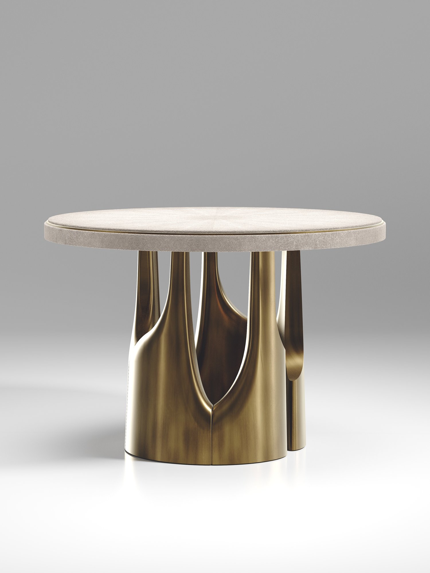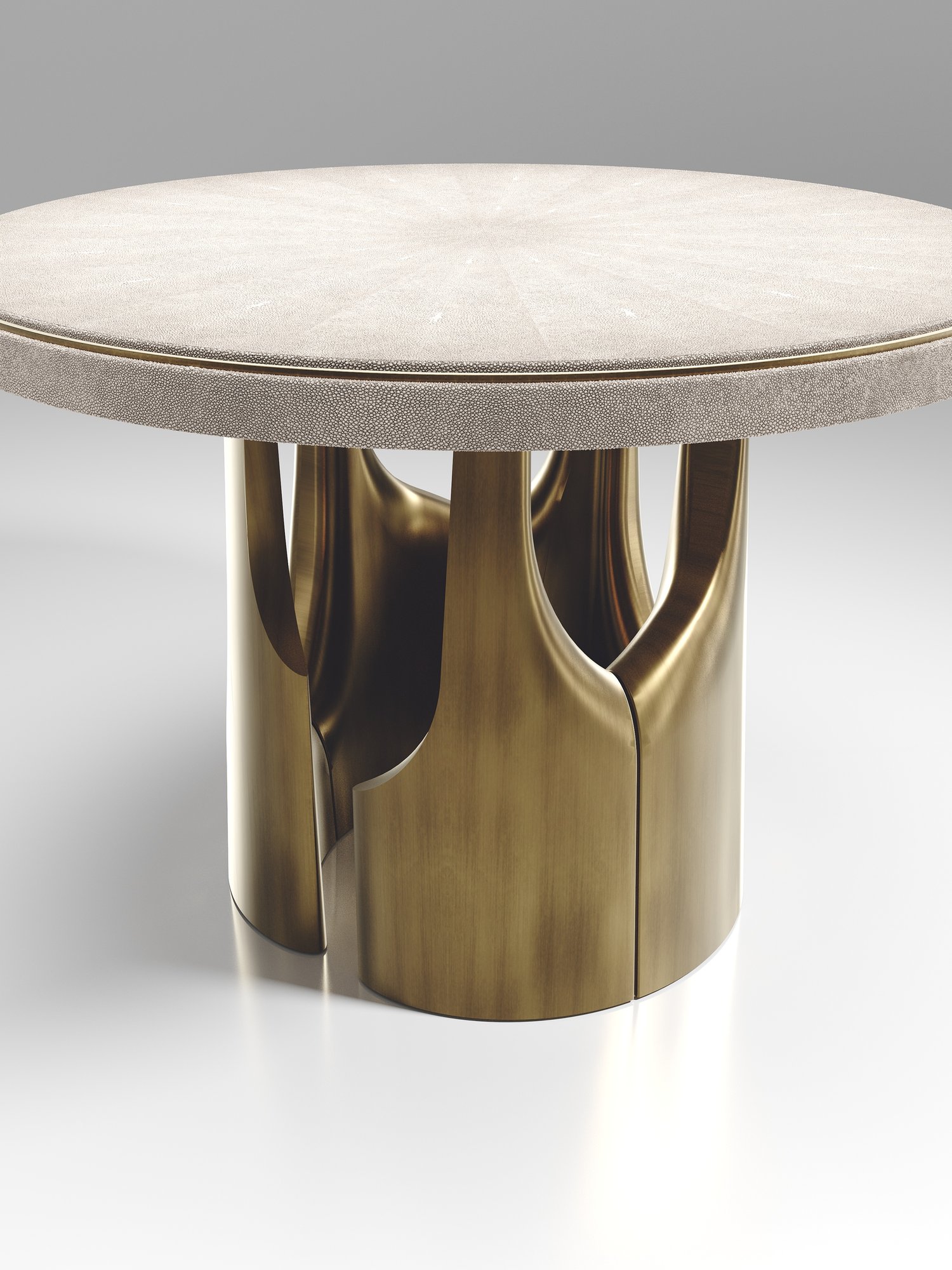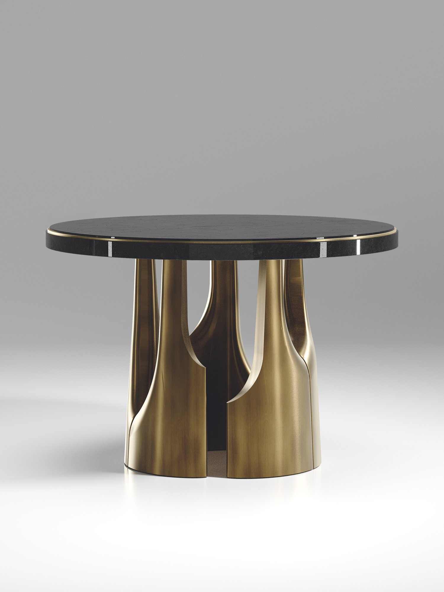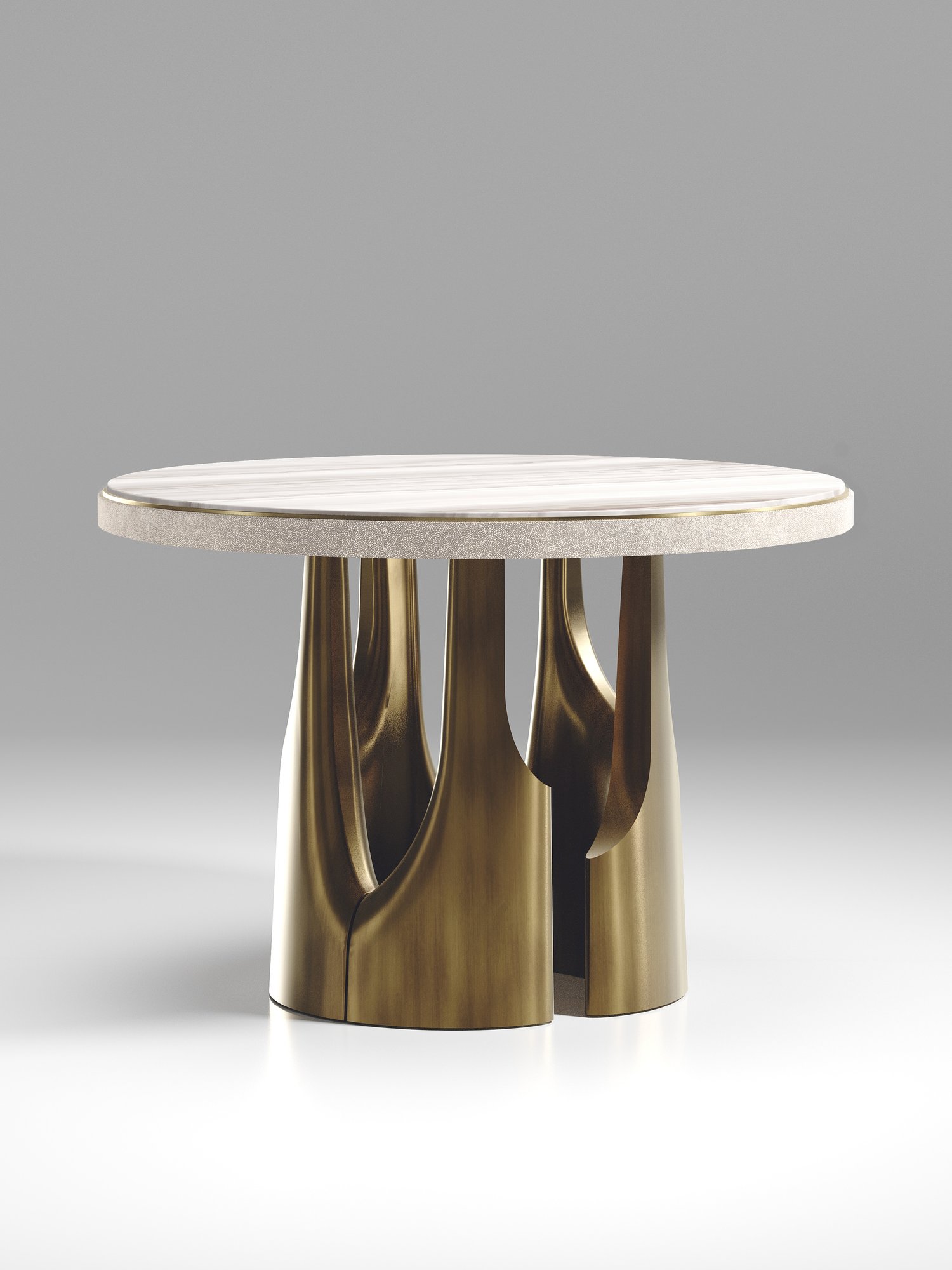 The Triptych Breakfast Table by R&Y Augousti is a stunning multi-faceted sculptural piece. The beautiful hand craved details on the bronze-patina base demonstrate the incredible artisan work of Augousti.