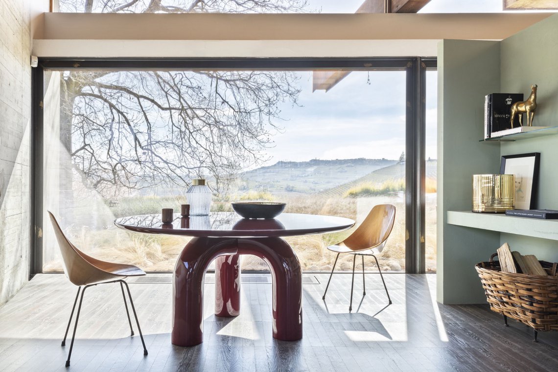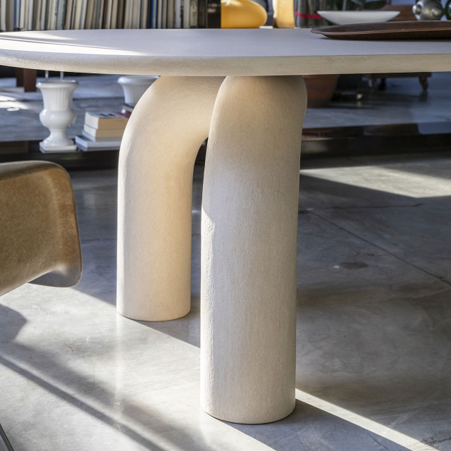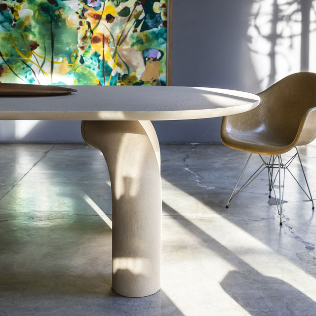 Dining table with a strong identity. Designed with a thickness that emphasizes and imposes its presence, evoking an elegant stability. Monumental and poetic. The soft curves of the legs give a pure and exclusive refinement that allow it to adapt harmoniously in different contexts, be they classic or contemporary.