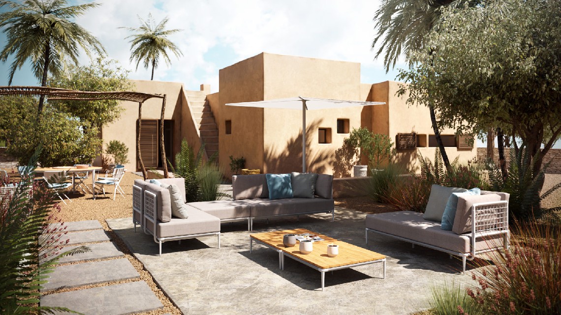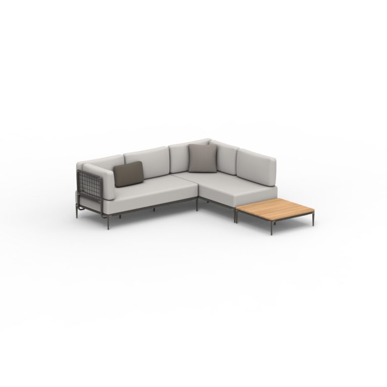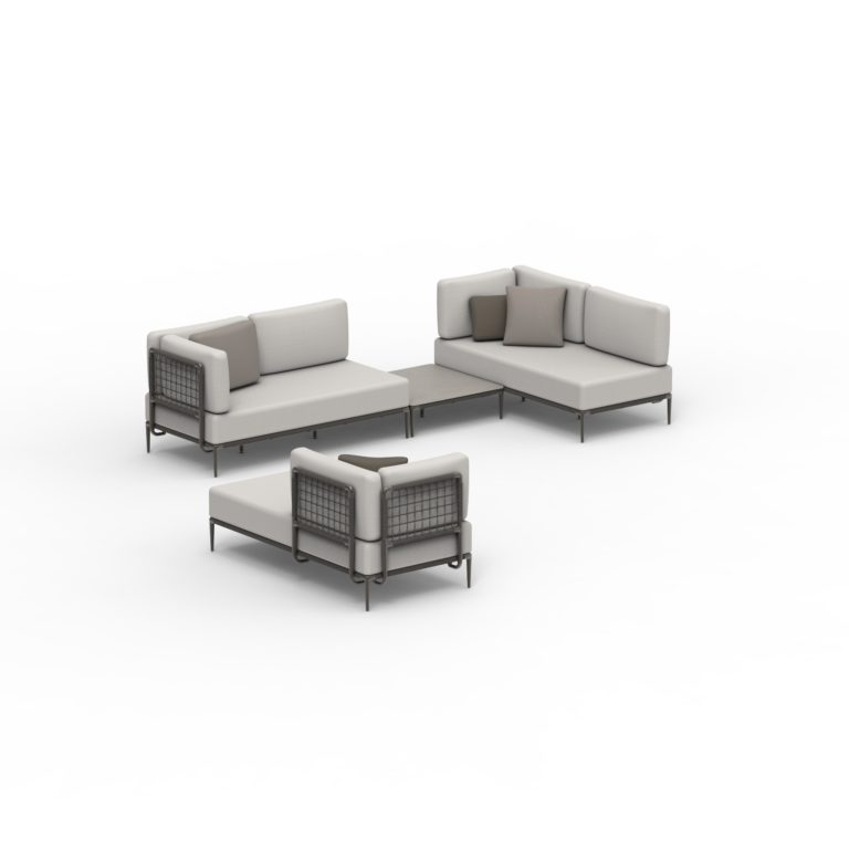 The Lusit modular lounge collection consists of ropes braided on powder-coated aluminium frames. This renders the seating and back into a supple grid, for added comfort. The backrests elements can simple be hooked onto the seating platforms, and the table tops can be placed onto the bases, where desired, to create the lay-out of your choice.