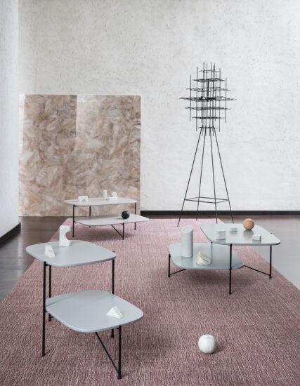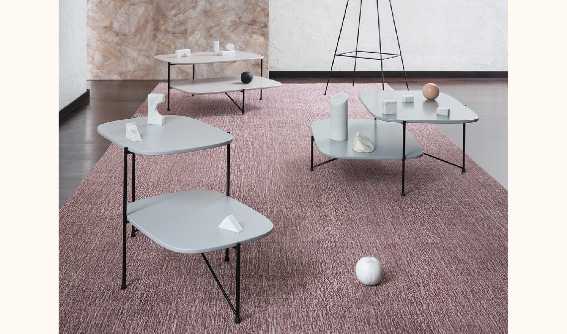 used in building construction that, in this particular context, is interpreted as a joint onto which the feet are attached perpendicularly. This style detail is reminiscent of 1950’s furniture design. The base of the table is painted finished metallic wire drawn and the top in marble.