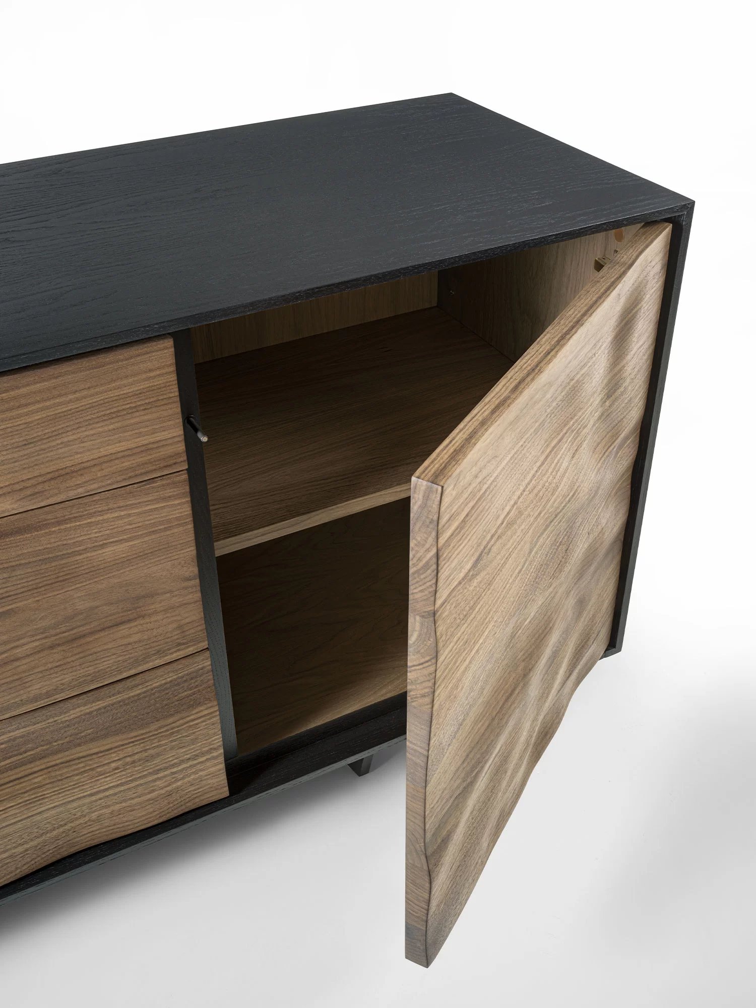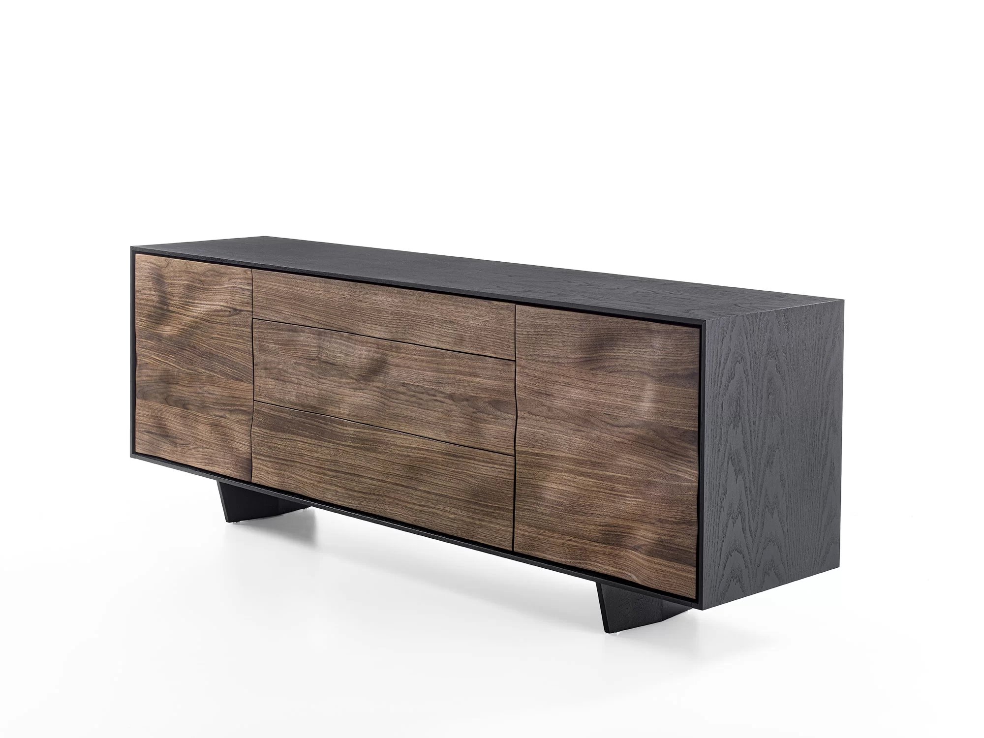 Credenza in legno massello e listellare, racchiusa da cornice in legno. La particolare lavorazione su ante e frontali dei cassetti crea un effetto scultoreo attraverso l’estroflessione del legno, donandole un movimento sinuoso.