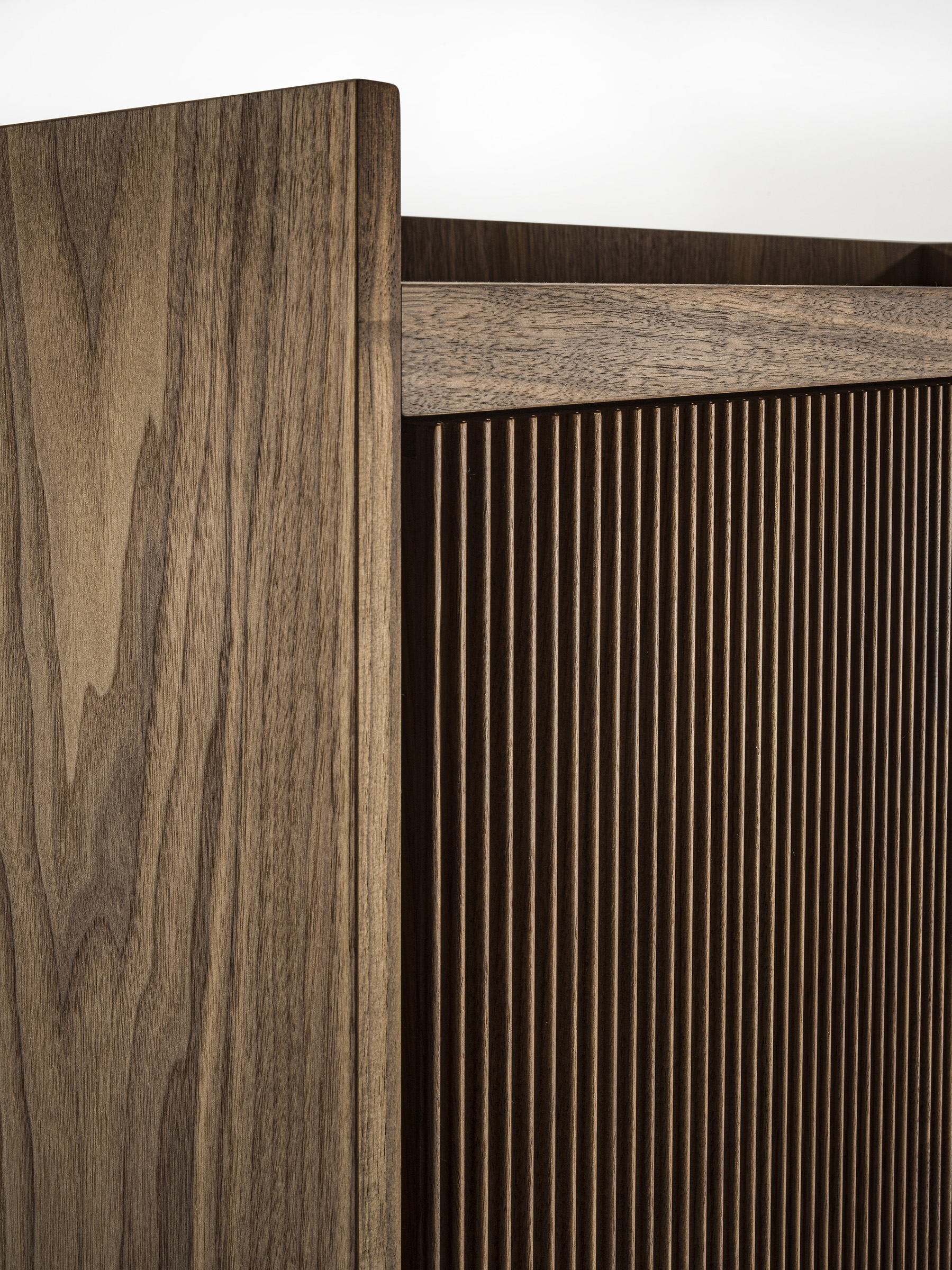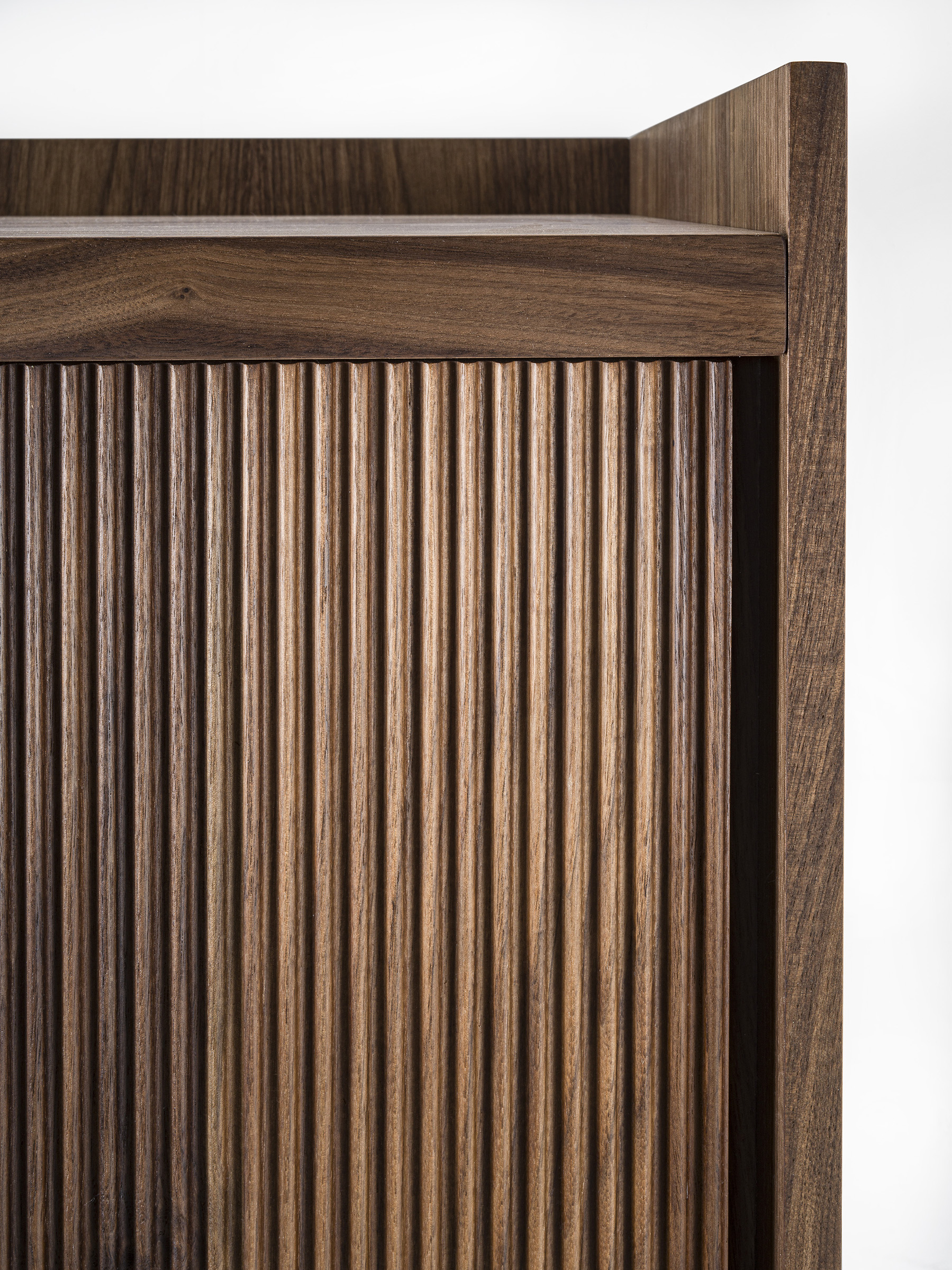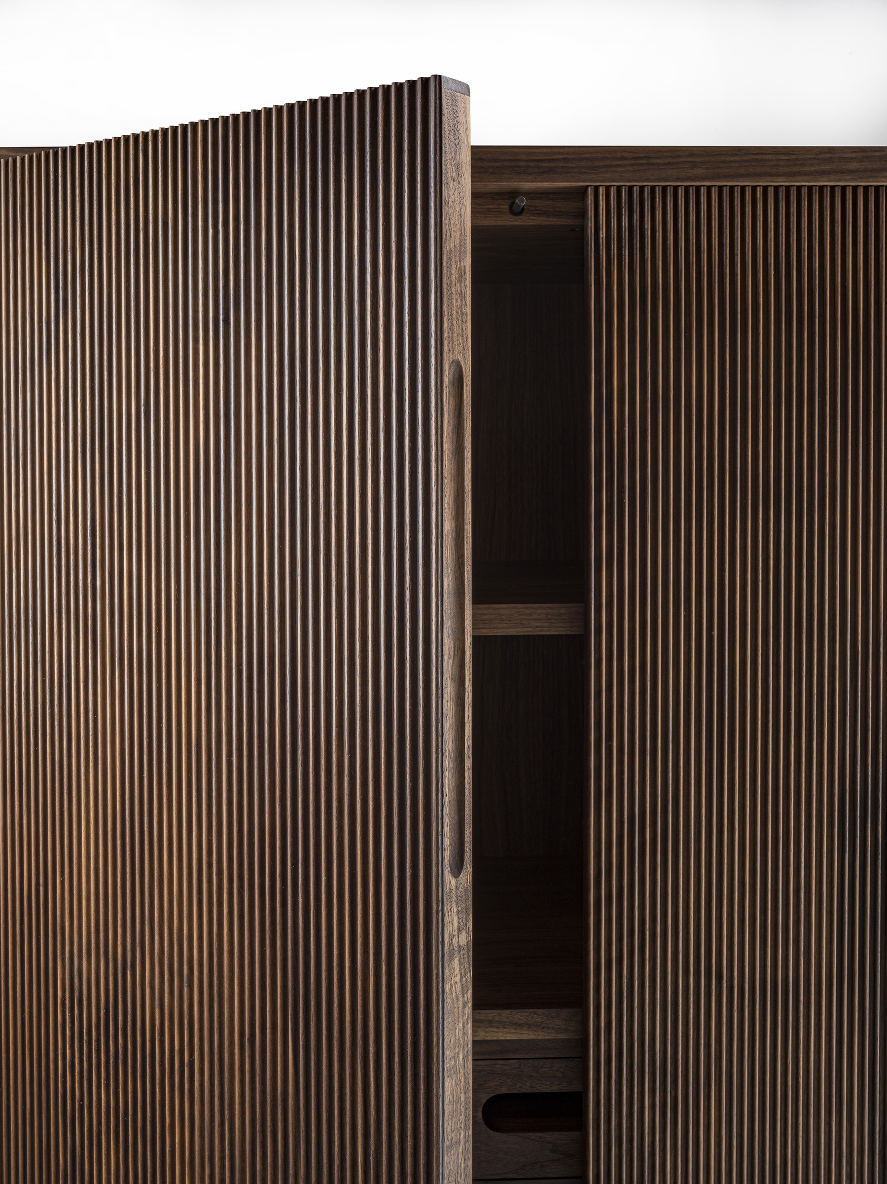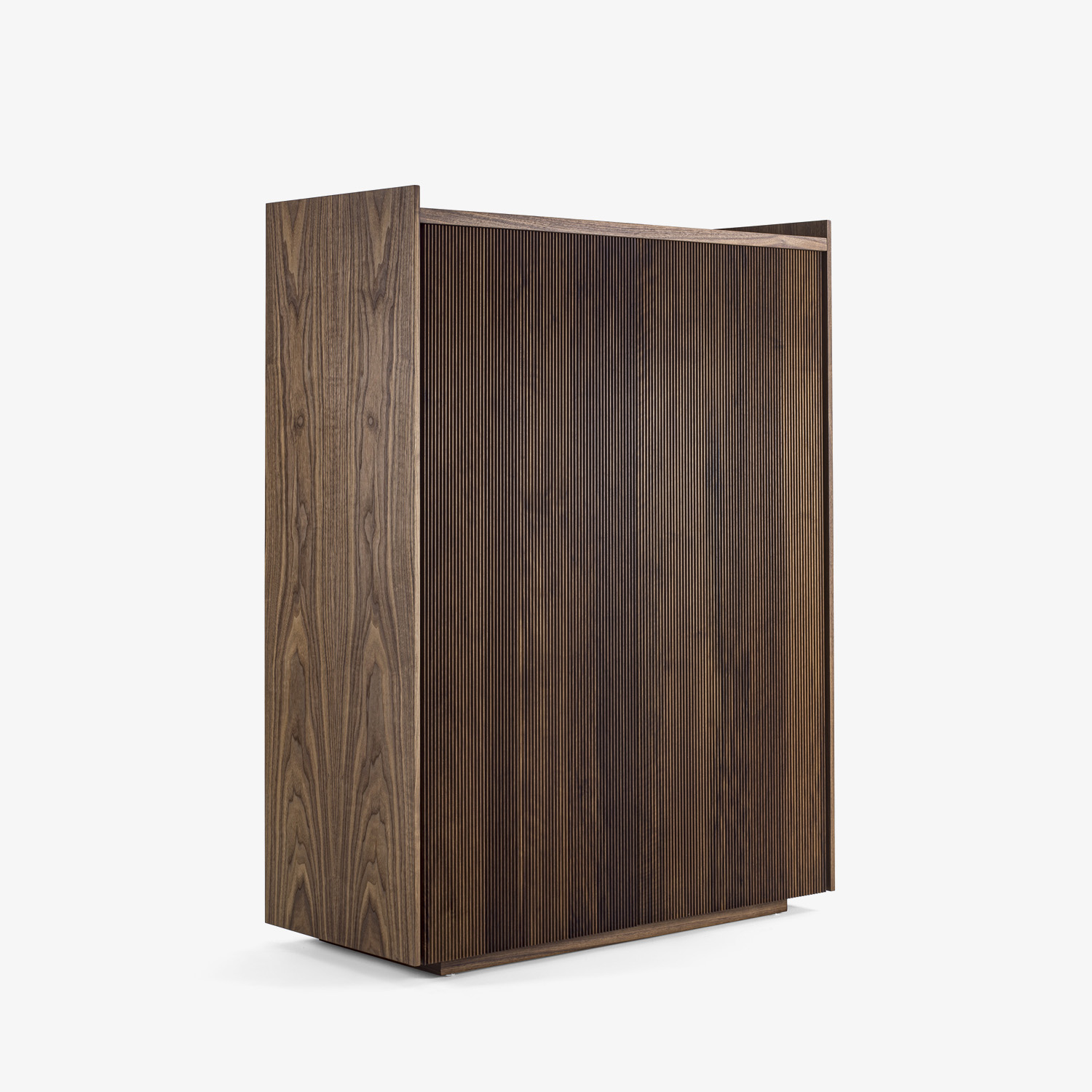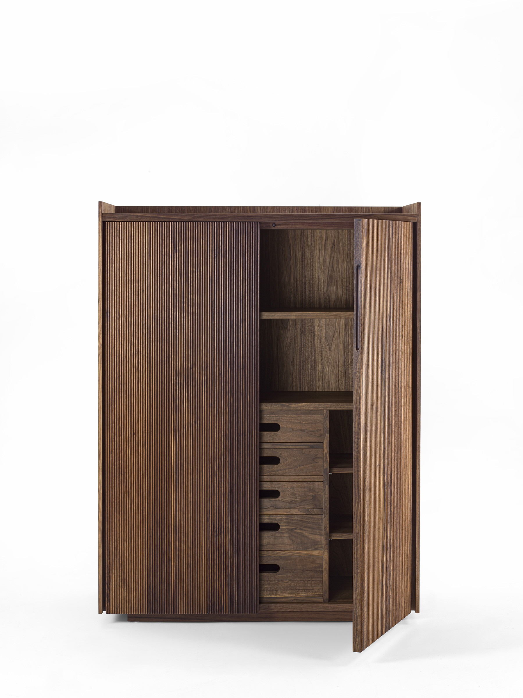 Credenza alta in legno massello e listellare, caratterizzata da una cornice che contiene il top, con all’interno ripiani e cassetti realizzati con tradizionale incastro a coda di rondine e maniglia fresata passante. Munita di due ante a battente con apertura push-pull; la particolare lavorazione verticale delle ante, Fresart, crea un effetto geometrico moderno e dinamico.
