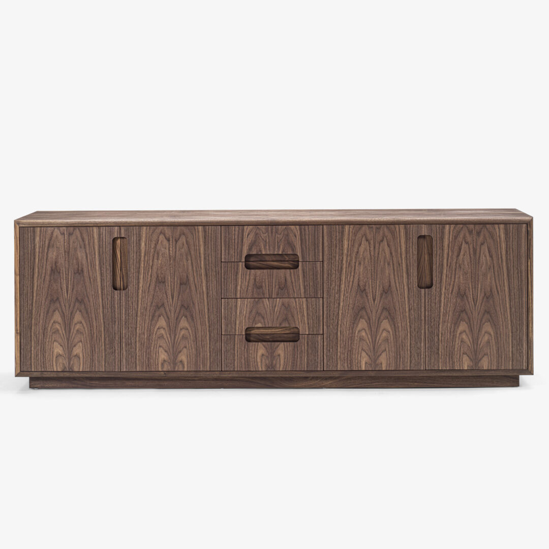 Credenza bassa in legno massello e listellare. Munita di quattro ante a battente e quattro cassetti con maniglia incassata e sagomata. Cassetti assemblati con incastri a coda di rondine. Struttura con bordi stondati.