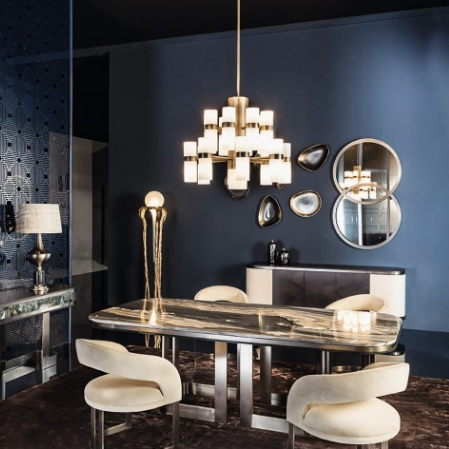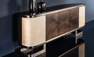 Credenza in essenza palissandro opaco o tabacco opaco, 2 ante in pelle, 3 ante in essenza, 1 cassetto, 4 ripiani, gambe e dettagli in acciaio spazzolato o finitura effetto satinato opaco.