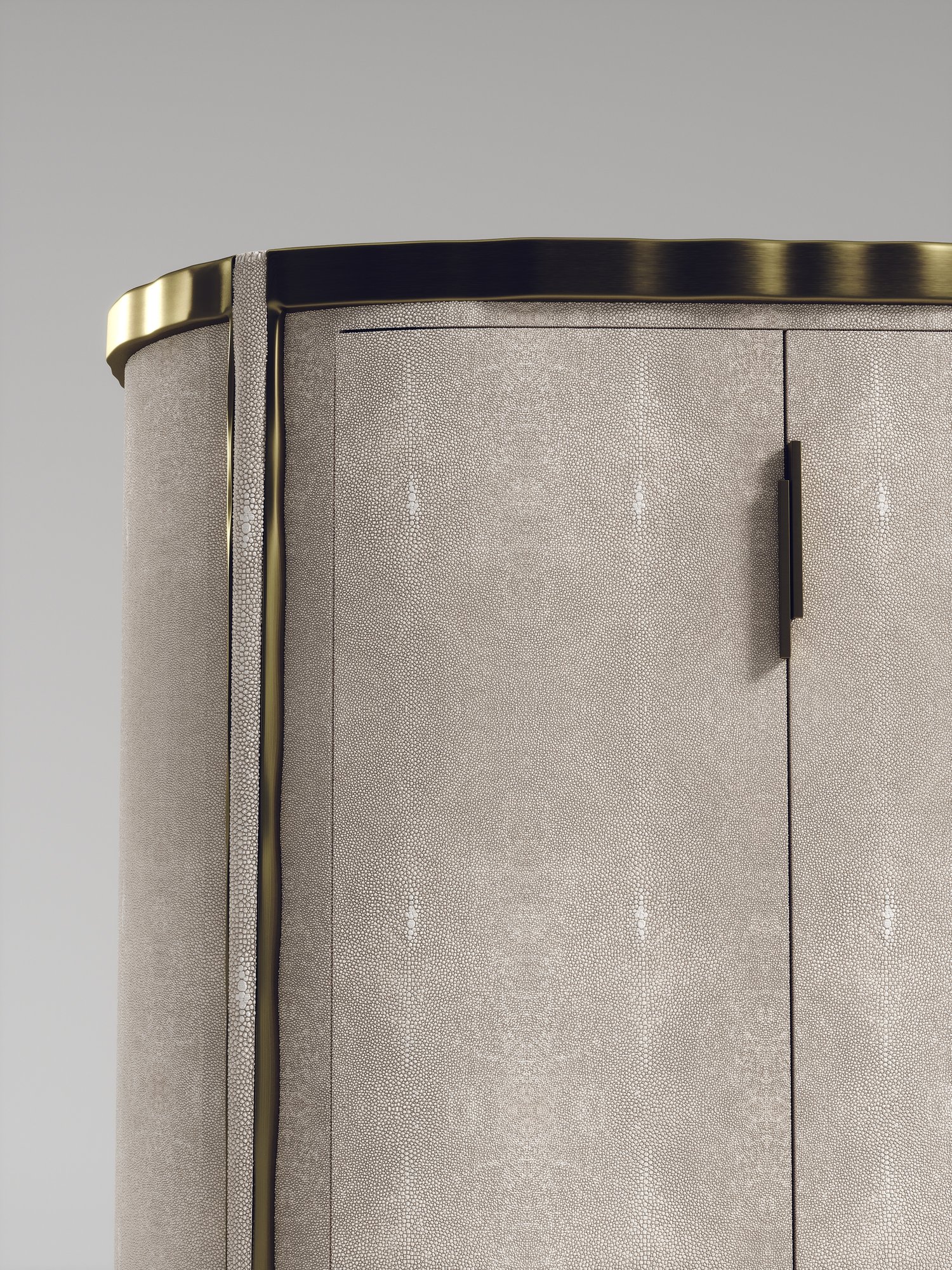 The Melting Buffet by R&Y Augousti is an elegant piece for any space. The cream shagreen inlaid piece is classic, but accentuated by their signature organic melting bronze-patina brass frame. This credenza includes 4 doors that opens up to 3 shelves. This piece is part of the Melting Capsule. Available in other finishes.