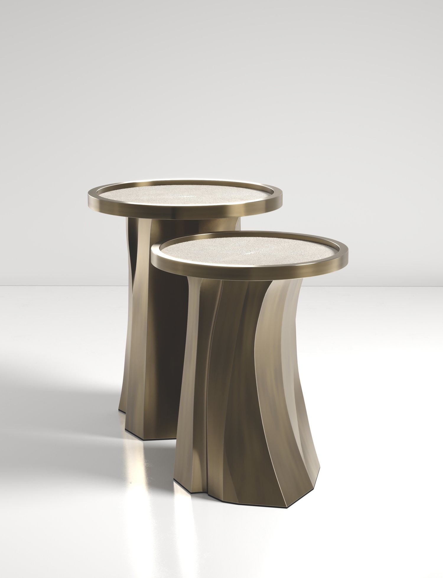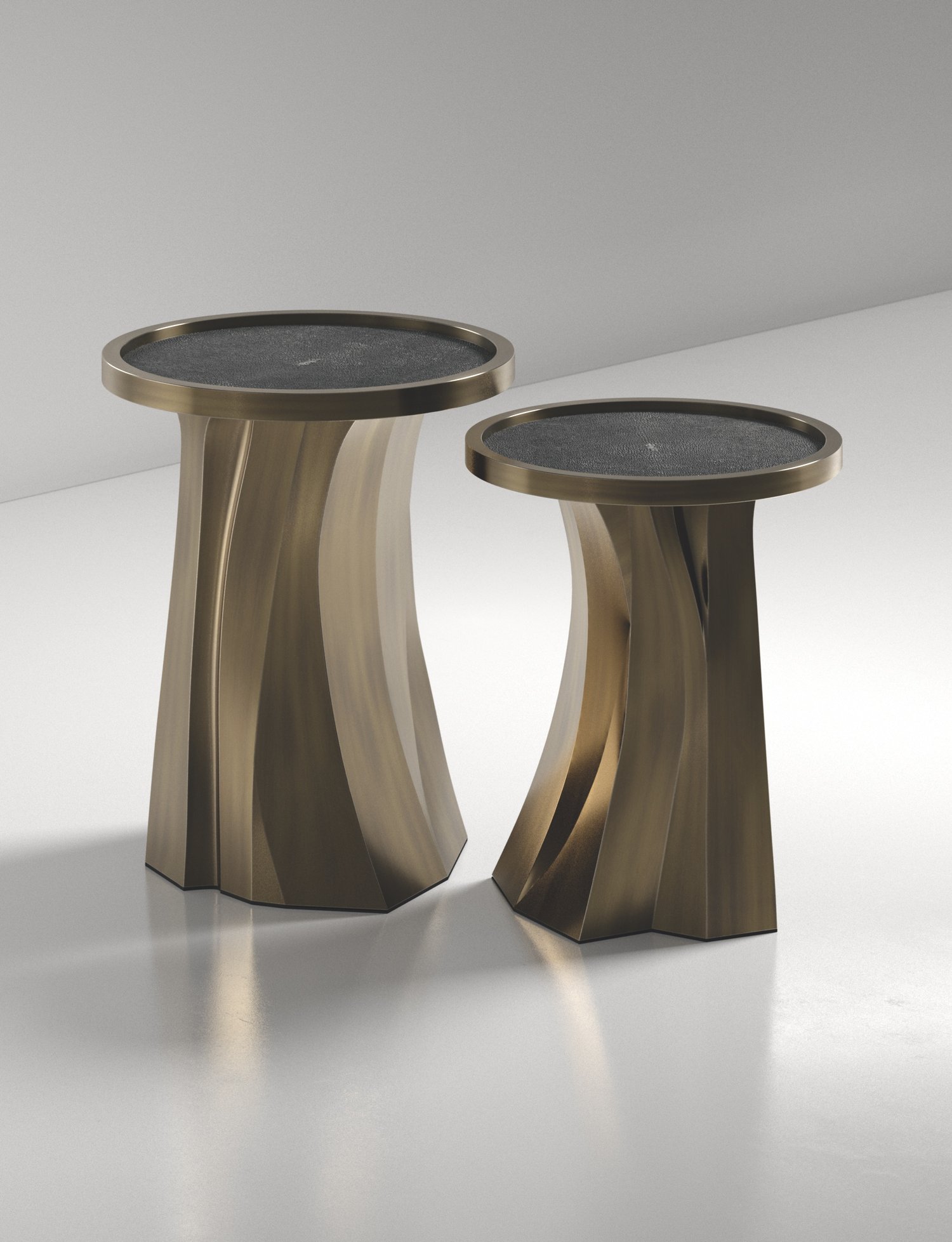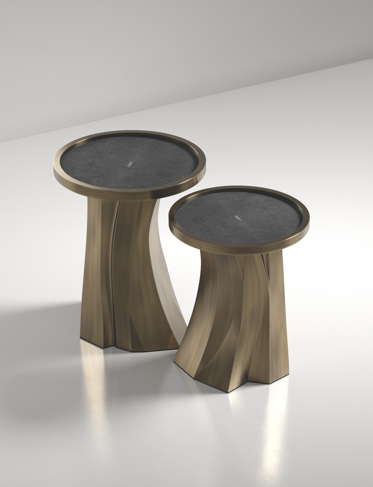 The Alma Nesting Tables by R&Y Augousti are sculptural and versatile pieces. The shagreen inlaid top morphs into a dramatic hand-carved bronze-patina base. The grooves and details on the base allow the tables to have different expressions from all angles.