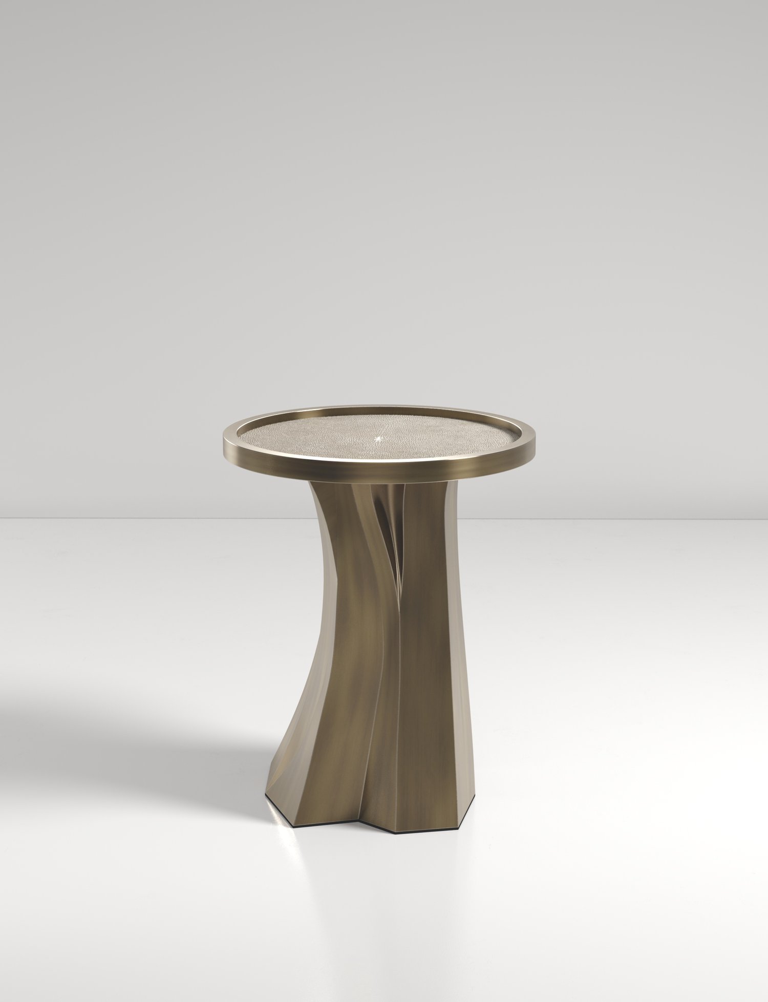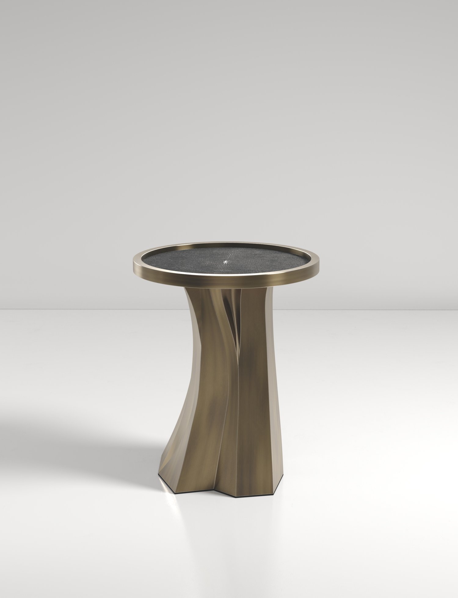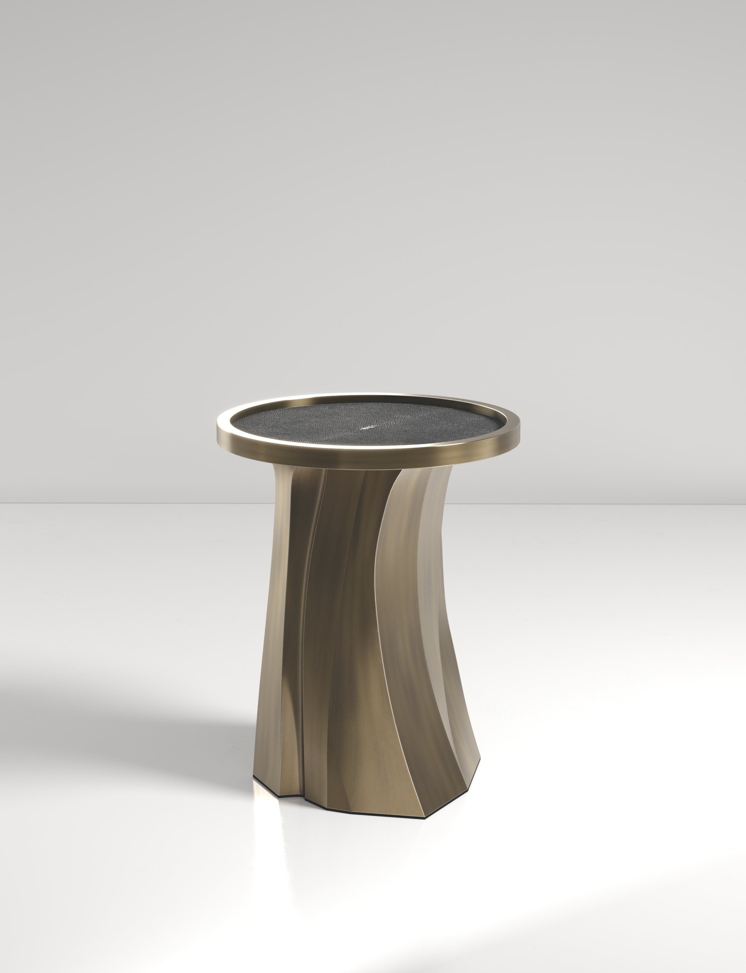 The Alma Nesting Tables by R&Y Augousti are sculptural and versatile pieces. The shagreen inlaid top morphs into a dramatic hand-carved bronze-patina base. The grooves and details on the base allow the tables to have different expressions from all angles.