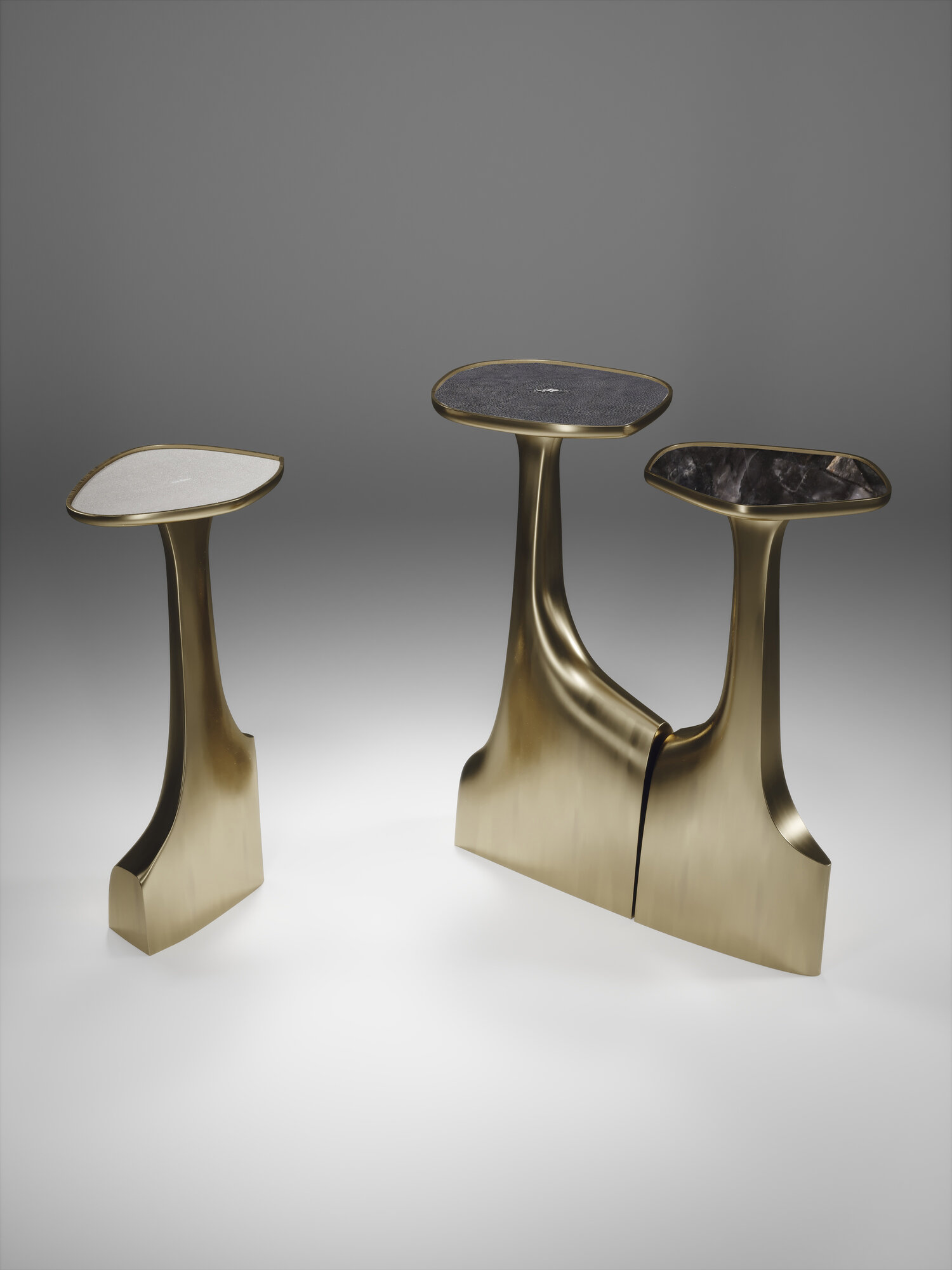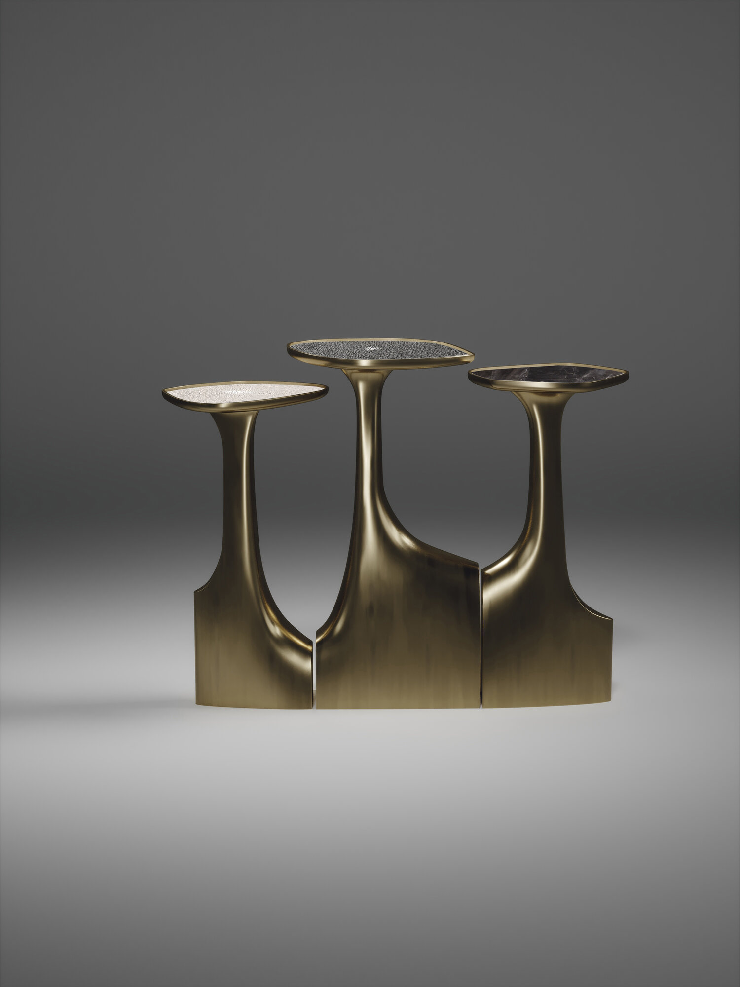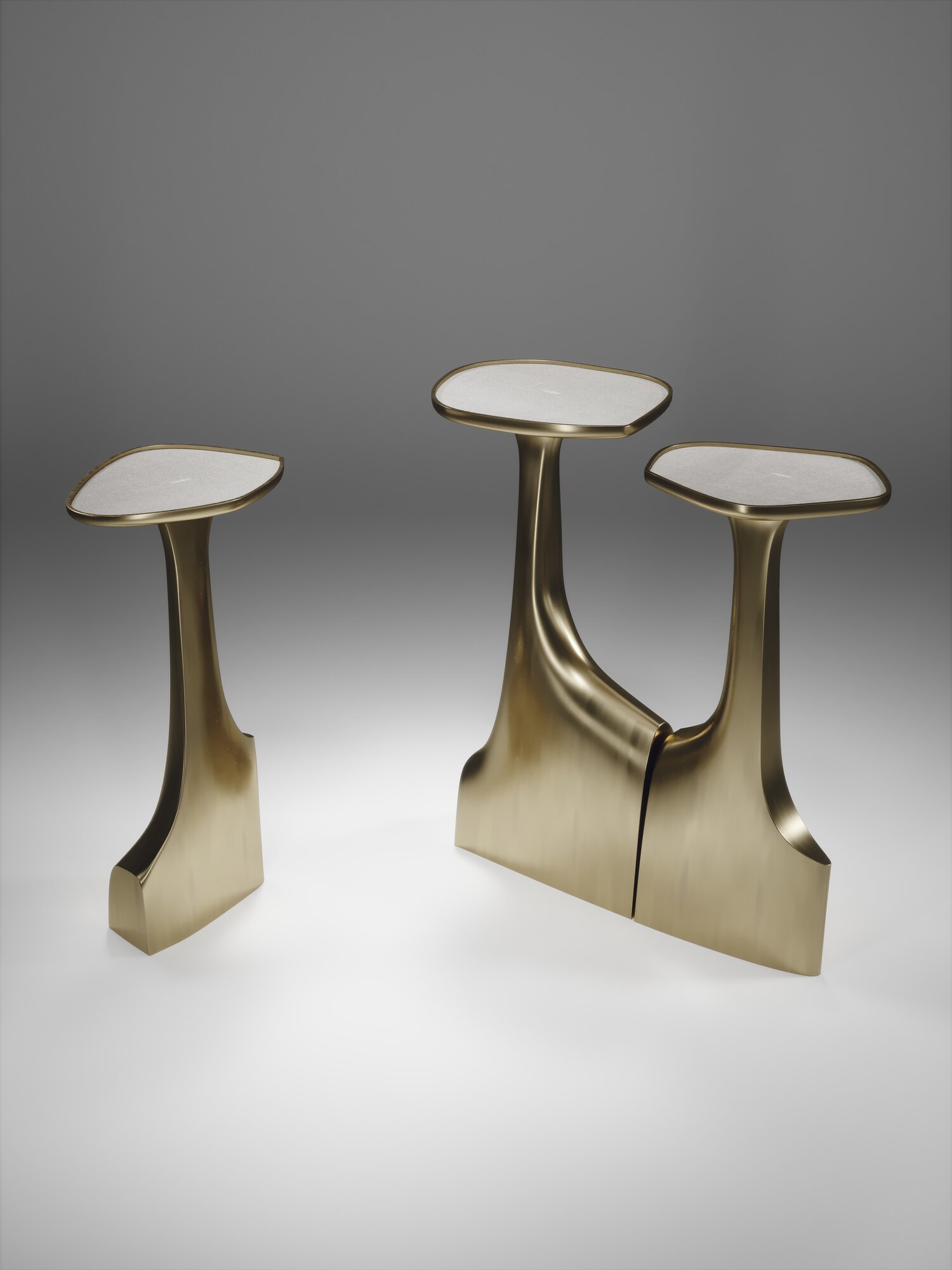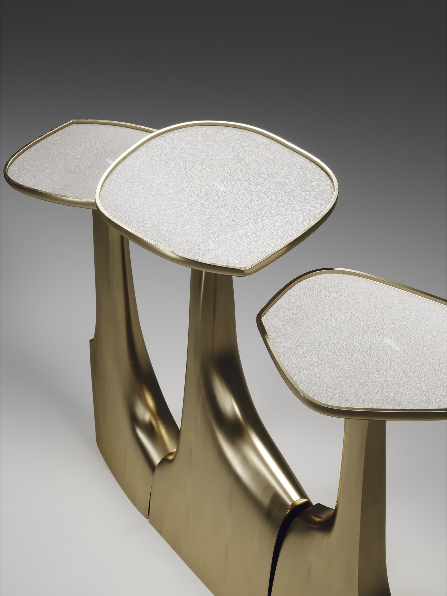 The triptych shagreen side tables by R & Y Augousti are multifaceted sculptural pieces. The beautiful hand craved details on the bronze-patina base can join up to each piece differently to create different compositions for your interior. The tops are slightly inset and are inlaid in cream shagreen.