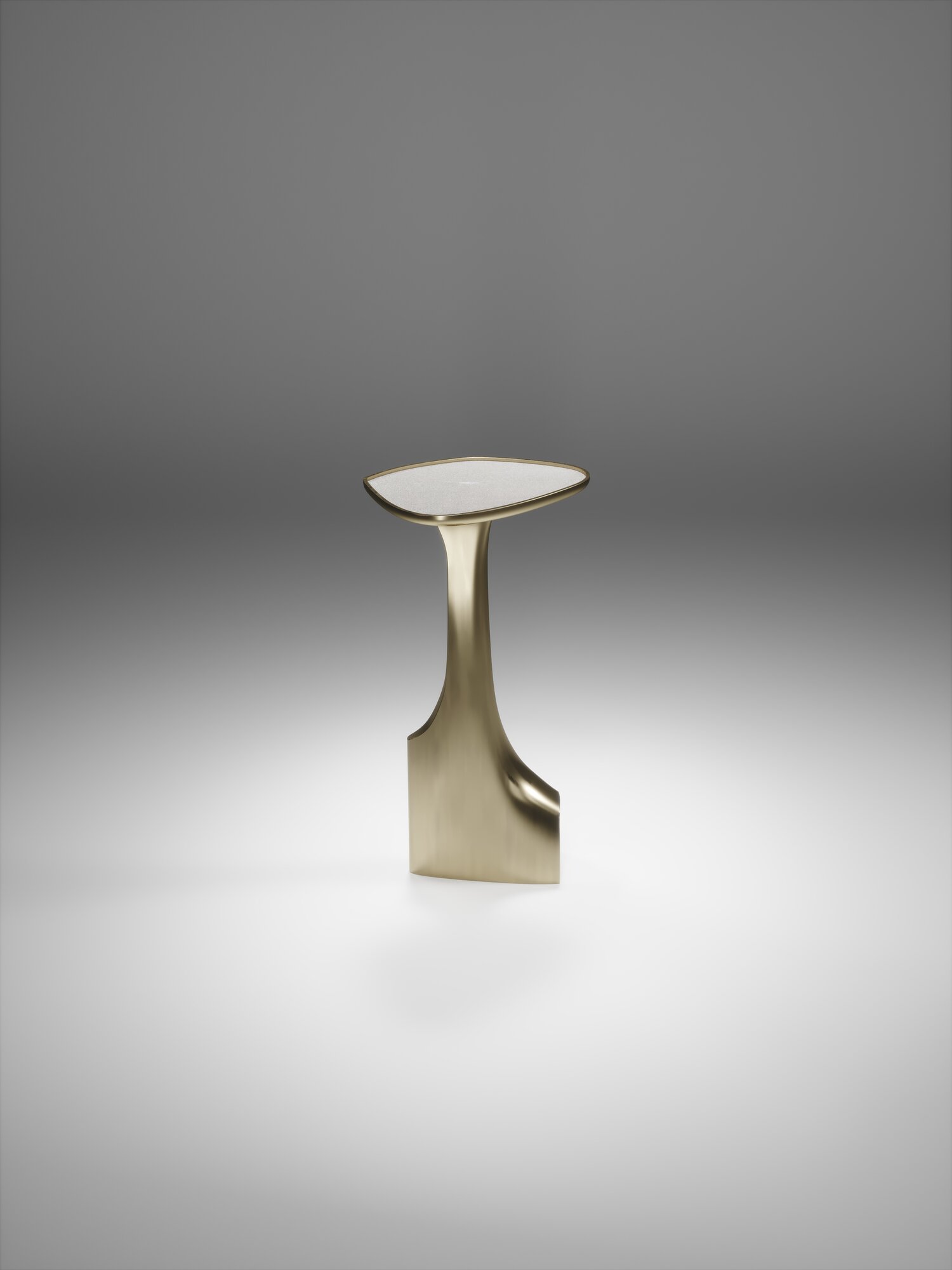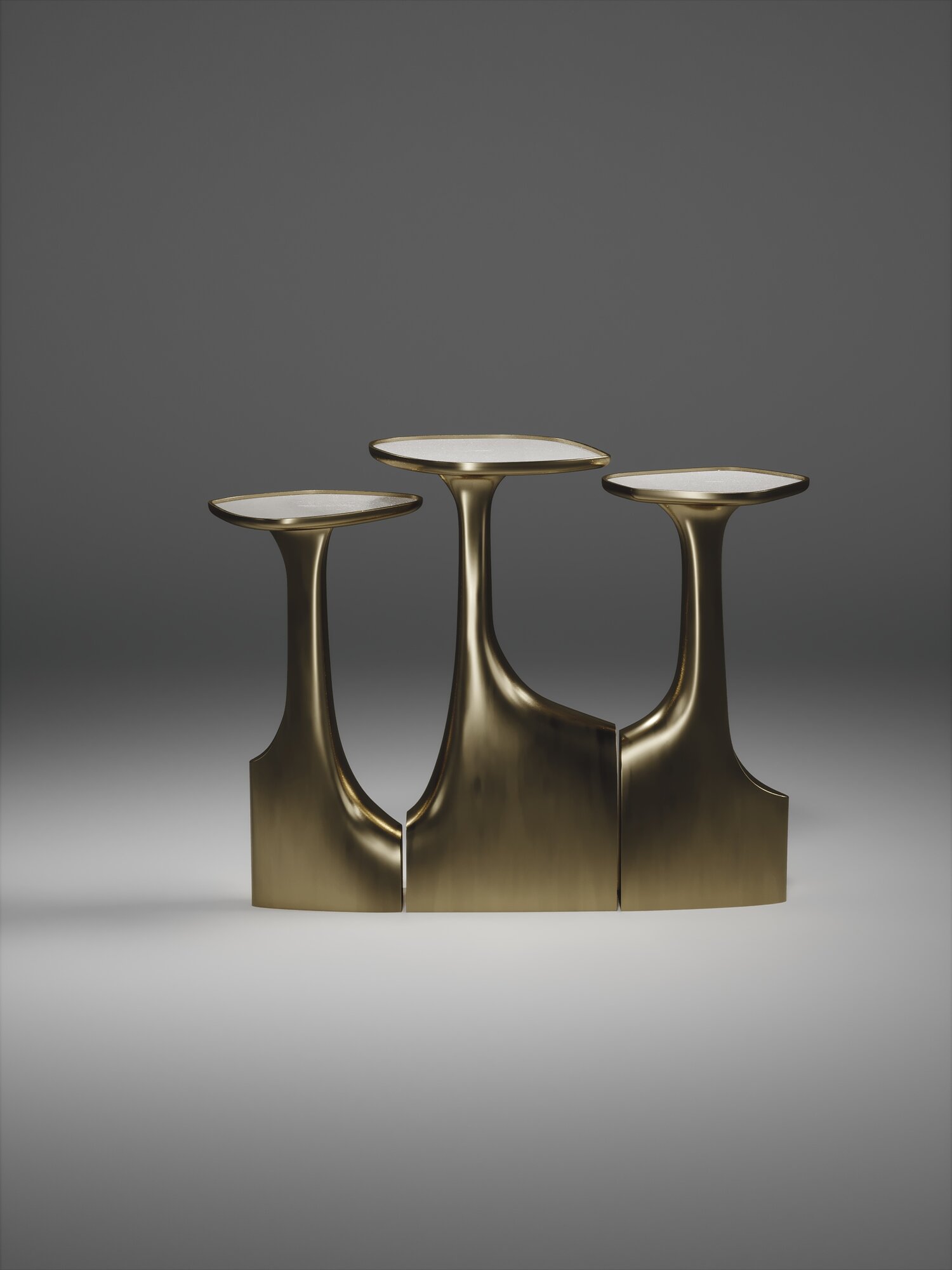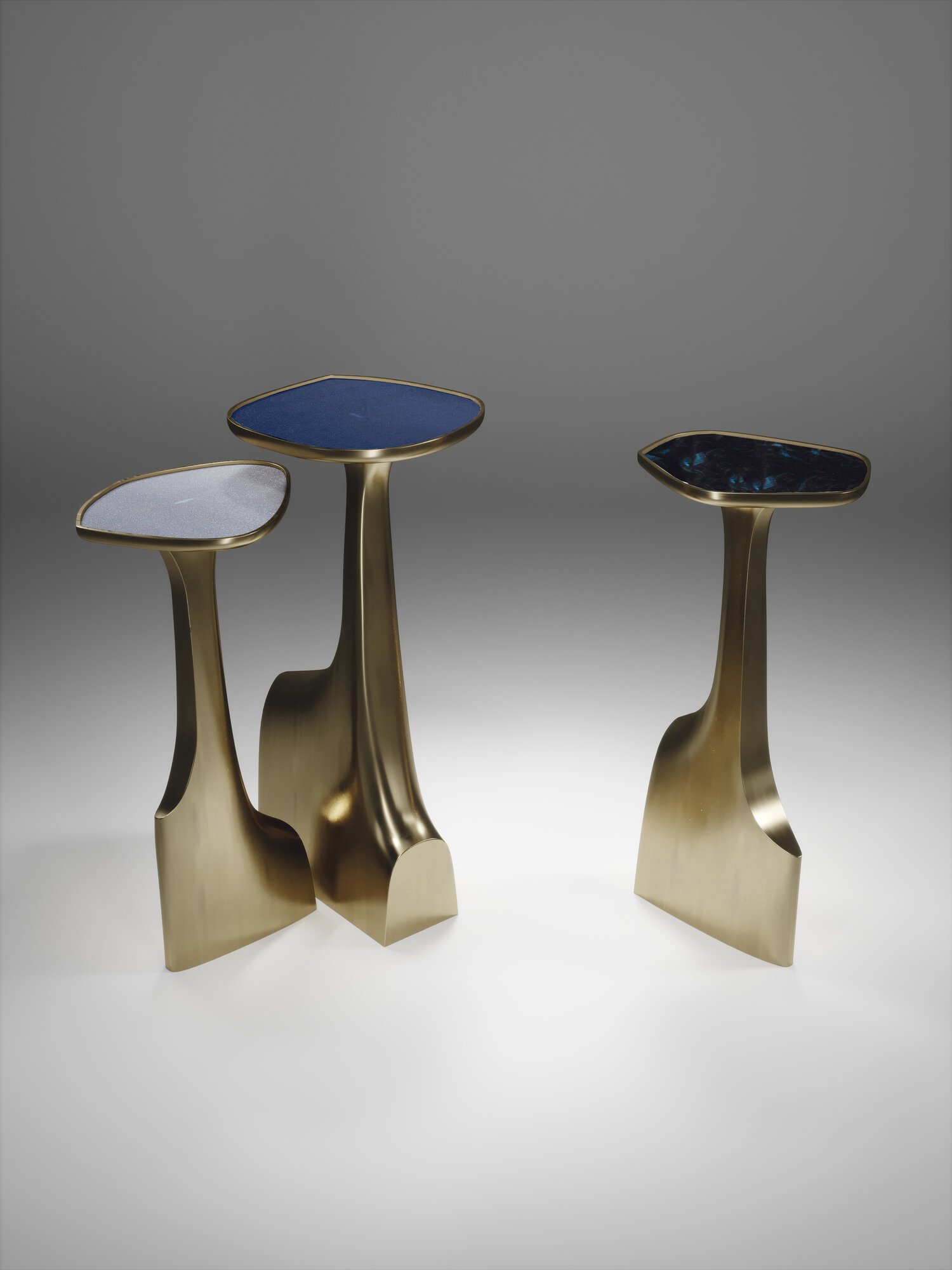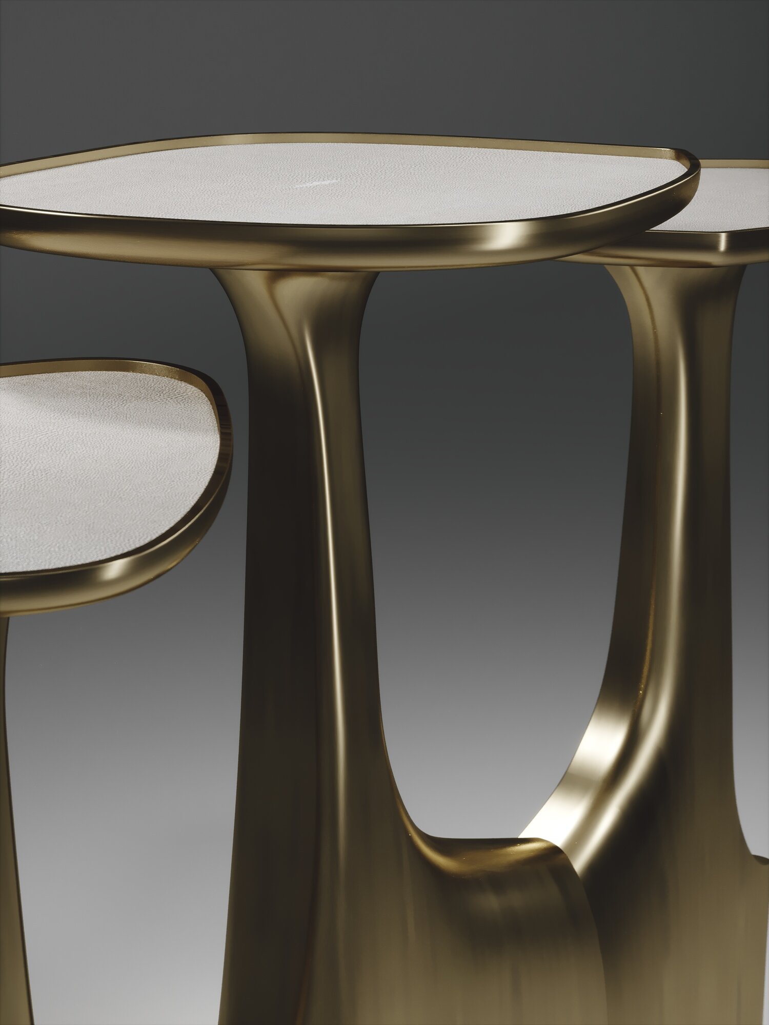 The triptych shagreen side tables by R & Y Augousti are multifaceted sculptural pieces. The beautiful hand craved details on the bronze-patina base can join up to each piece differently to create different compositions for your interior. The tops are slightly inset and are inlaid in cream shagreen.