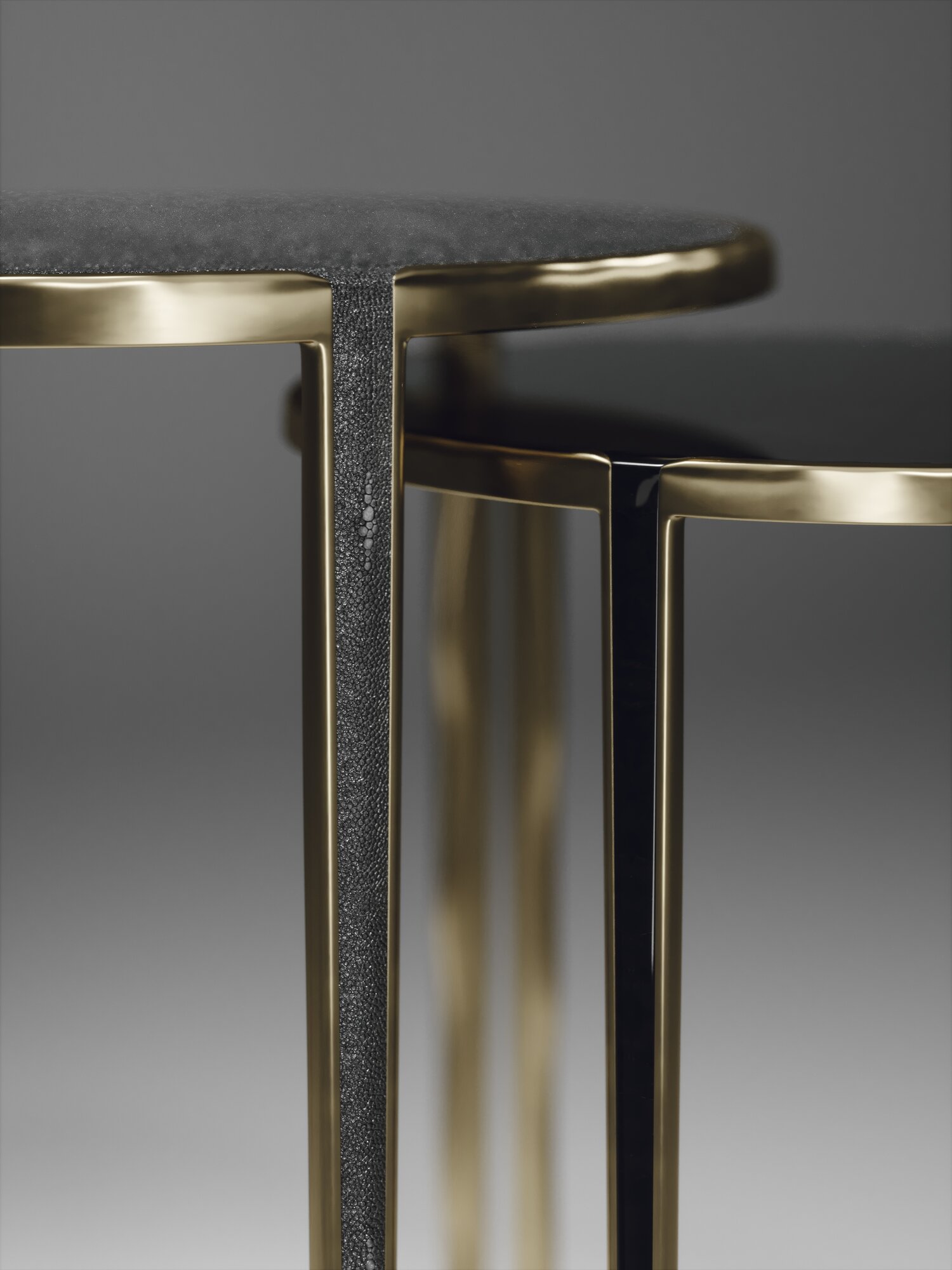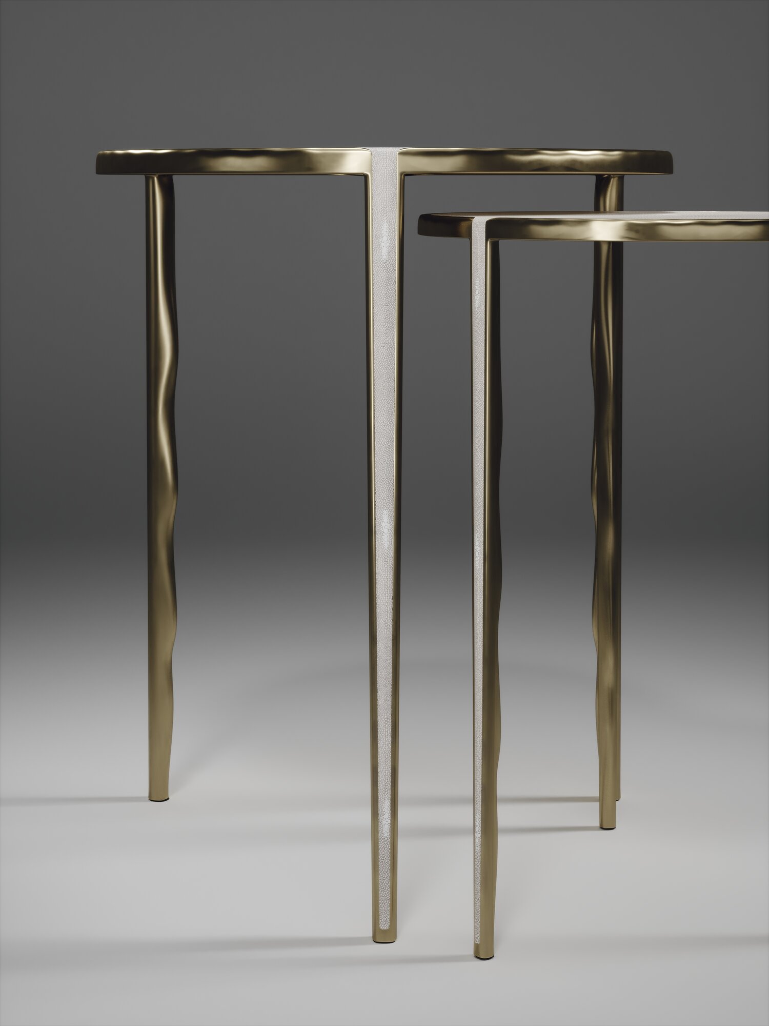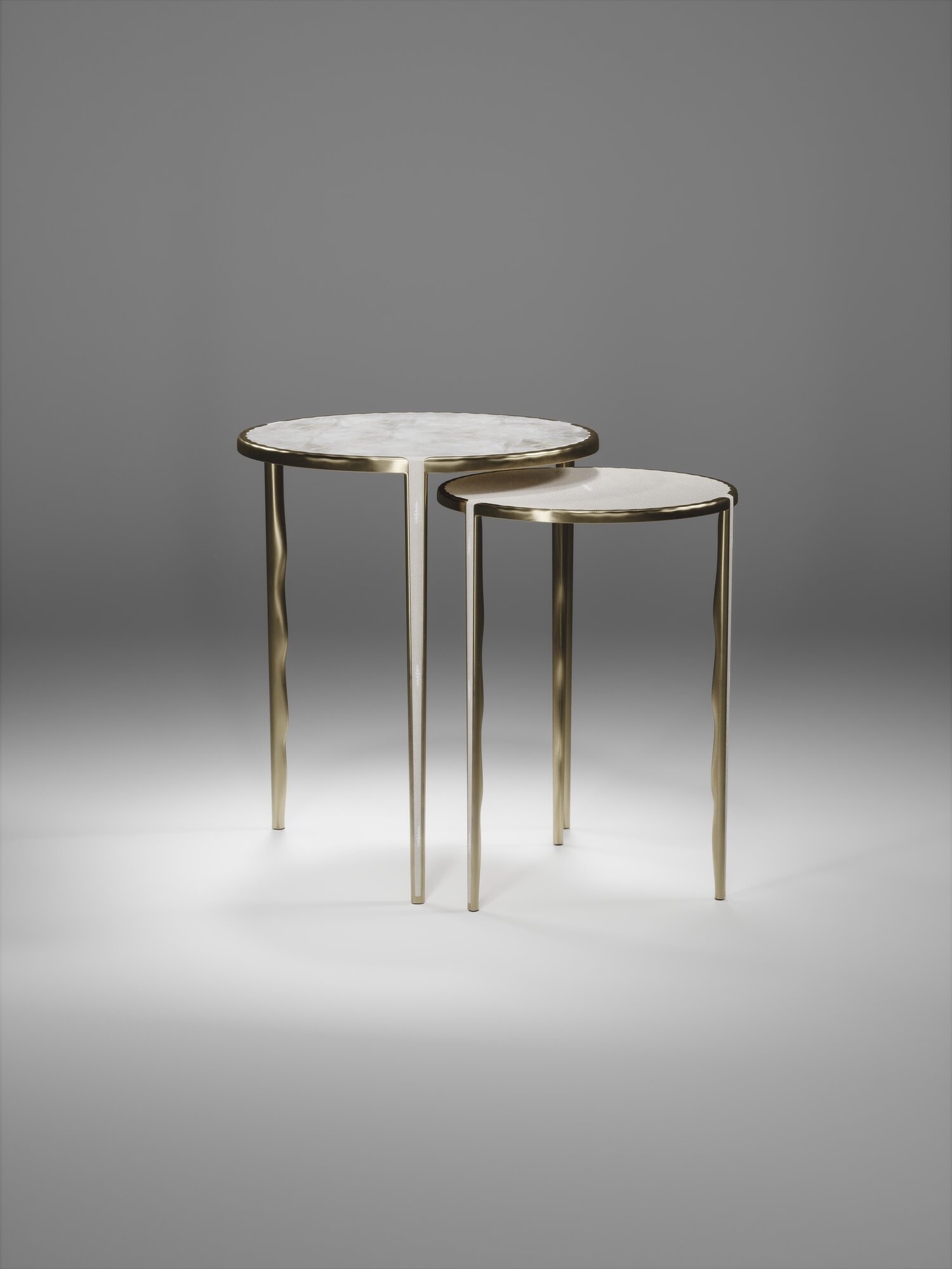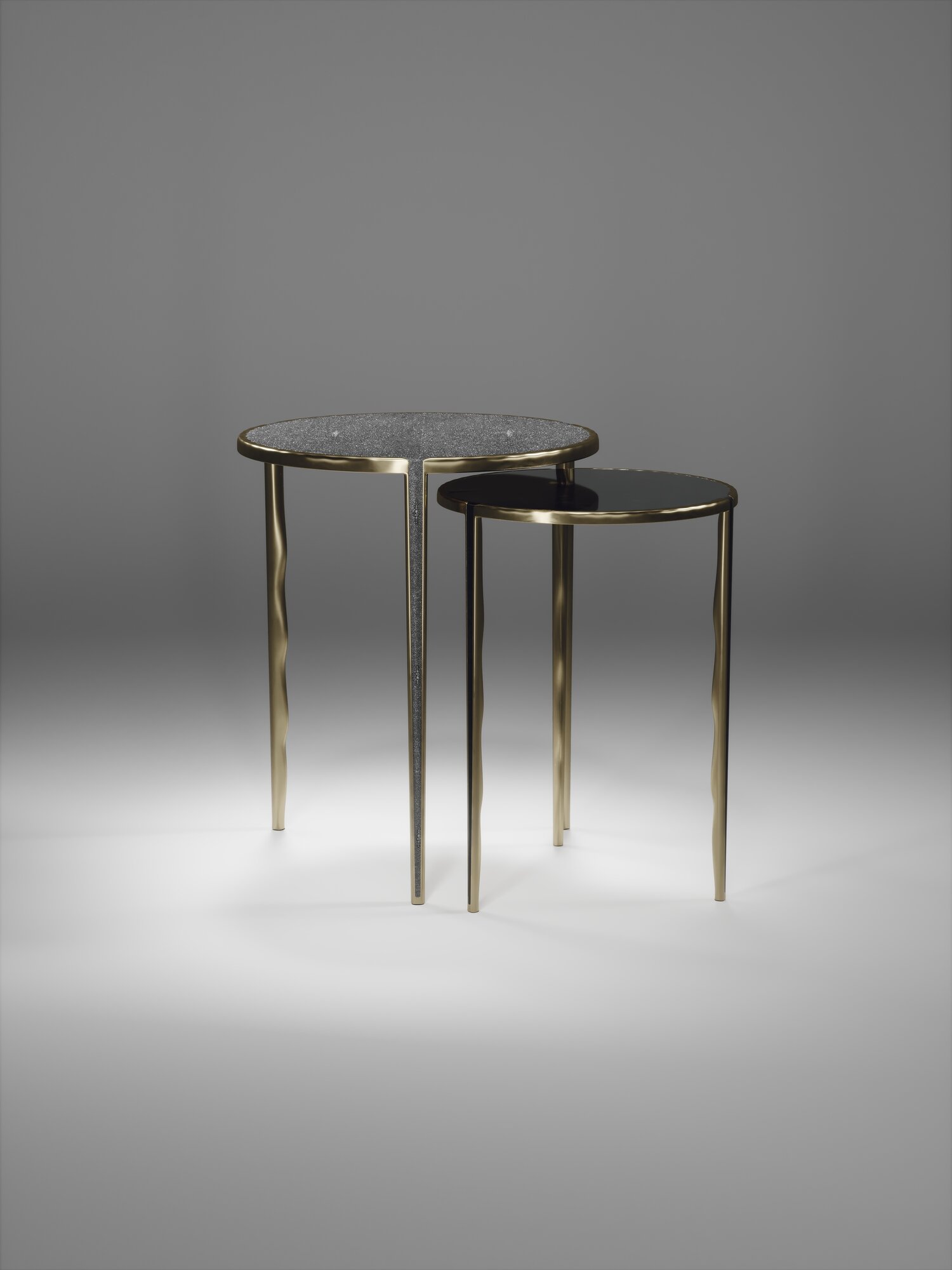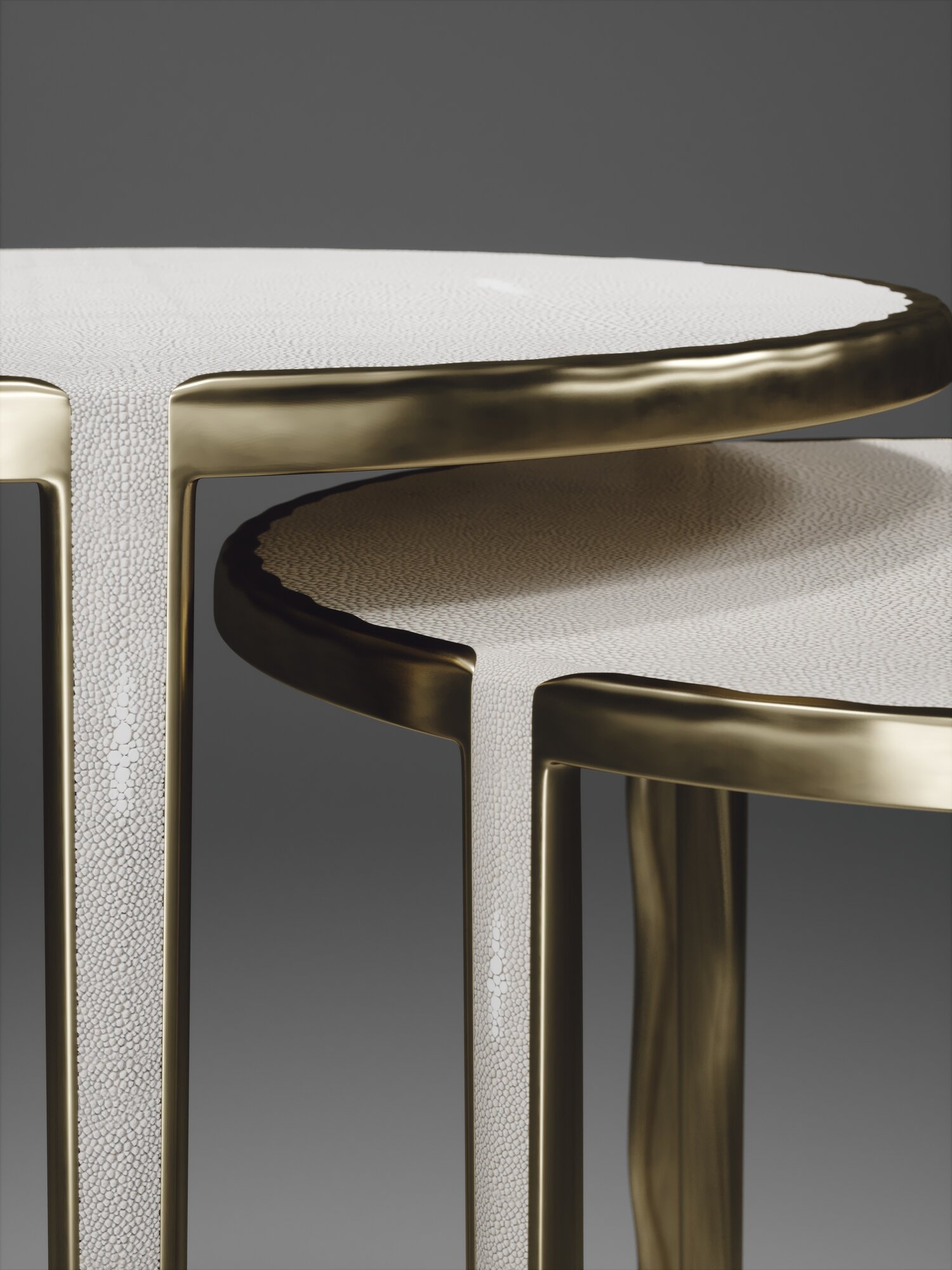 The Set of 2 Round Melting Nesting Side Tables, are the perfect accent pieces for any living space. These are sold as a set of 2 to create elegant and geometric shapes, but one can purchase the tables on their own. The large and medium size are inlaid in cream shagreen and the tops are framed with an irregular surface bronze-patina brass that continues onto the legs, which creates the "melting" effect against the shagreen inlay. These pieces come in other finishes and rectangle shapes.