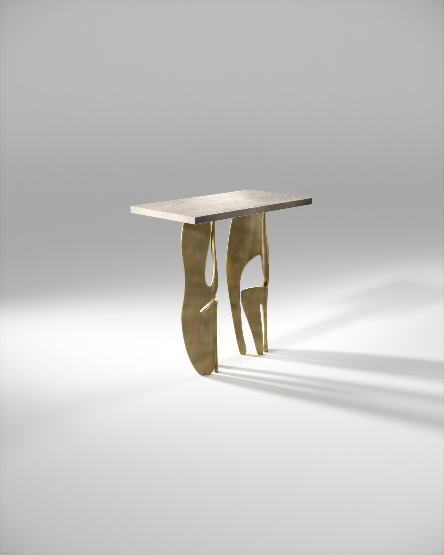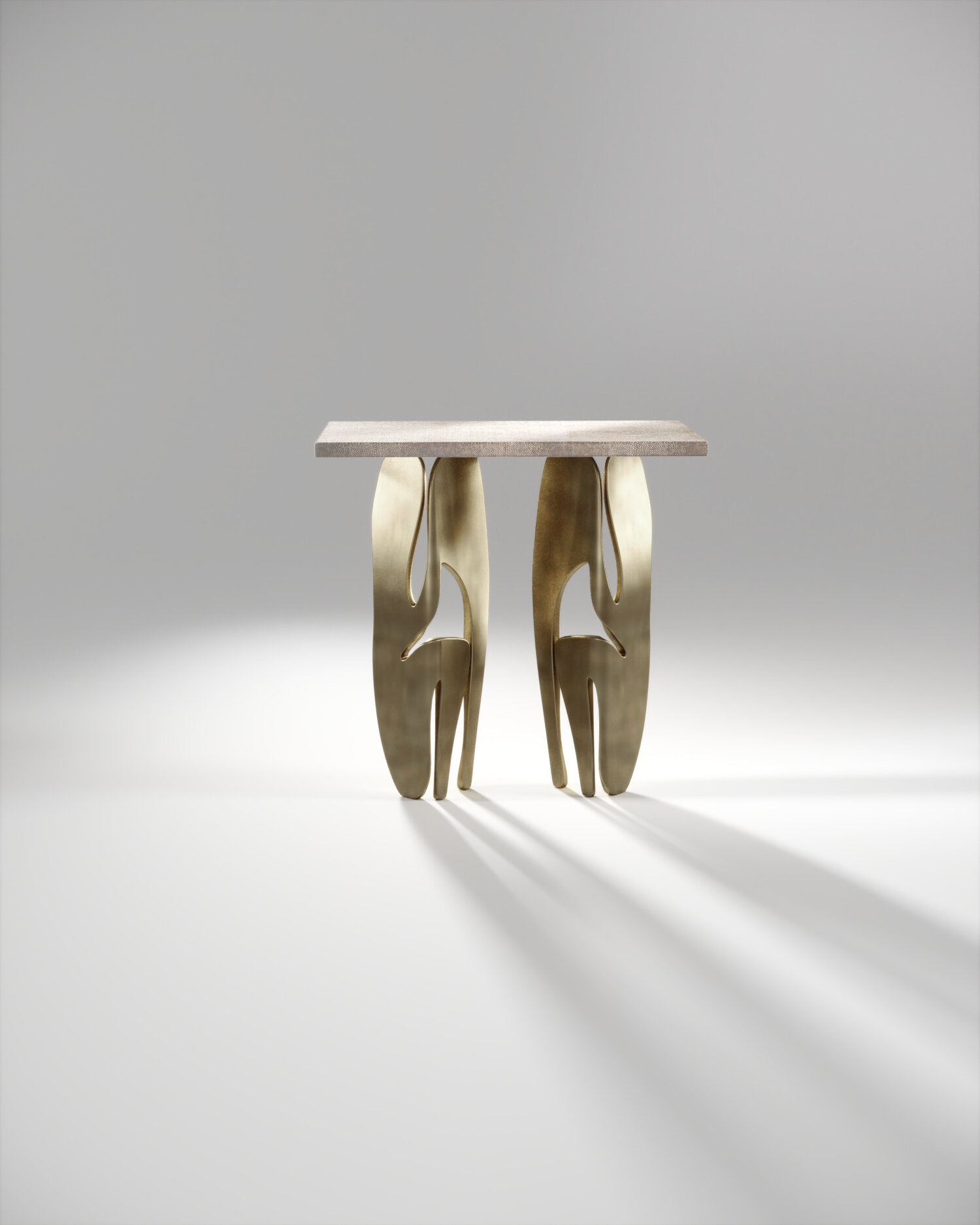 The metropolis rectangle side table by R&Y Augousti is both dramatic and organic it’s unique design. The cream shagreen inlaid top sits on a pair of ethereal and sculptural bronze-patina brass legs. This piece makes for the perfect end table and is originally inspired by the metropolis console.