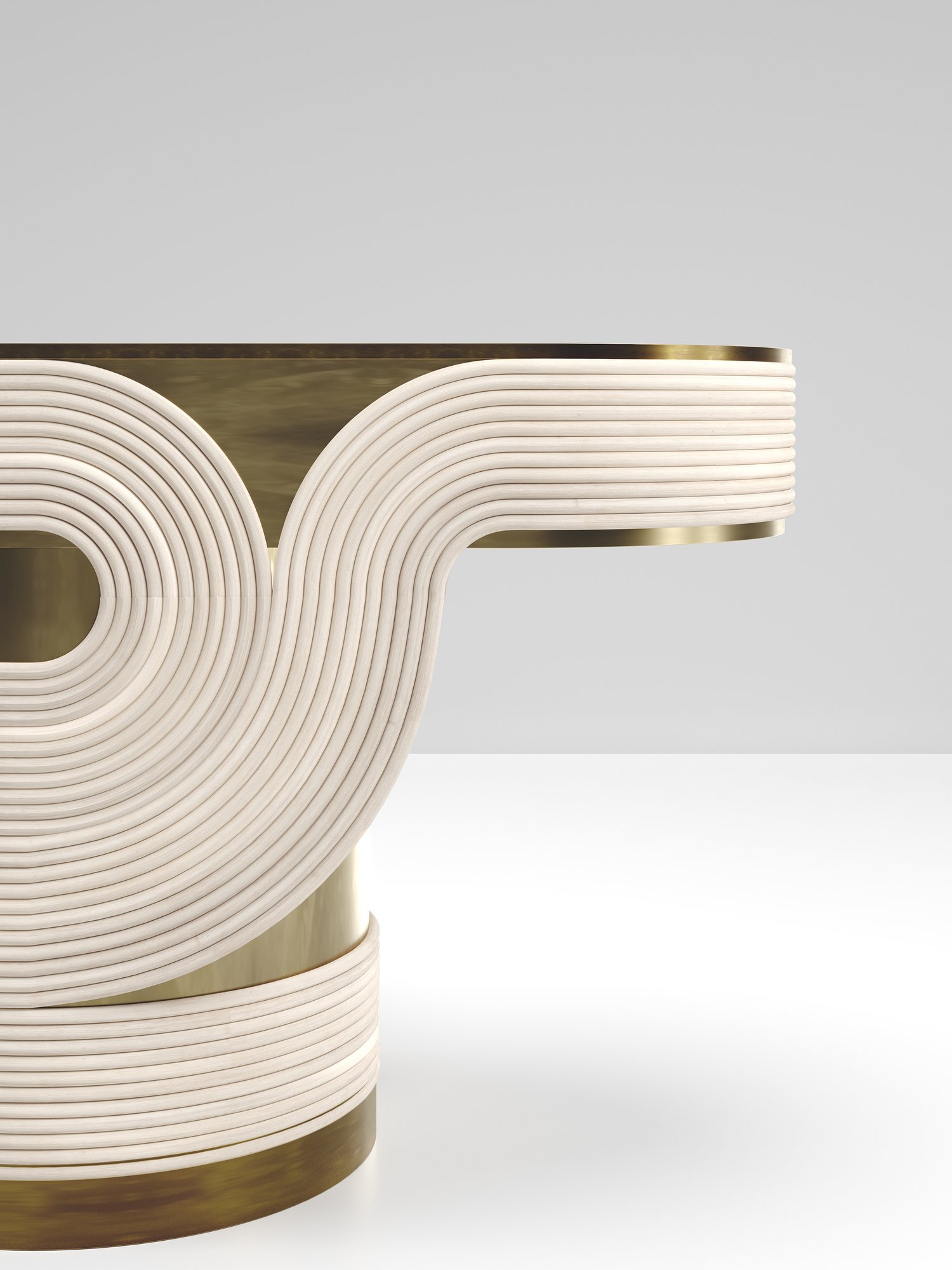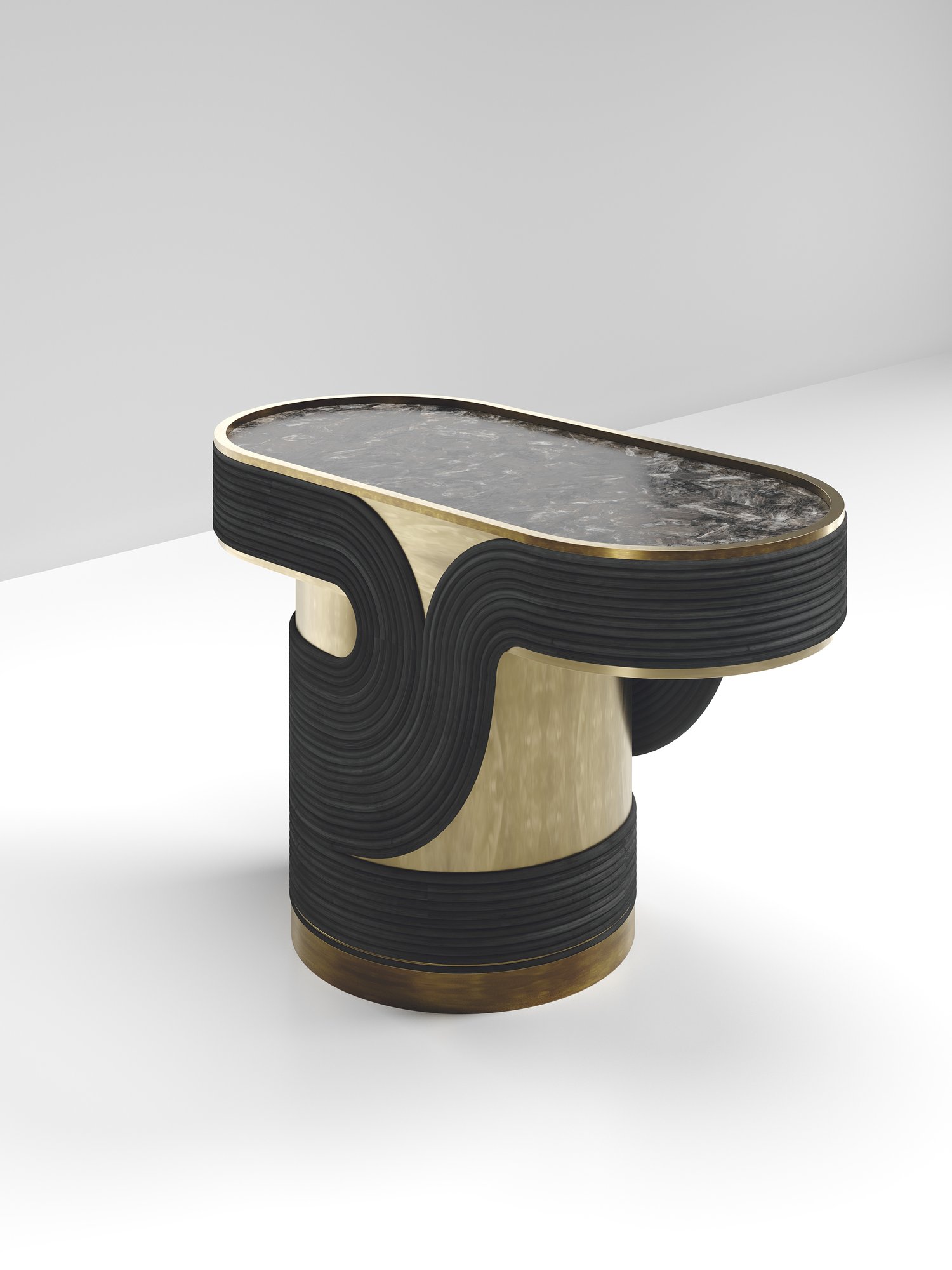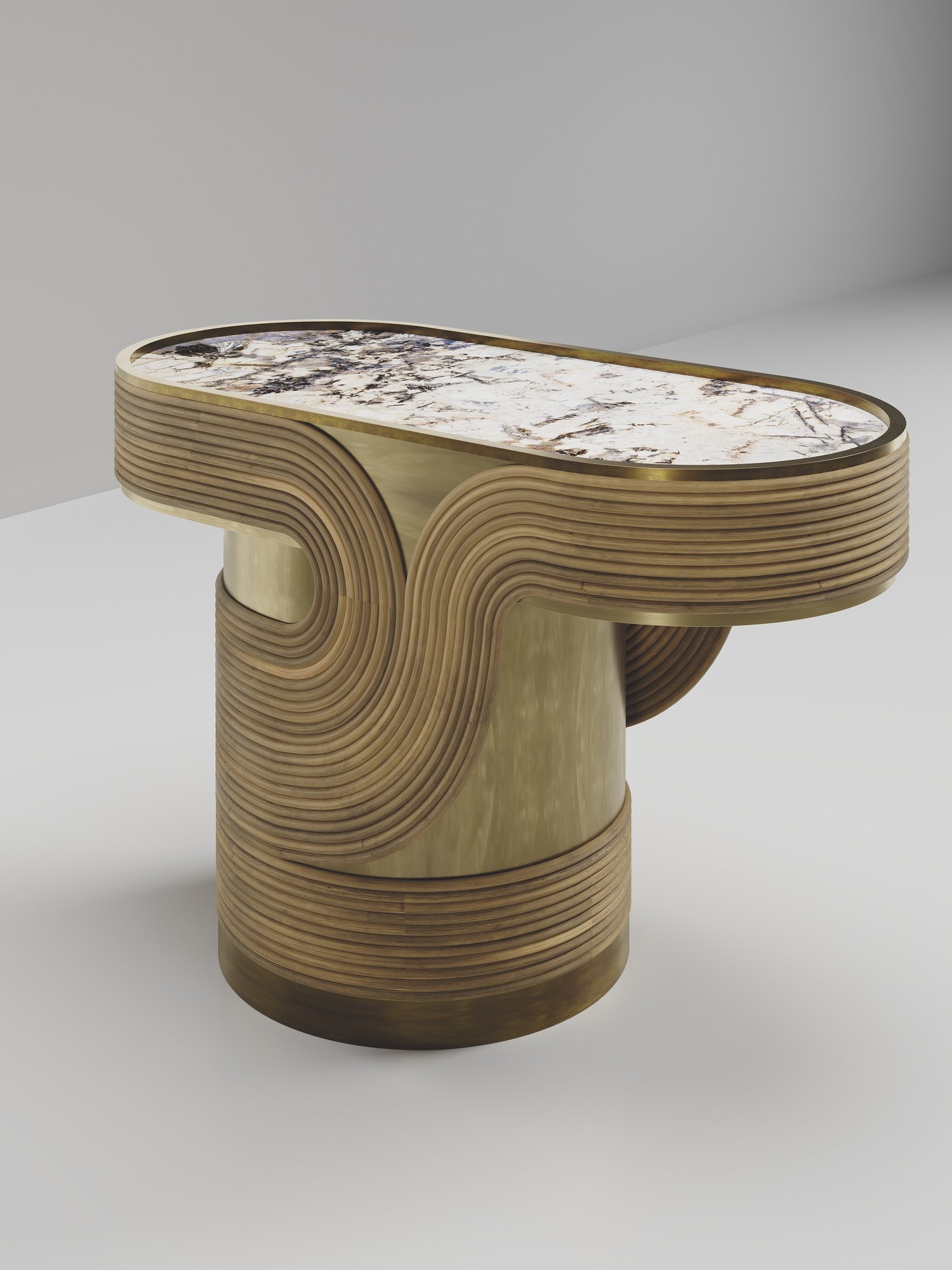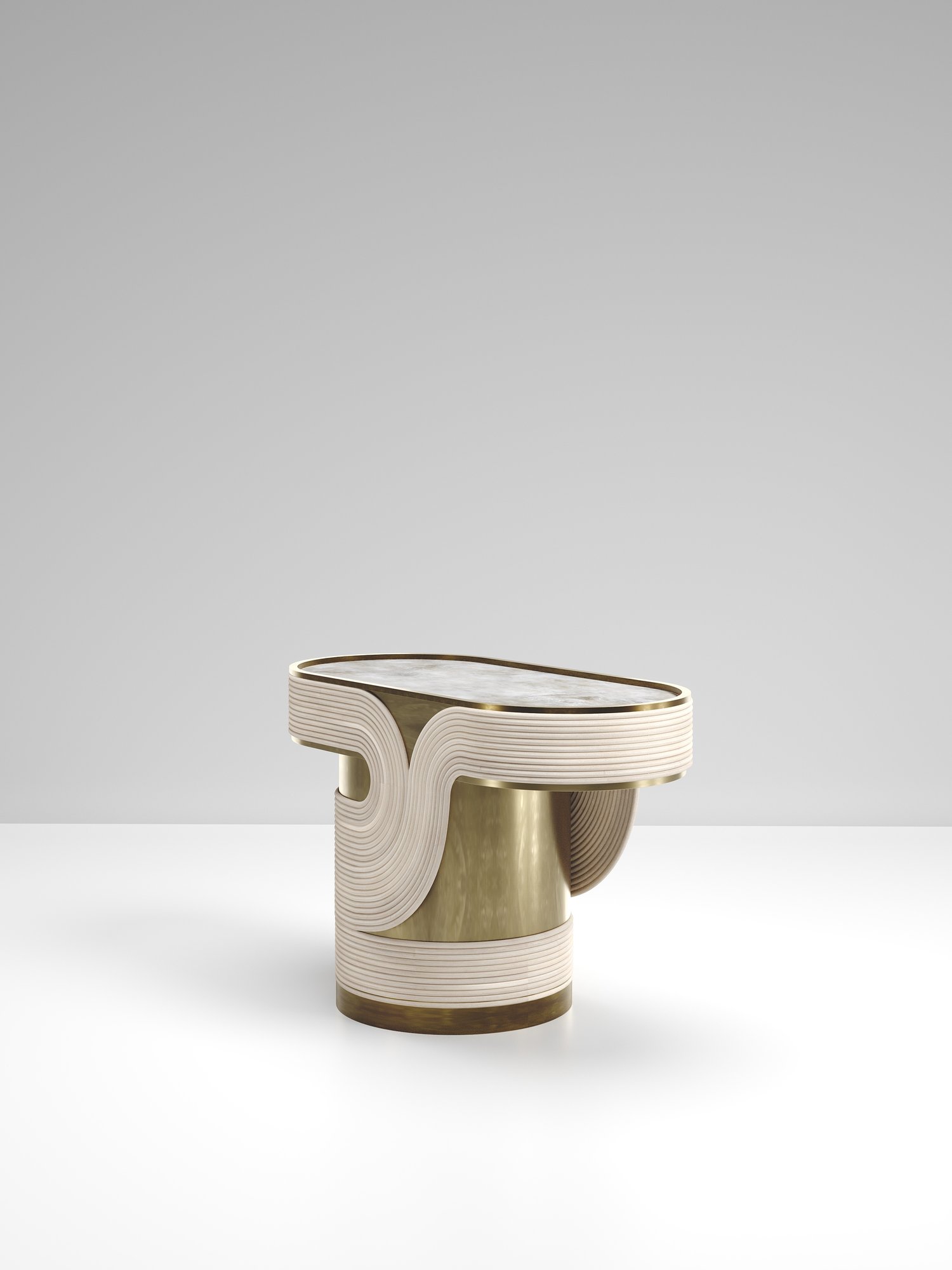 The Licol Side table by R & Y Augousti is a part of their new Rattan capsule launch. The piece explores the brand's iconic DNA of bringing old world artisanal craft into a contemporary and utterly luxury feel. This table is done in a cream rattan finish, with a smokey white quartz inlaid top and bronze patina brass details. Available in other finishes. Part of the Augousti Rattan capsule, see images of the collection at end of slide. Custom sizing/finishing on request.