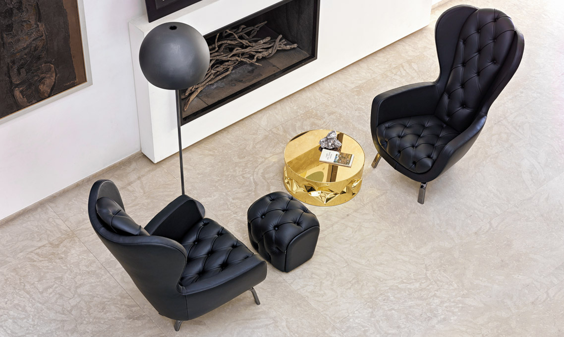 Come ogni altro pezzo della collezione di quell’anno, anche la bergère trova nel Medioevo e nella rivisitazione dei concetti precostituiti i propri motivi ispiratori. Da un lato quindi il nome Guelfo, in omaggio ad una delle opposte fazioni che durante il Medioevo tanta parte ebbero nella costruzione della storia e nella cultura fiorentina, dall’altra, l’utilizzo – rivisitato con sofisticata ironia – di elementi estetici di epoche trascorse, che qui vengono contaminati e attualizzati con dettagli squisitamente contemporanei. Un sapiente (e molto post-moderno) gioco di accostamenti inediti, come l’idea di impiegare assieme elementi e materiali in apparenza eterogenei, quali la lavorazione capitonné e il nichel nero utilizzato per la struttura.
