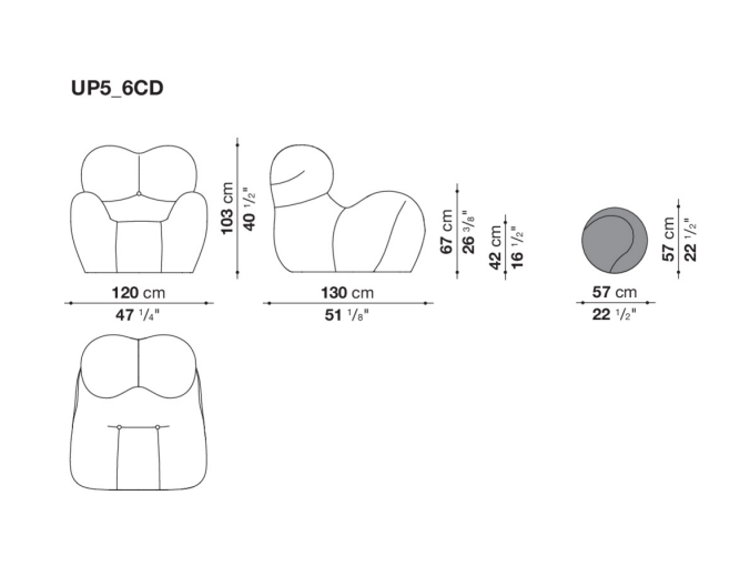 Famous icon of international contemporary design, Serie Up won last June the XXVII Compasso d'Oro "Award for Product Career 2022", the most significant award in the field of Italian industrial design. B&B Italia pays tribute to the anthropomorphic armchair with the limited edition "Compasso d'Oro Edition", available in just 500 numbered pieces. UP5_6 will be upholstered in the exclusive CD fabric in antique gold, while the spherical ottoman in bronze fabric will be tied to the armchair by means of an aluminum chain with corten finish.