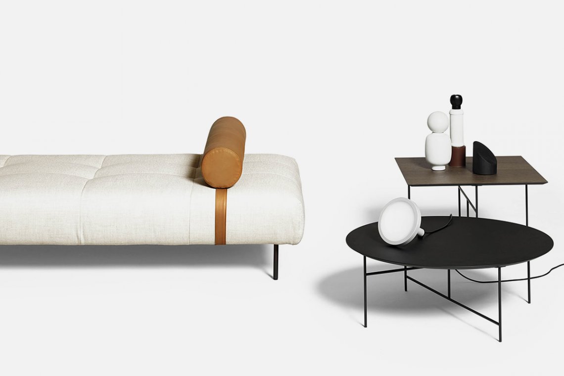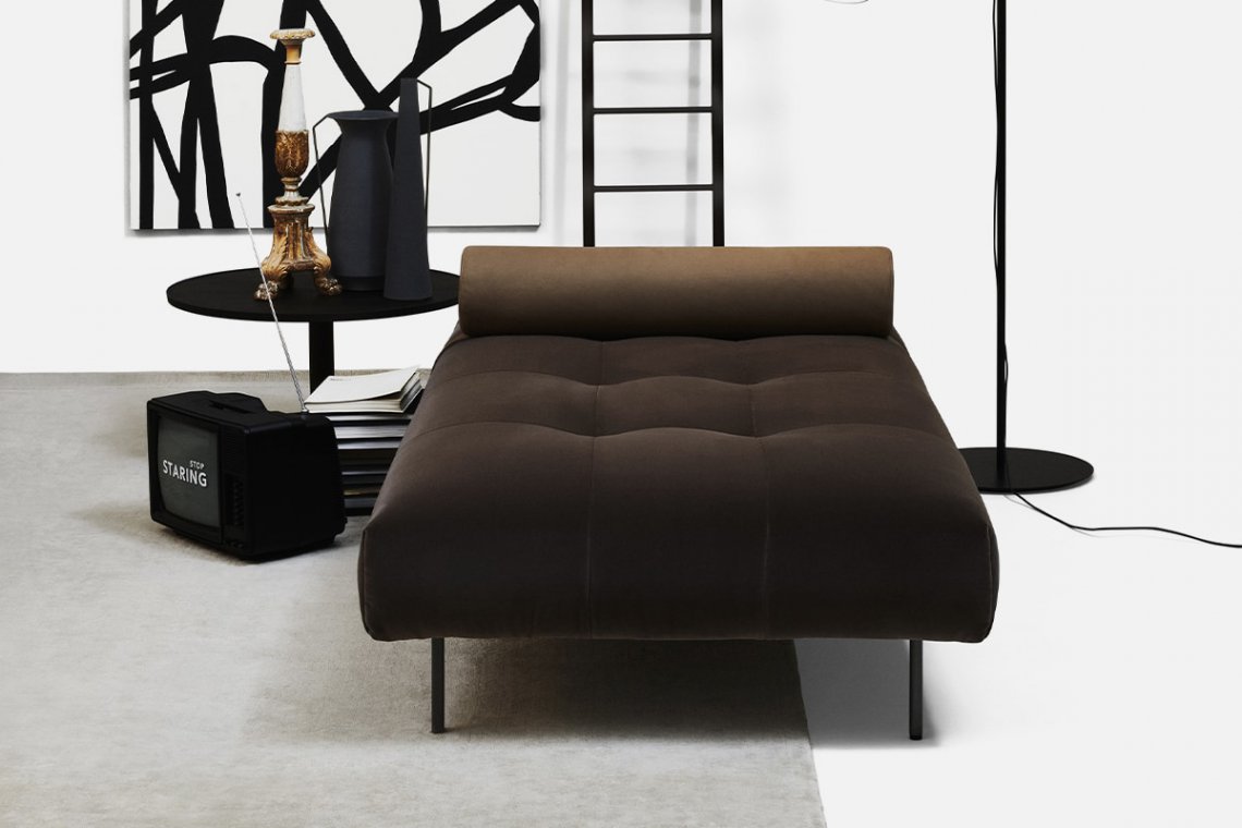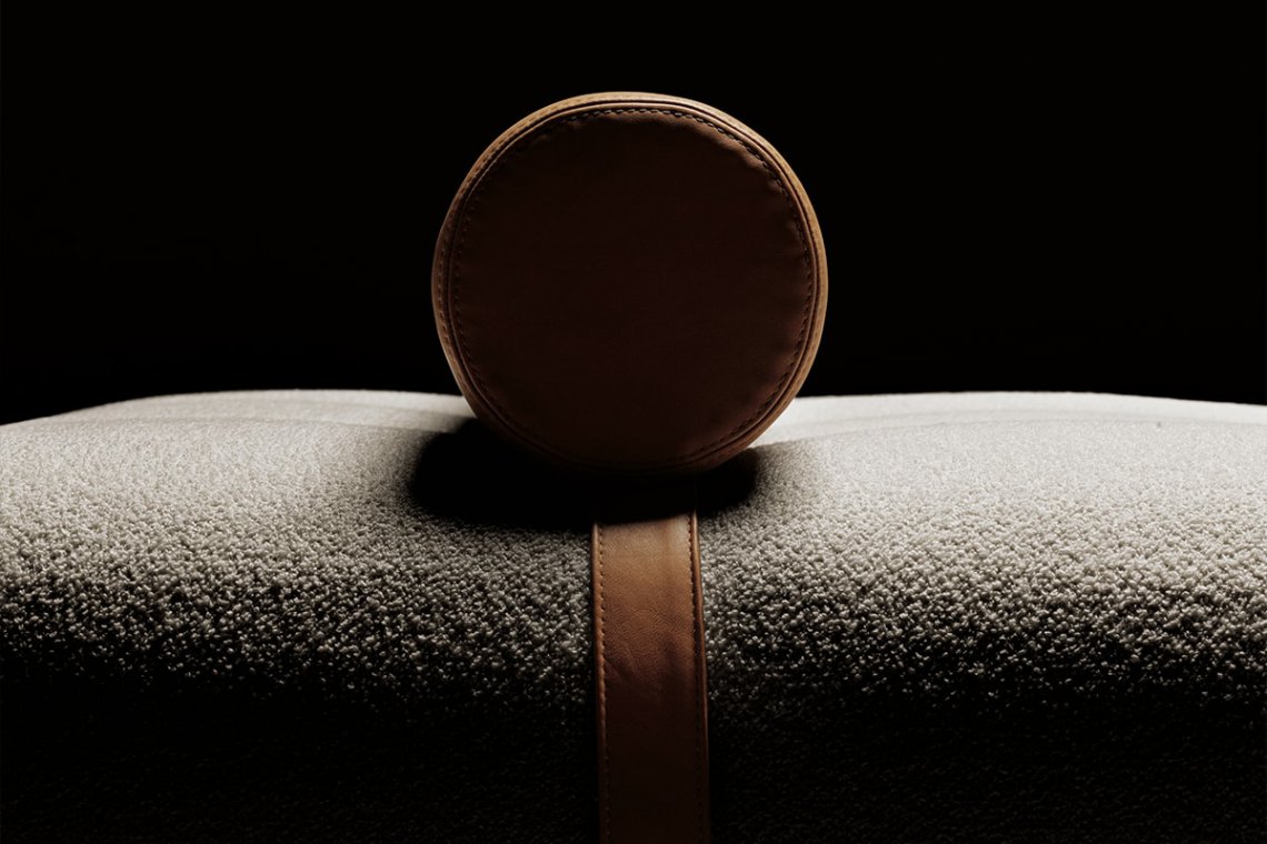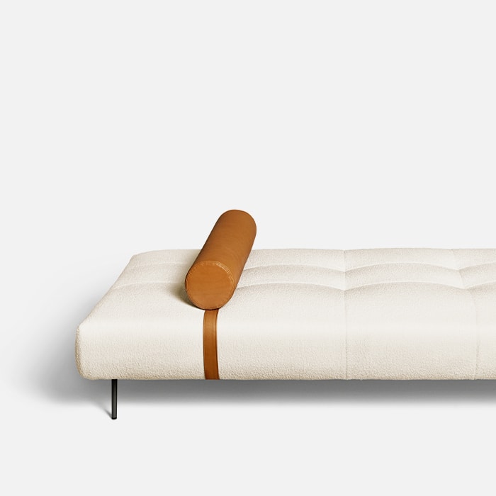 Erei’s domestic landscapes are formed by straight lines and different heights that interact with one another. Elisa Ossino’s project had to include a daybed with seams that create an original tufted capitonné motif. A leather cylinder anchored by an integrated belt serves as a headrest. A large leather pocket and two square or rectangular cushions complete the collection.