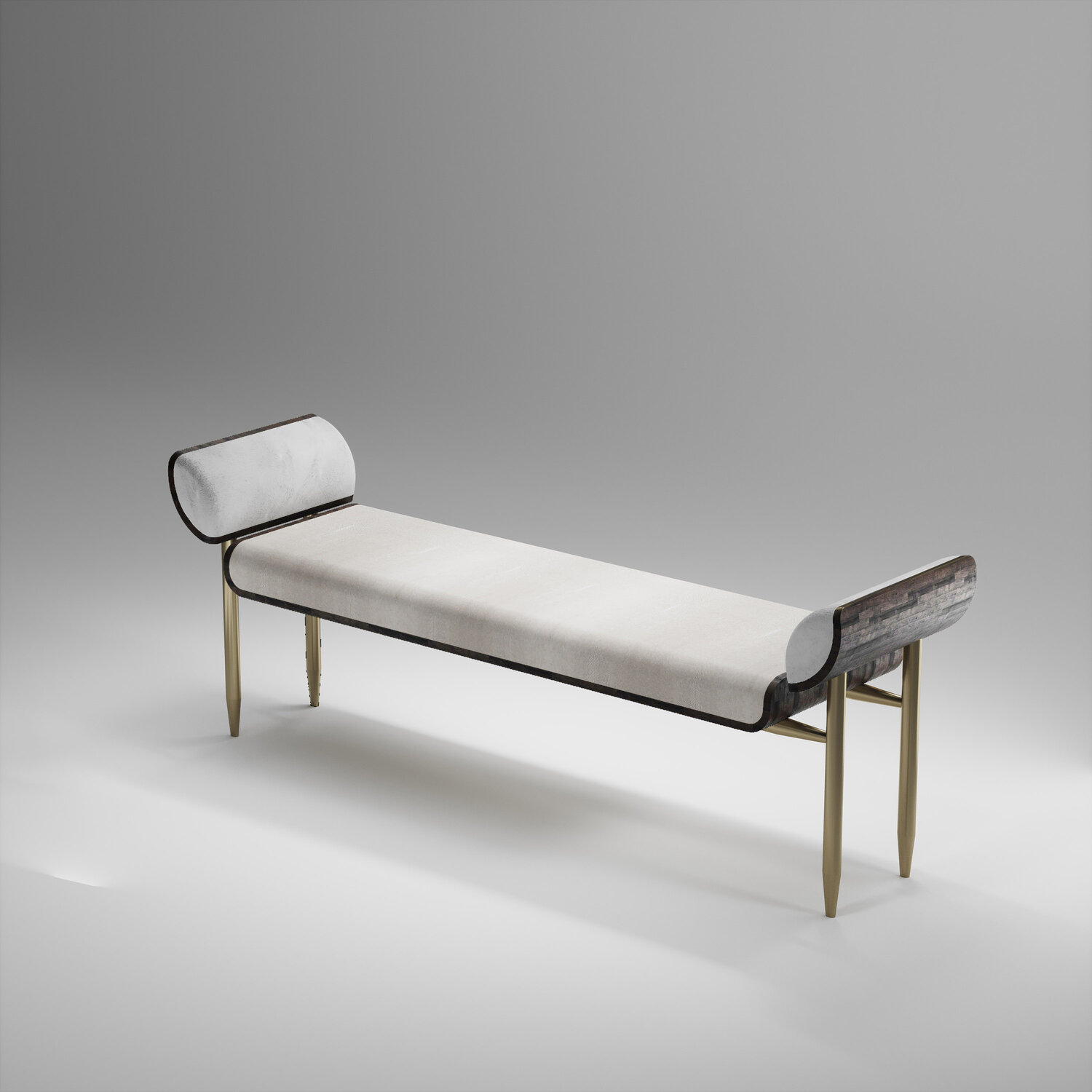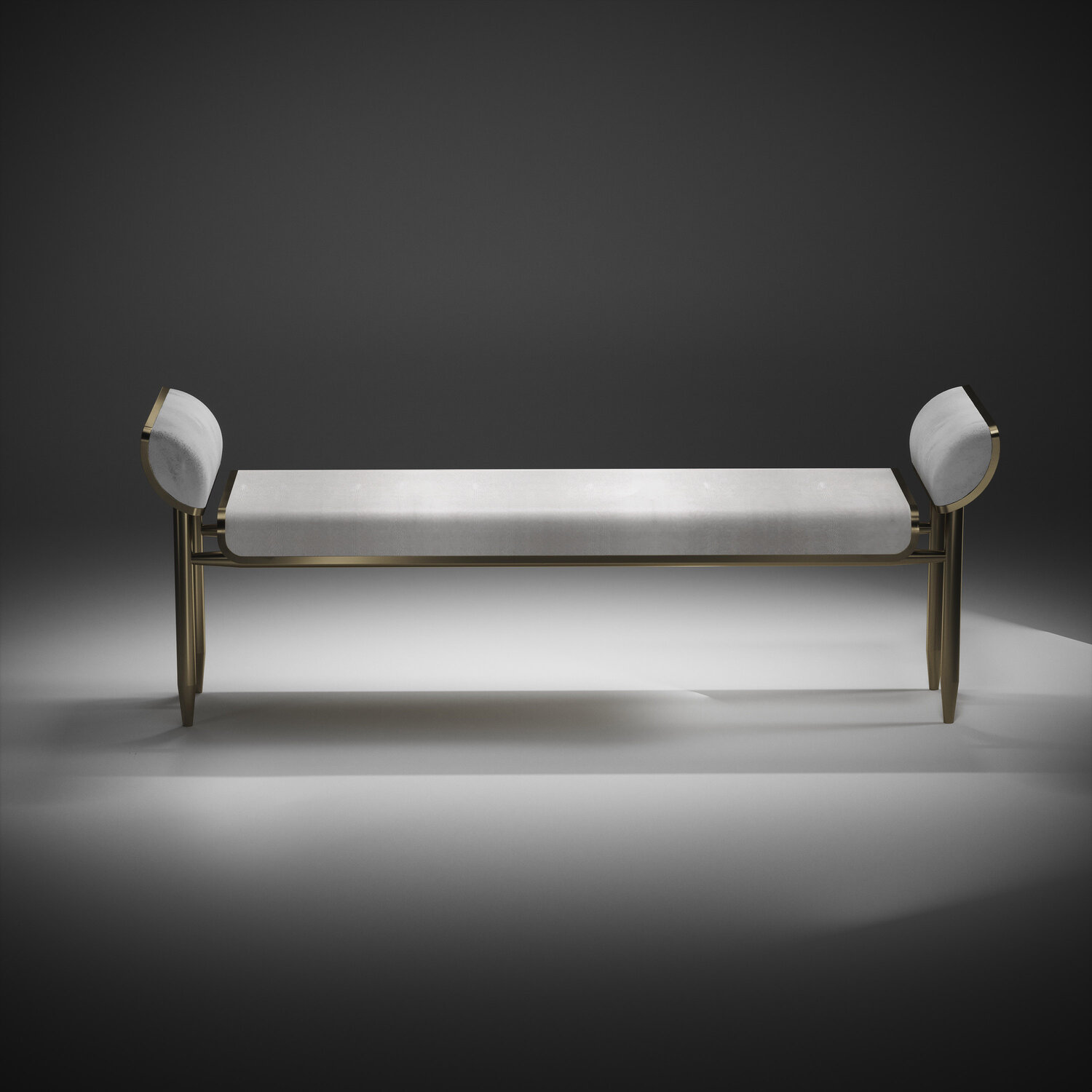 Inspired by the original Dandy bench by KIFU PARIS, the Dandy II Bench is the ultimate luxury seating. The seating area is inlaid in cream shagreen and the frame, legs and sides of the bench are completely inlaid in bronze-patina brass. On the left and right side of the bench both armrests are upholstered in white vachette. Other versions are also available as part of the Dandy II Capsule.