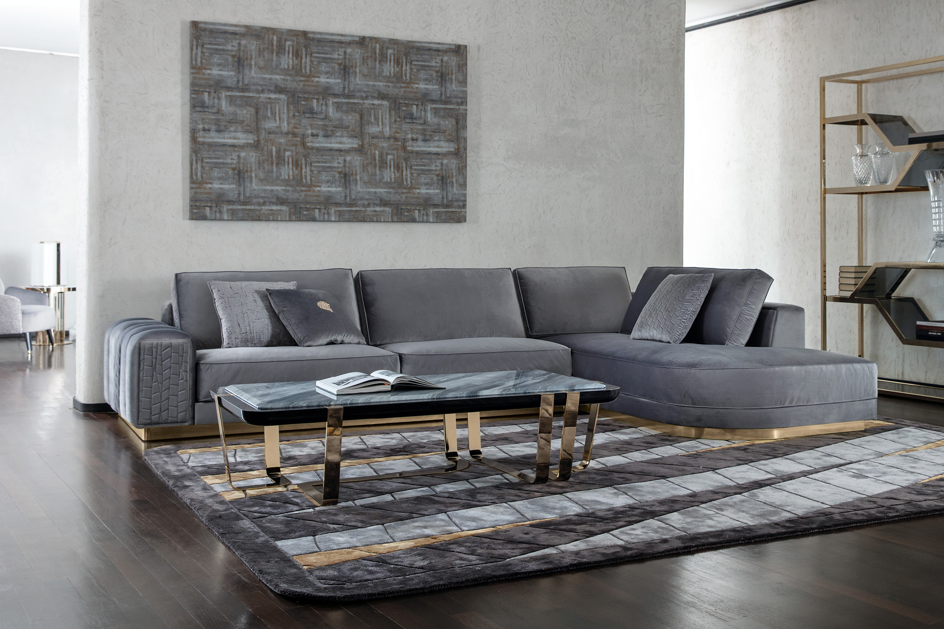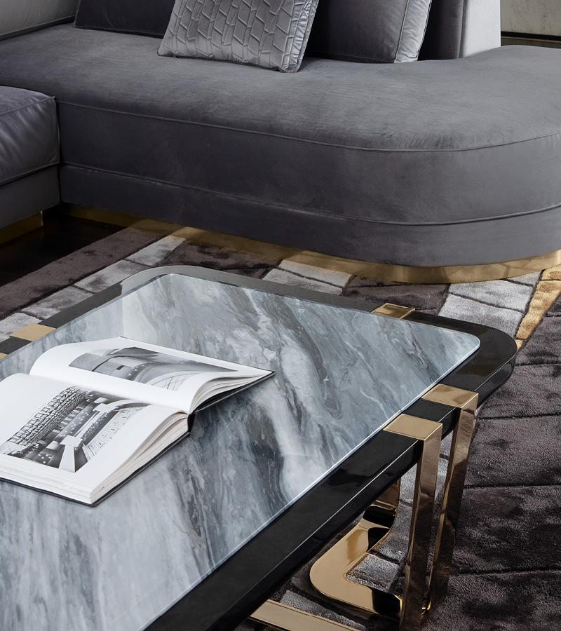 Rectangular cocktail table with frames in Black Bubinga burl veneer with high gloss polyester finish and light gold chrome stainless steel. Top in beveled marble.