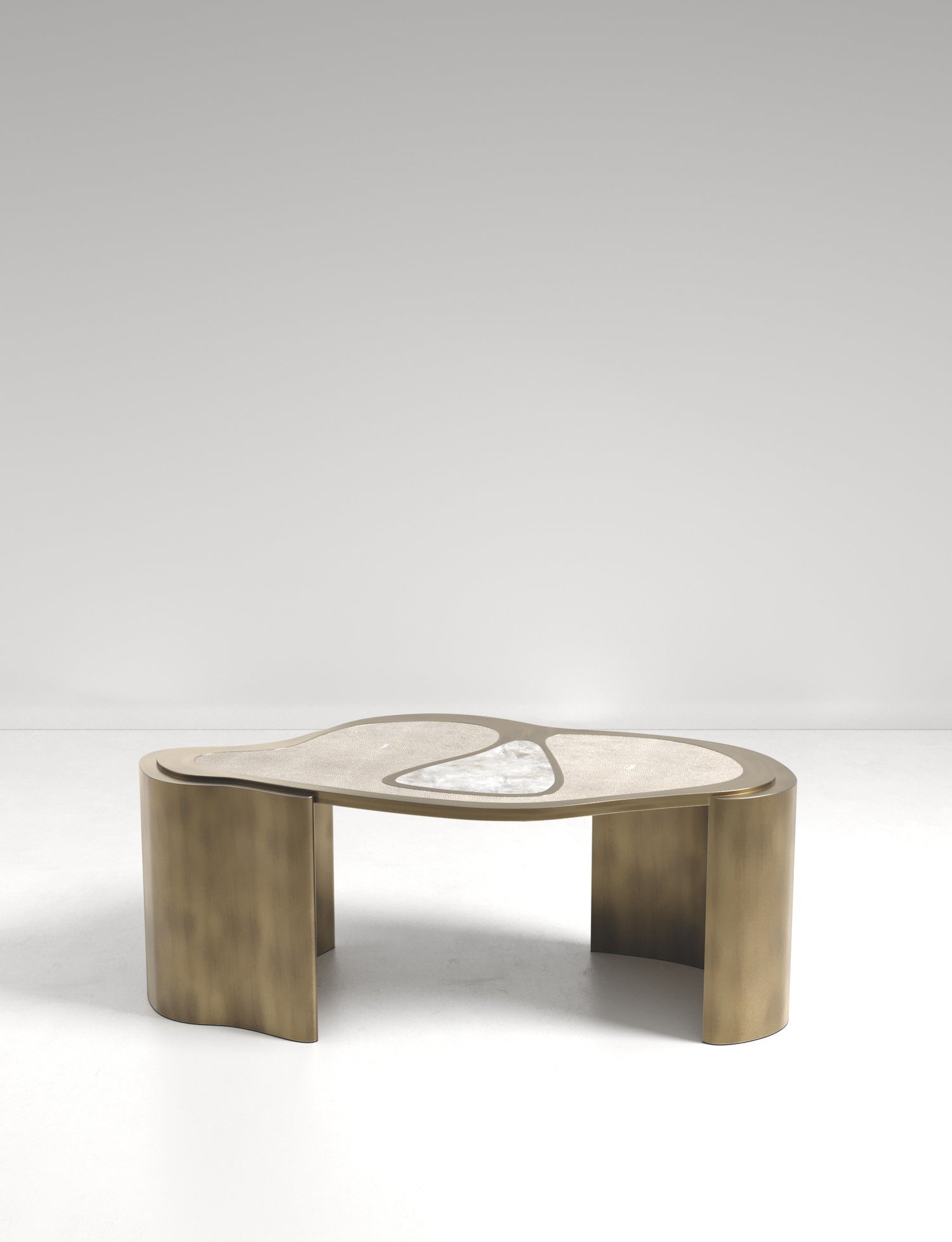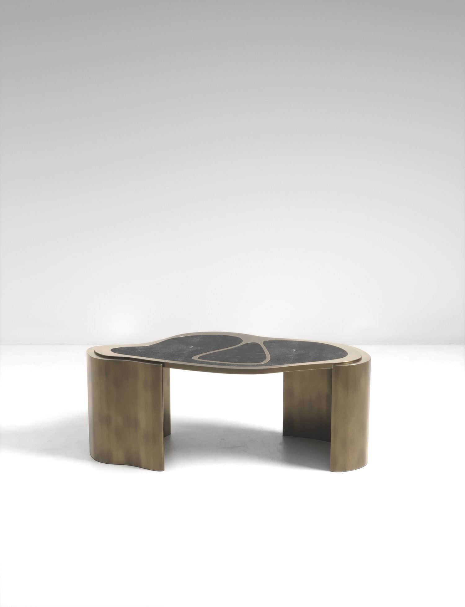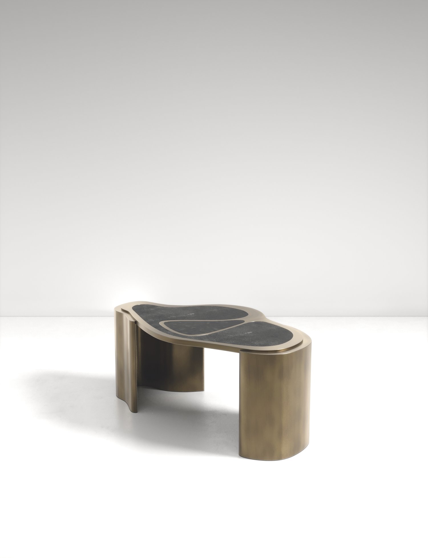 The Mask Coffee Table by Kifu Paris is a versatile and organic piece. The amorphous top and base are inlaid in a mixture of shagreen, white quartz or shell and bronze-patina brass. This piece is designed by Kifu Augousti the daughter of Ria and Yiouri Augousti. Available as a nesting side table and a coffee table