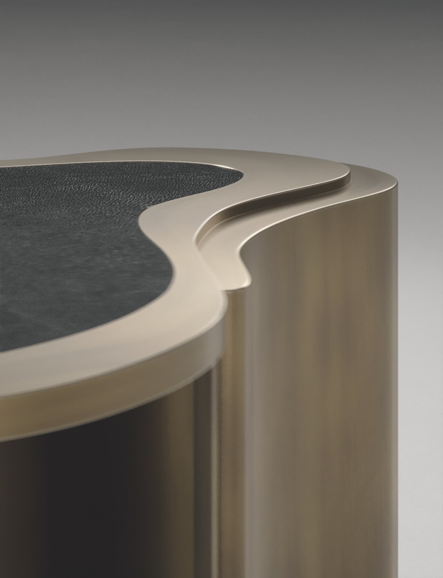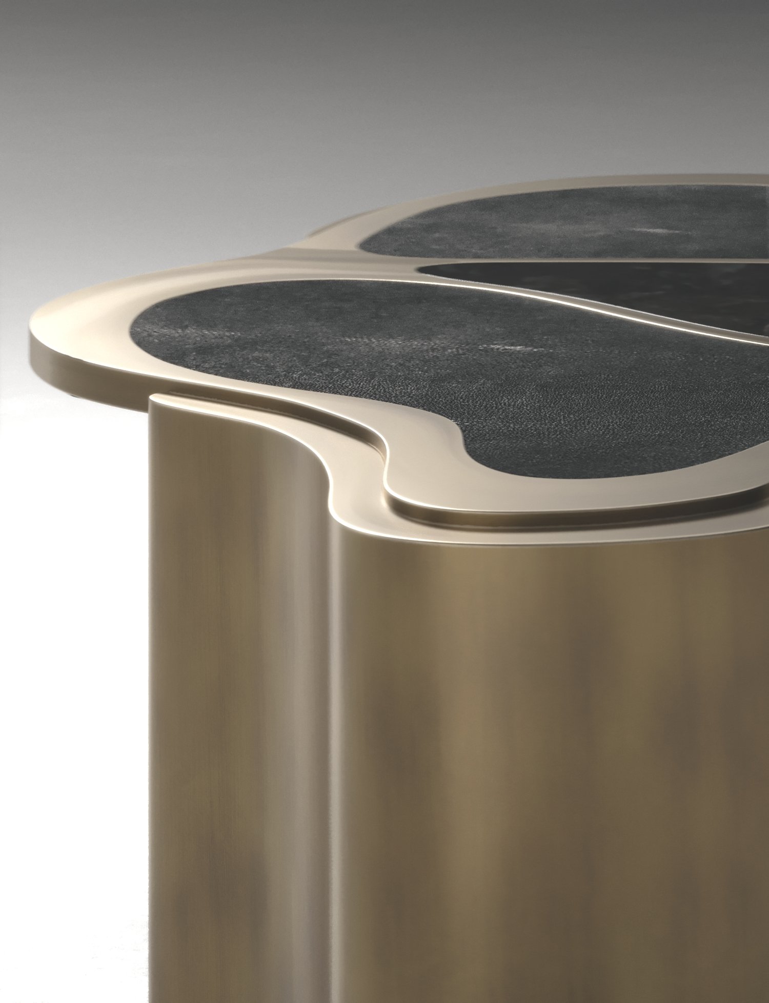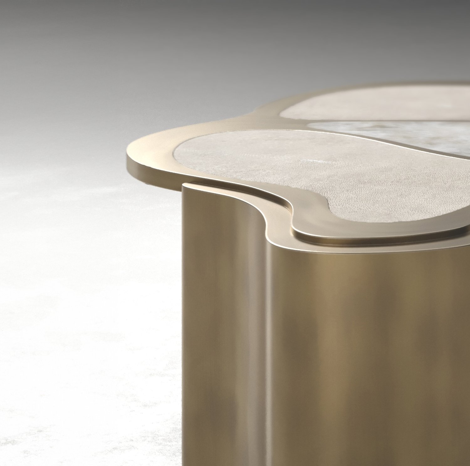 The Mask Coffee Table by Kifu Paris is a versatile and organic piece. The amorphous top and base are inlaid in a mixture of shagreen, white quartz or shell and bronze-patina brass. This piece is designed by Kifu Augousti the daughter of Ria and Yiouri Augousti. Available as a nesting side table and a coffee table