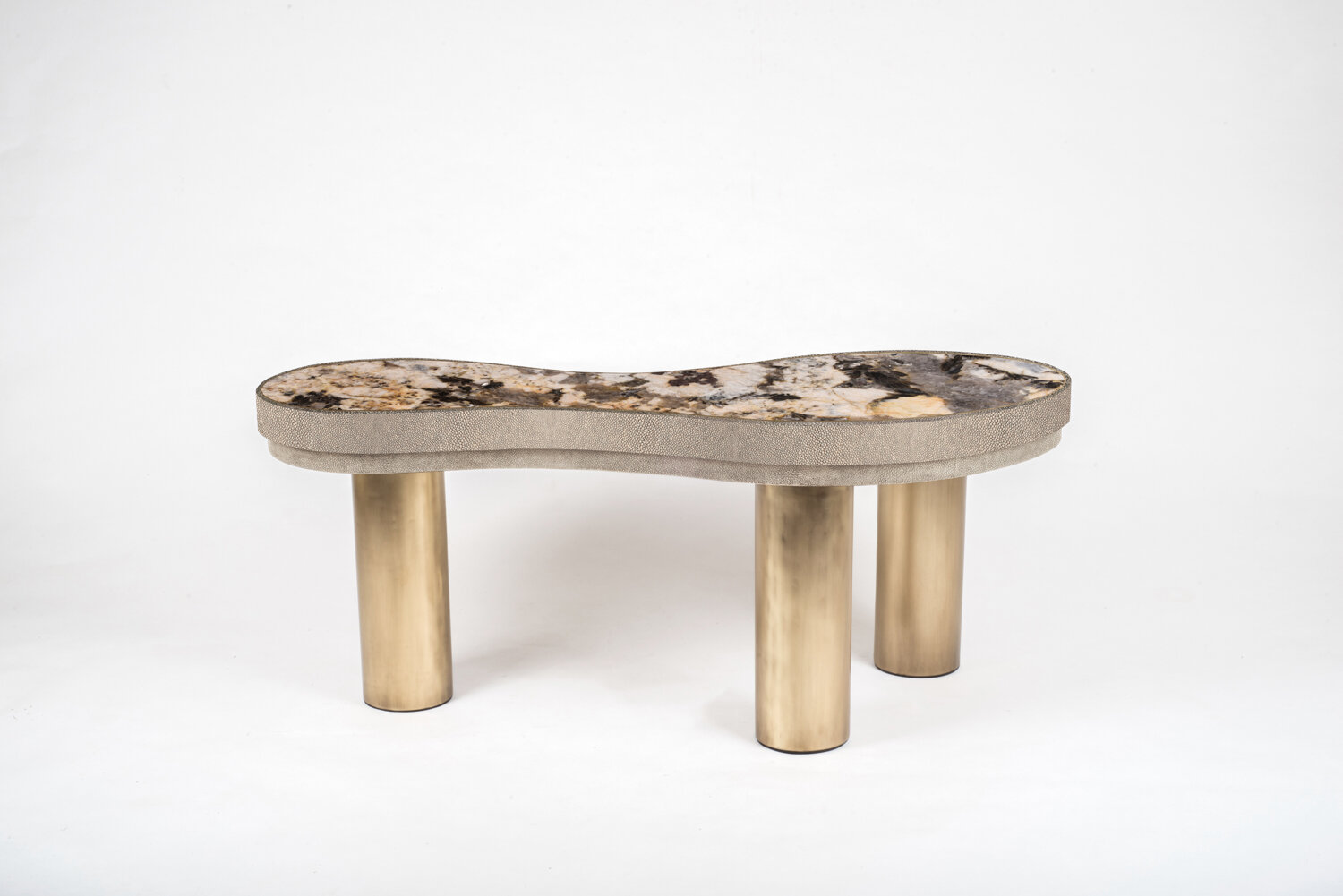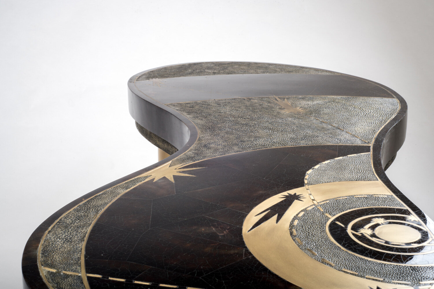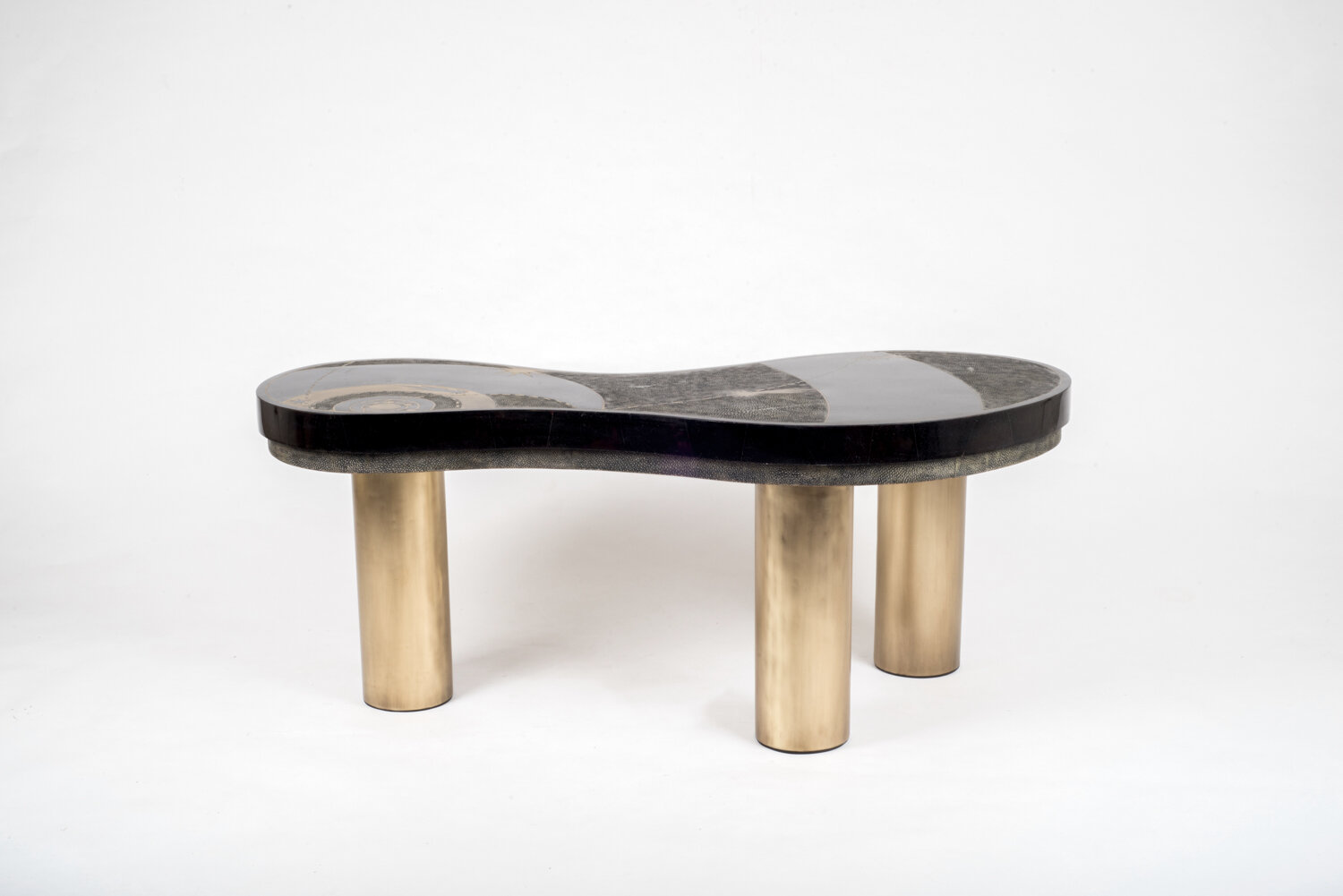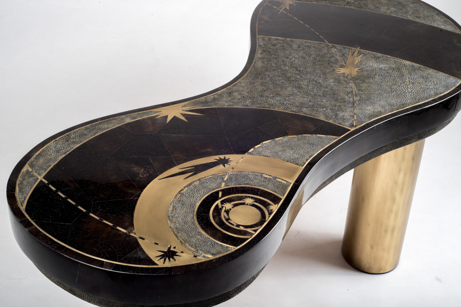 The constellation coffee table is whimsical and elegant with its galactic inspired shaped. This piece can also double as a bench. The top is inlaid in a beautiful Black Quartz semi-precious stone that has incredible tonalities in it and details. The shagreen inlaid side border is hand-dyed by artisans and the designer calls the final finish “coal black” shagreen. The table sits on three bronze-patina brass tubular legs this piece is designed by Kifu Augousti, the daughter of Ria and Yiouri Augousti. Available in different finishes and with a pattern inlay.