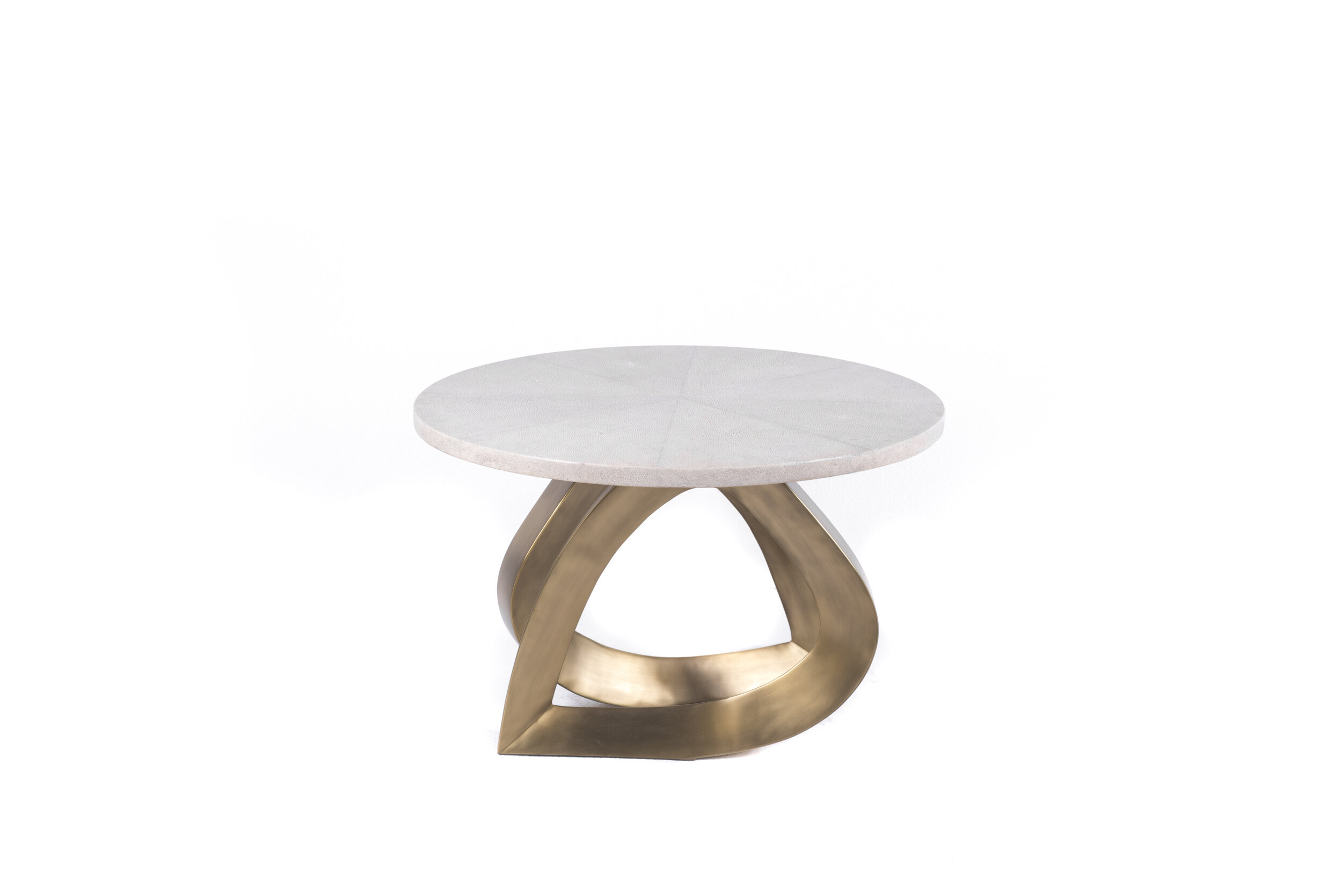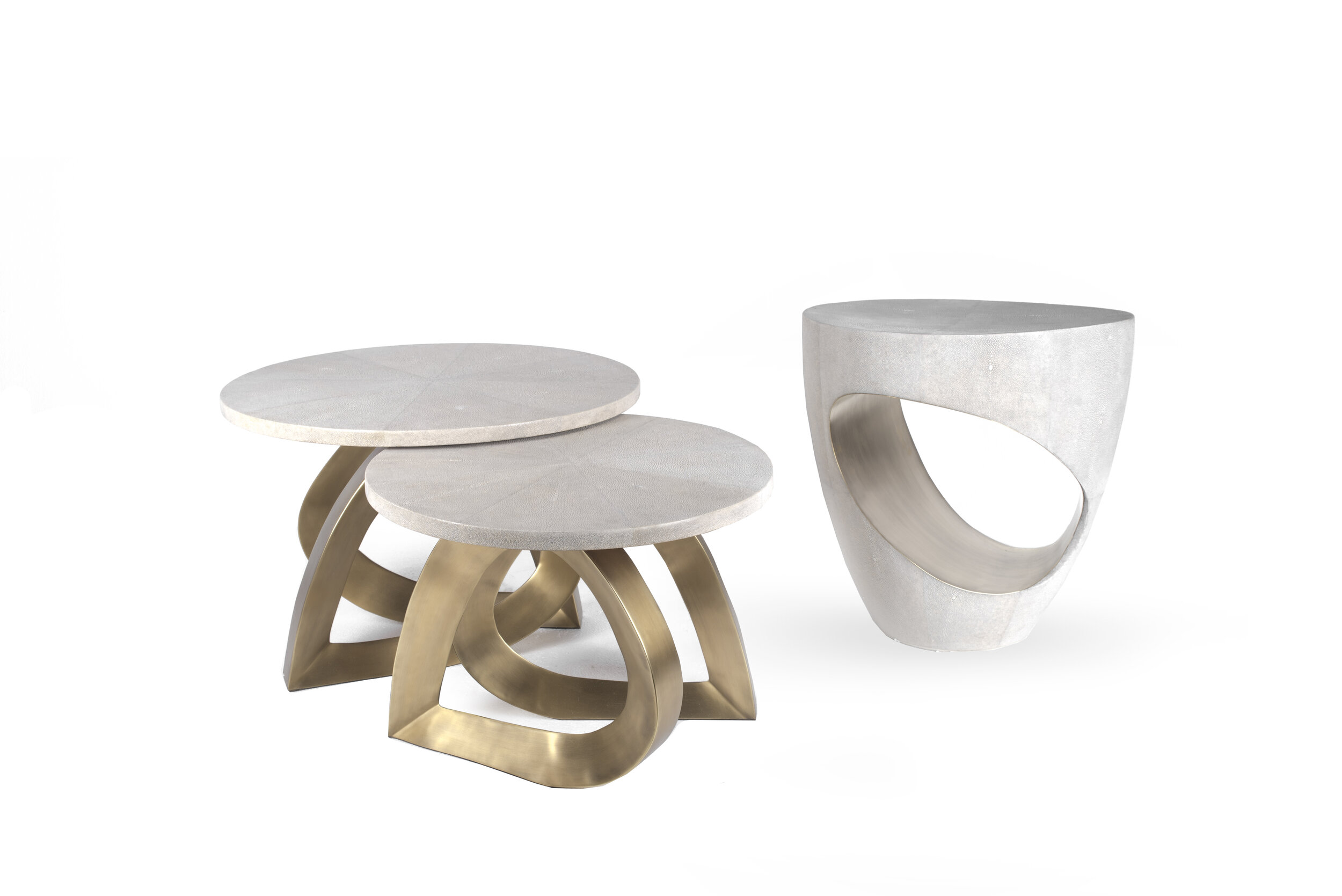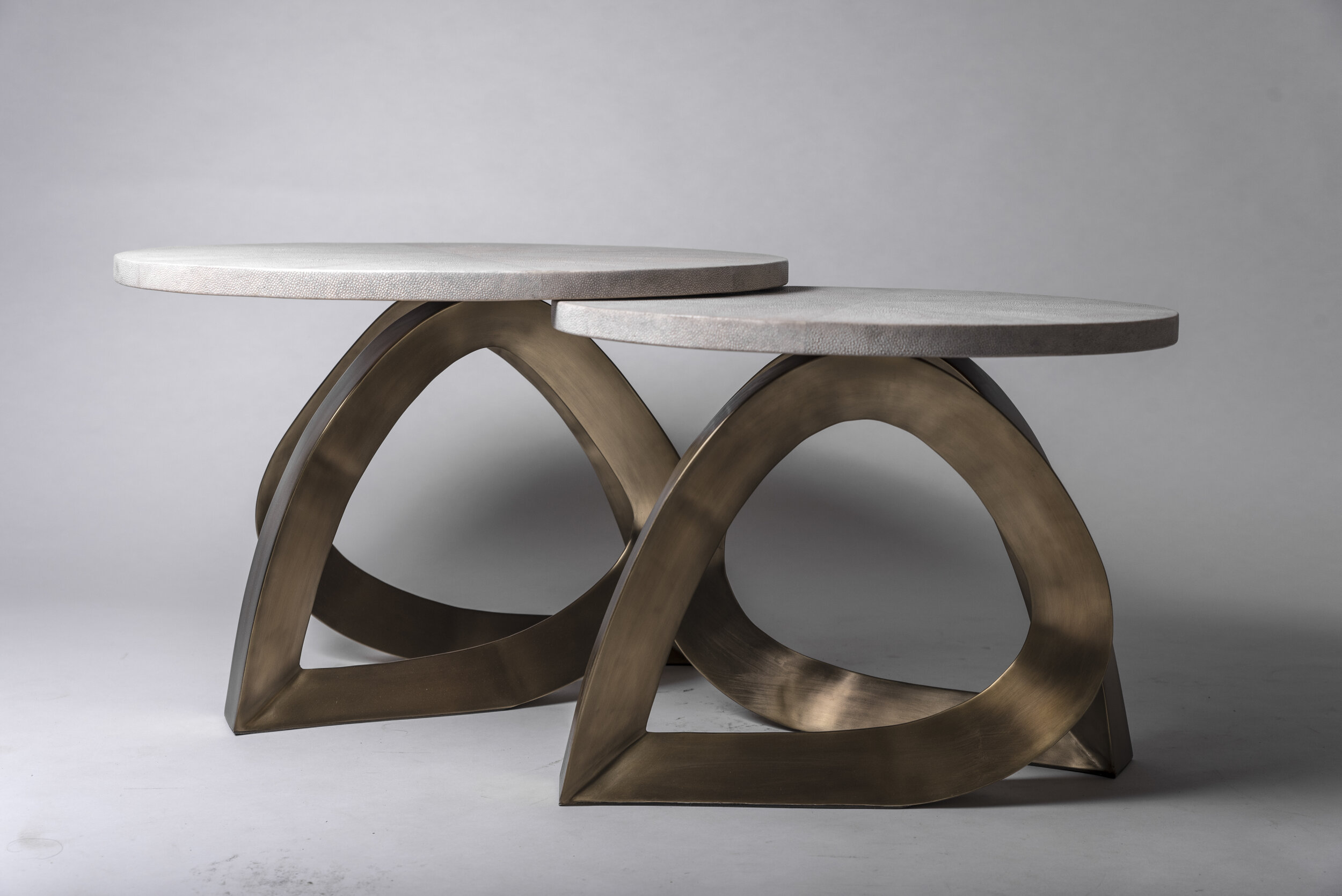 The set of 2 teardrop nesting coffee tables in cream shagreen and bronze-patina is an elegant design with circular top that sits on a sculptural base. The sculptural base is inlaid in bronze-patina brass and the top is in cream shagreen. These coffee tables are the perfect accent for any living room. This piece is designed by the daughter of Ria and Yiouri Augousti.