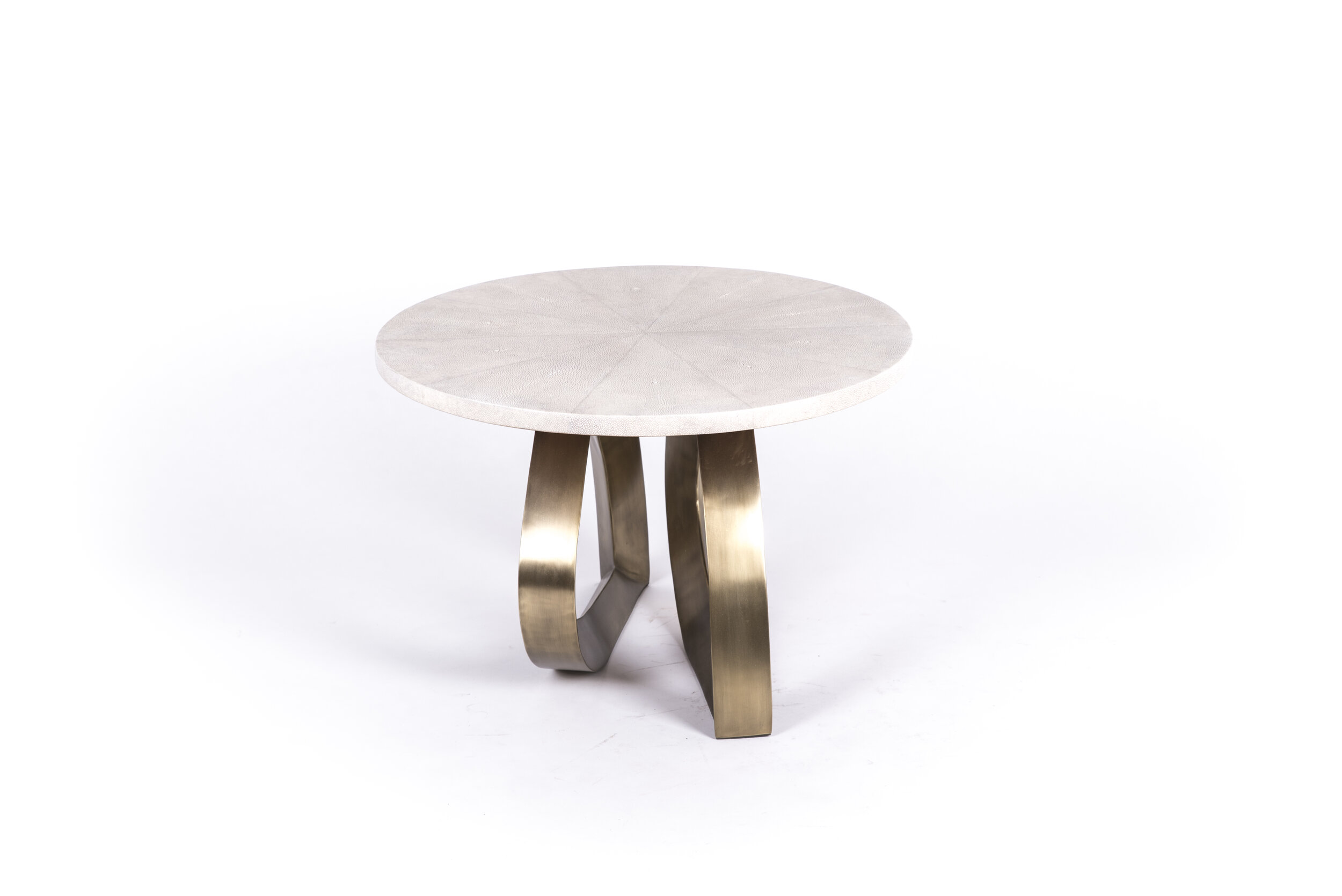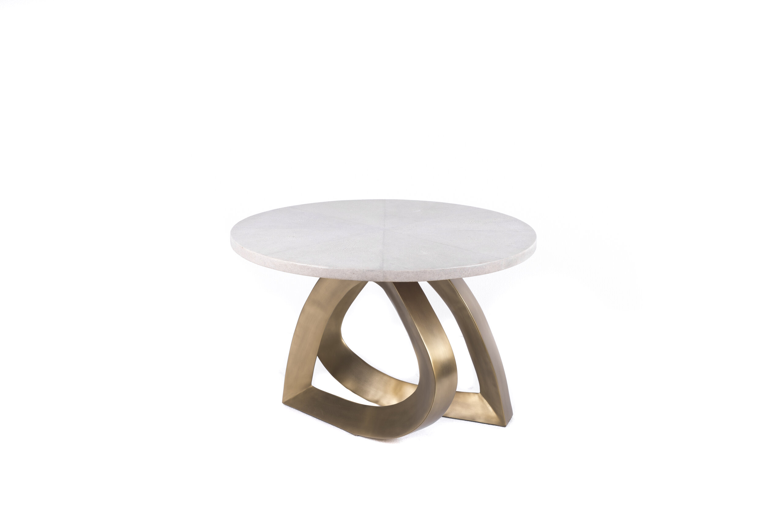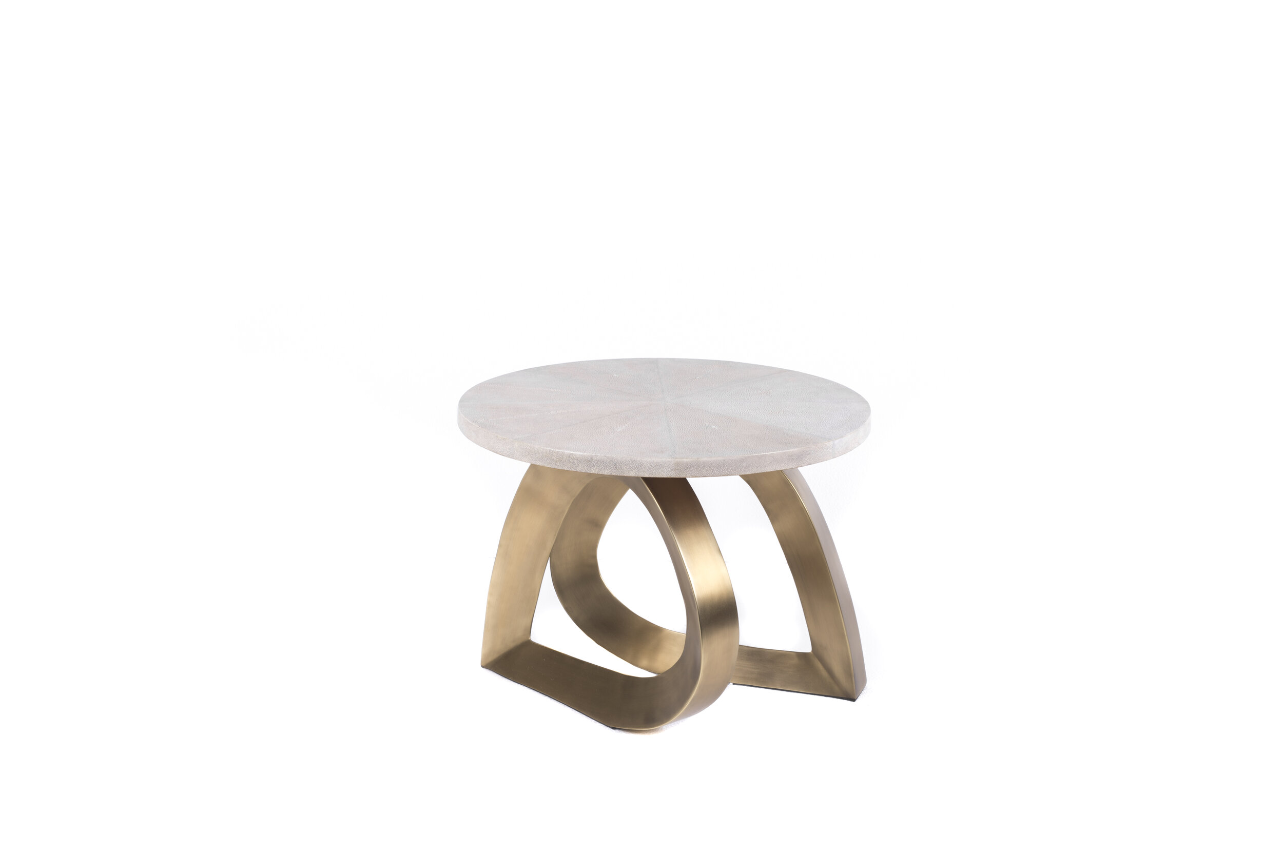 The set of 2 teardrop nesting coffee tables in cream shagreen and bronze-patina is an elegant design with circular top that sits on a sculptural base. The sculptural base is inlaid in bronze-patina brass and the top is in cream shagreen. These coffee tables are the perfect accent for any living room. This piece is designed by the daughter of Ria and Yiouri Augousti.