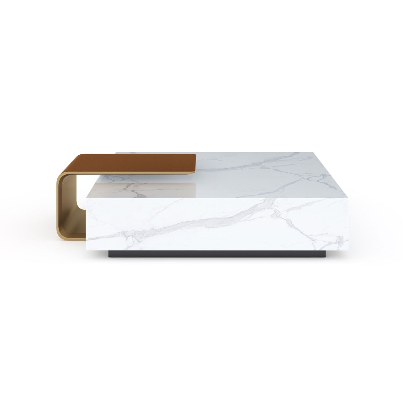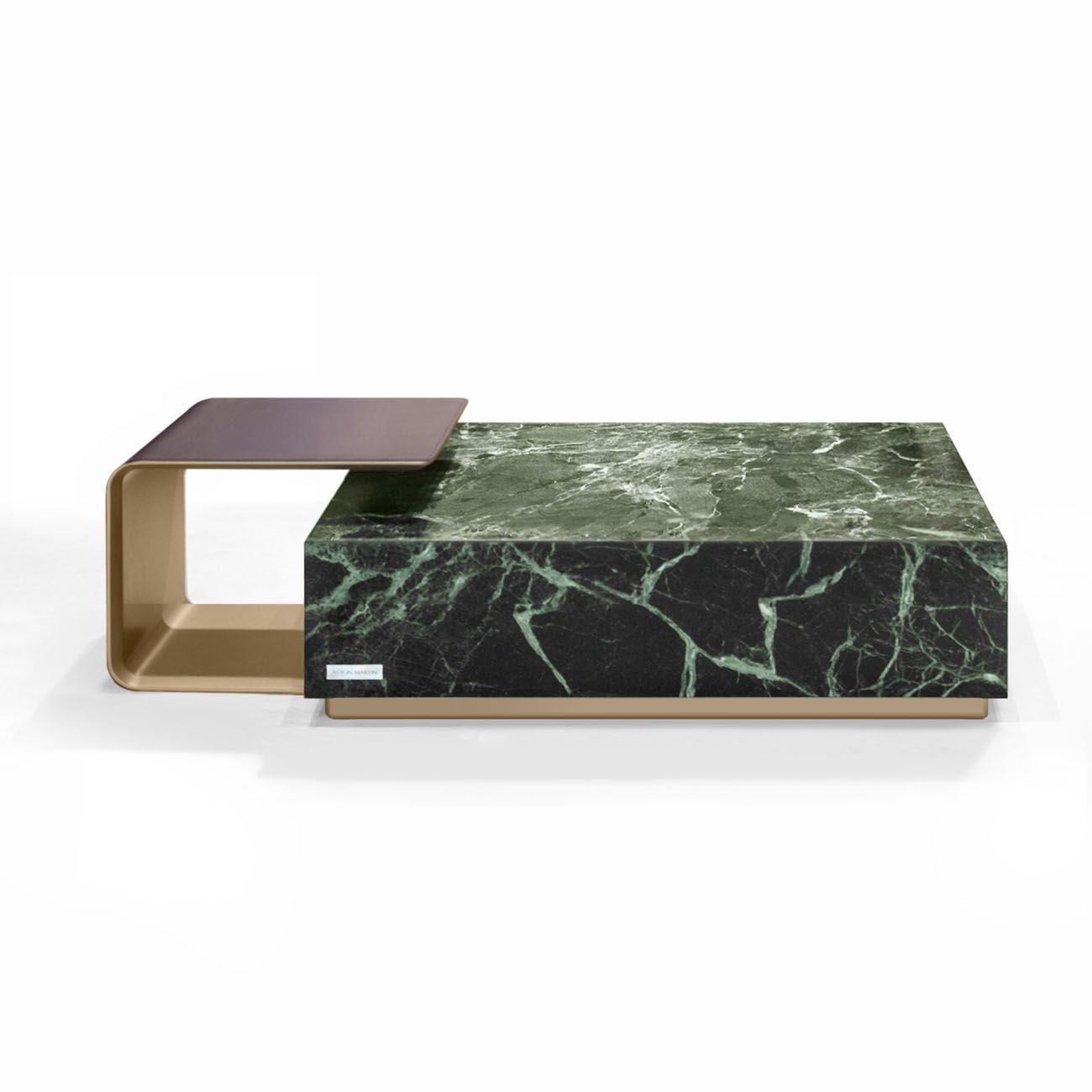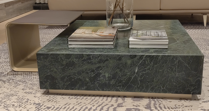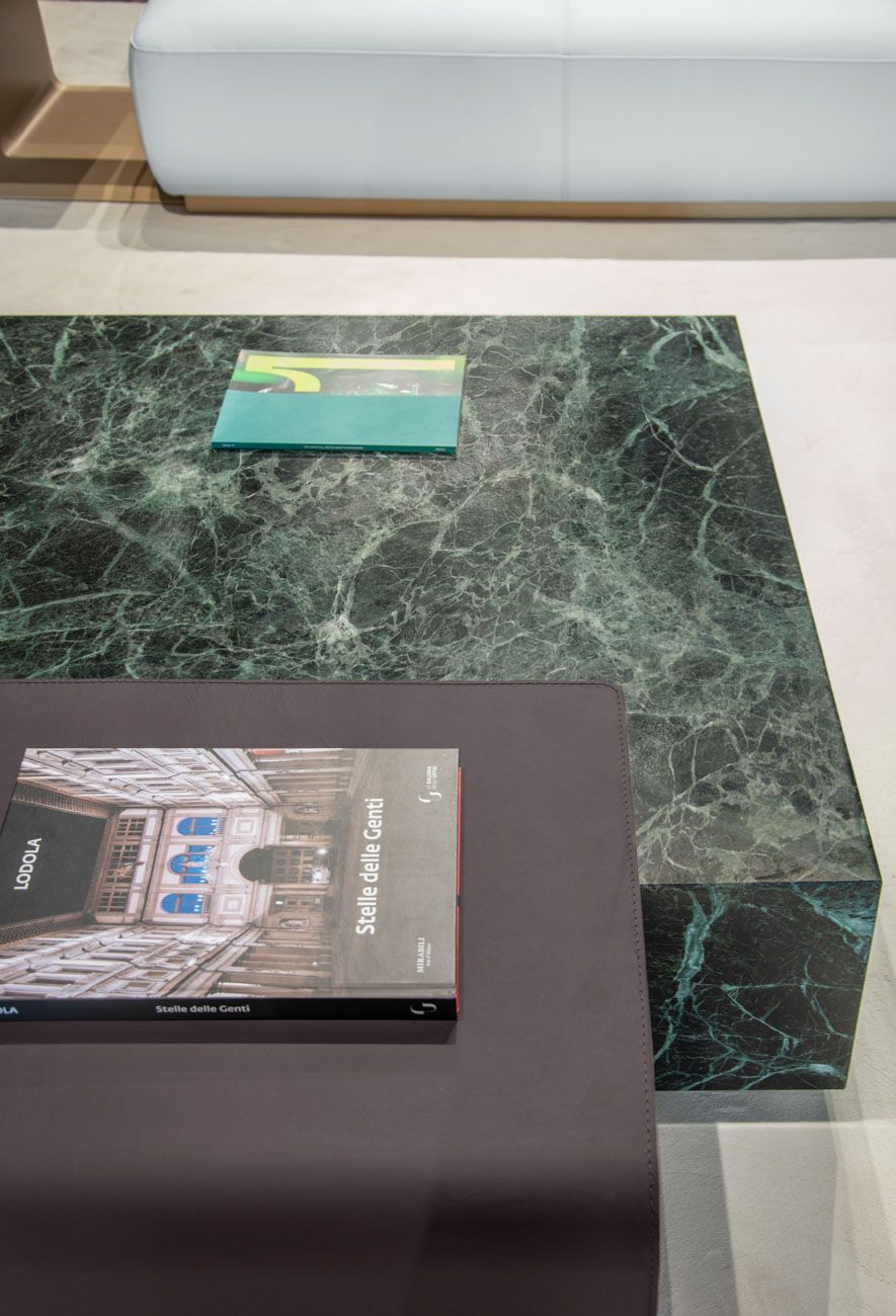 All in marble Verde delle Alpi. Side Table component: external part in leather art. Cuoio col. 6295, internal part lacquered col. Pale Gold.
