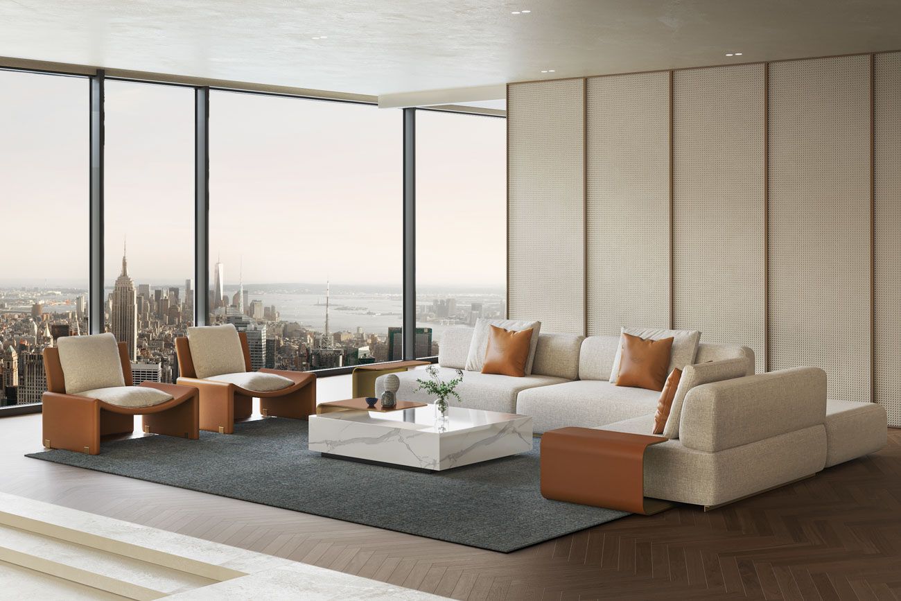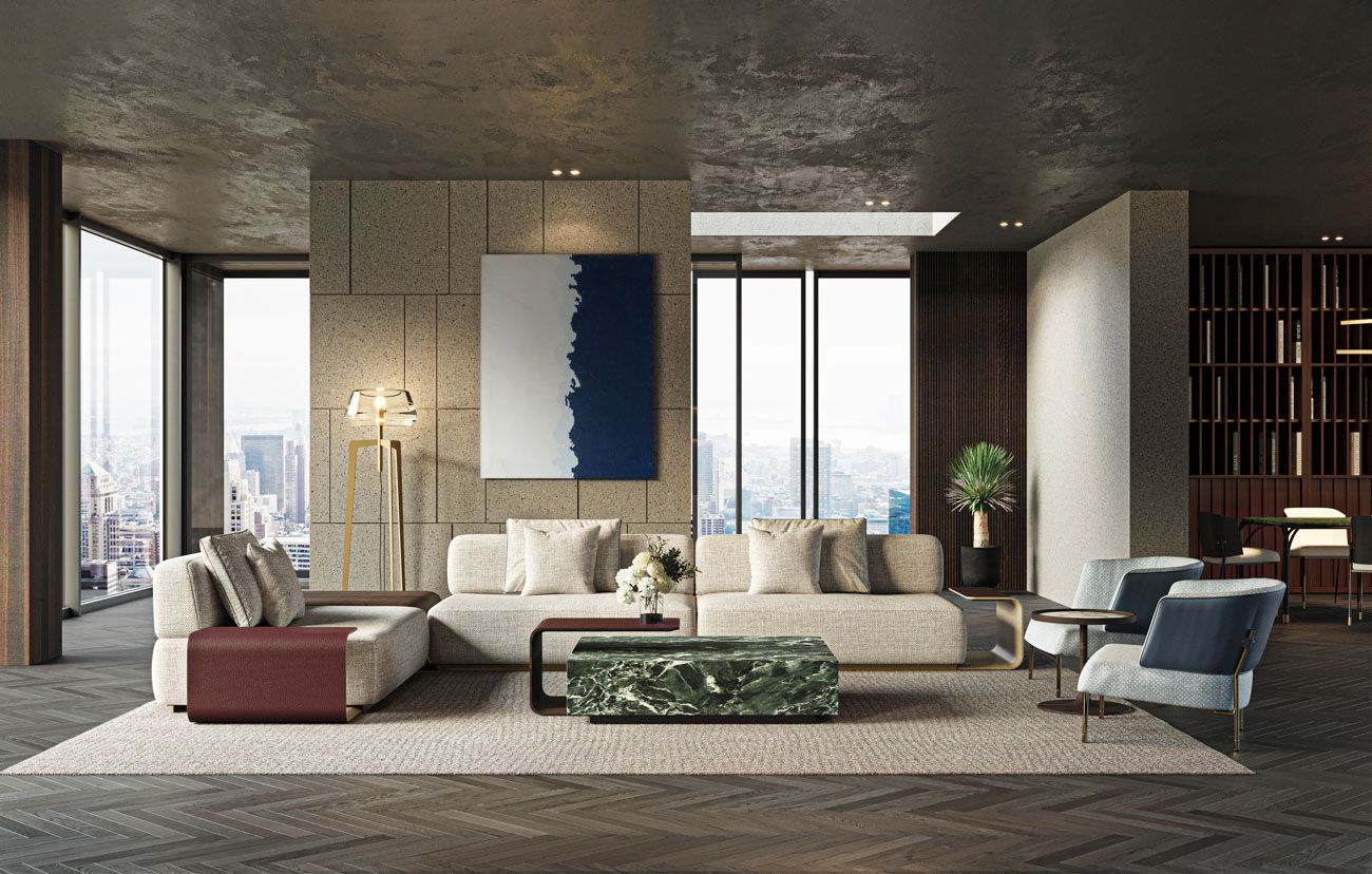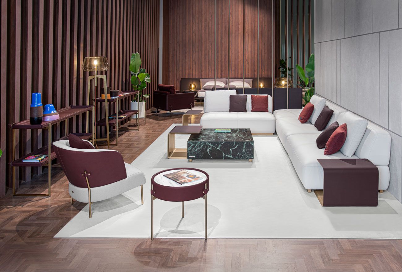 All in marble Verde delle Alpi. Side Table component: external part in leather art. Cuoio col. 6295, internal part lacquered col. Pale Gold.