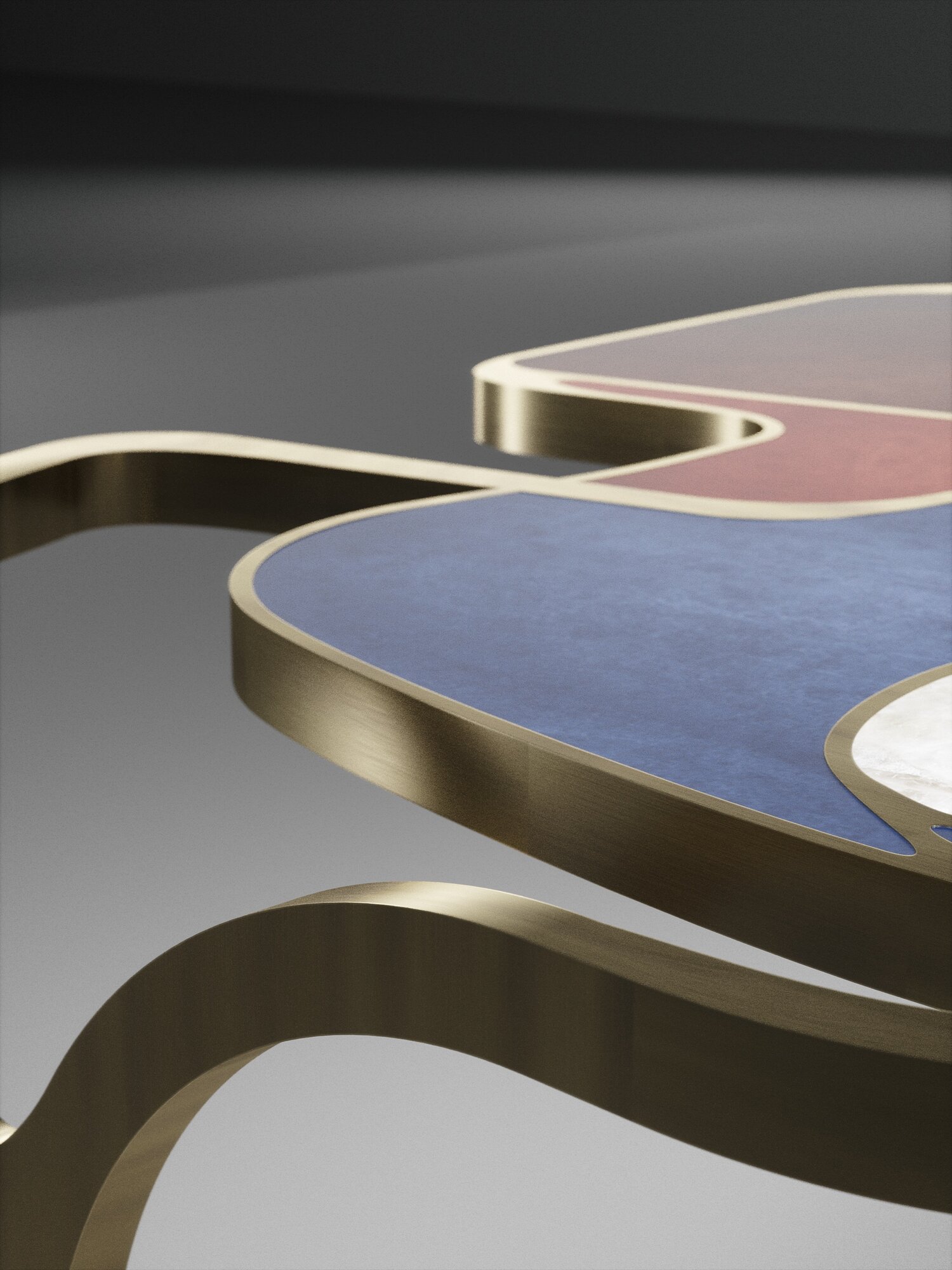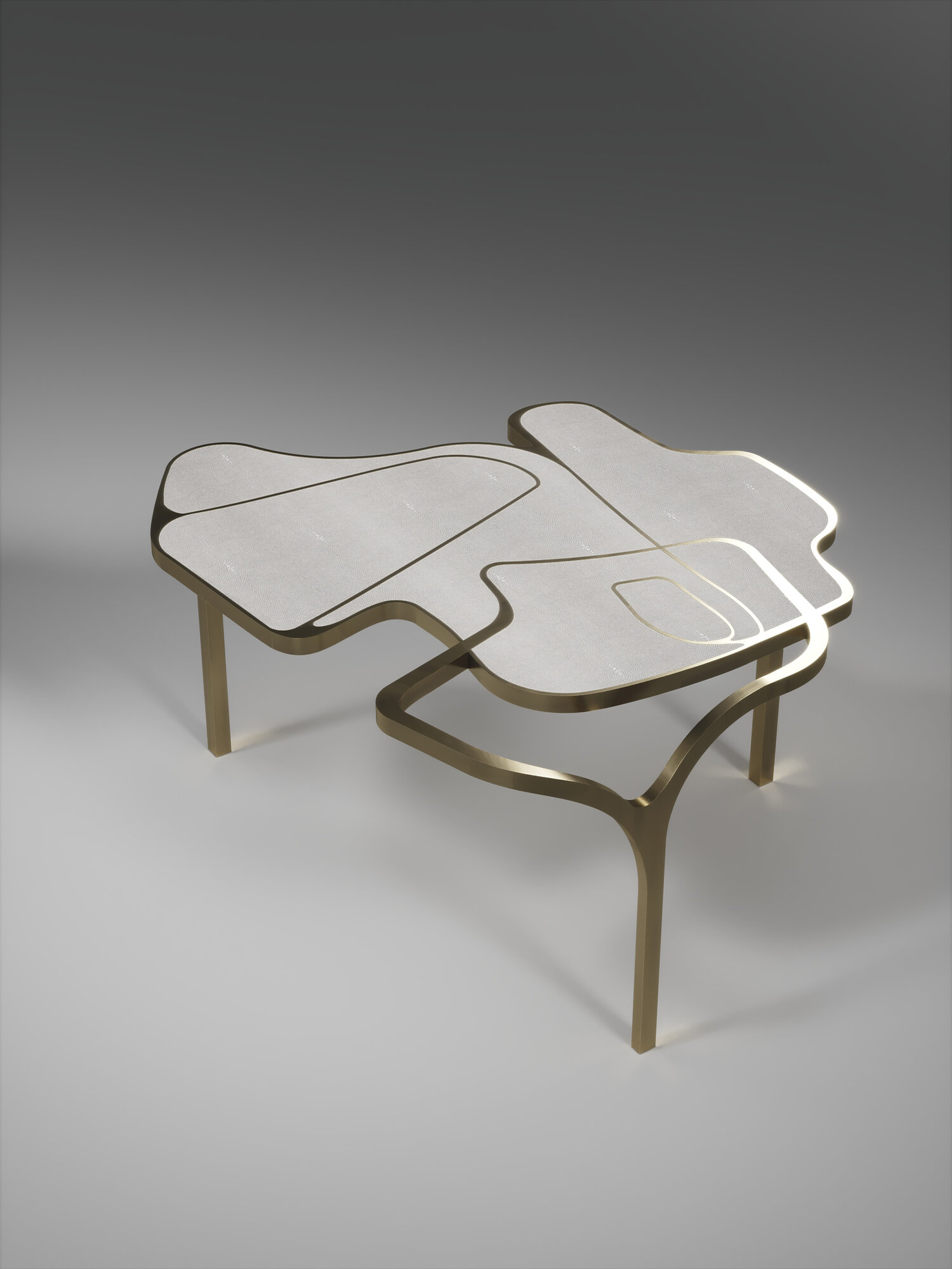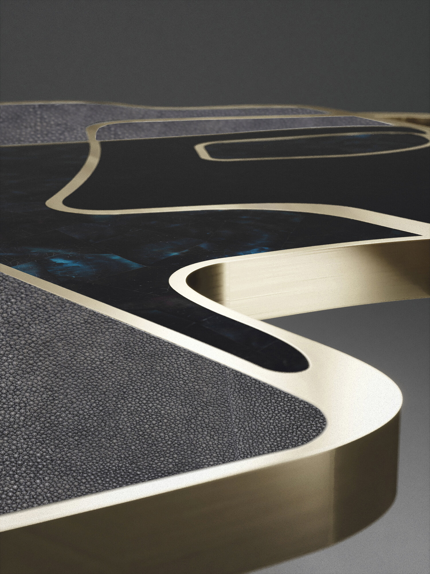 The Cocteau coffee table by R&Y Augousti is a truly one of a kind piece. The sculptural and ethereal piece has abstract forms, shapes and figures within it that one could interpret in different ways. The bronze-patina brass inserts in the inlaid surface "melt" organically into the floating frame and base to create this overall beautiful amorphous shape.