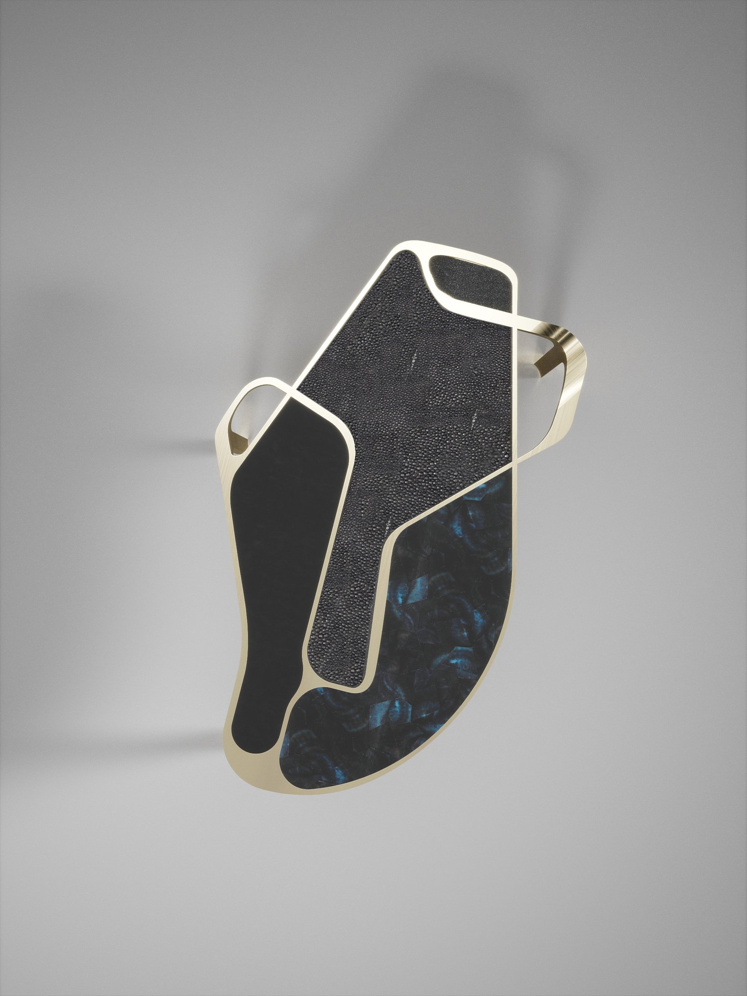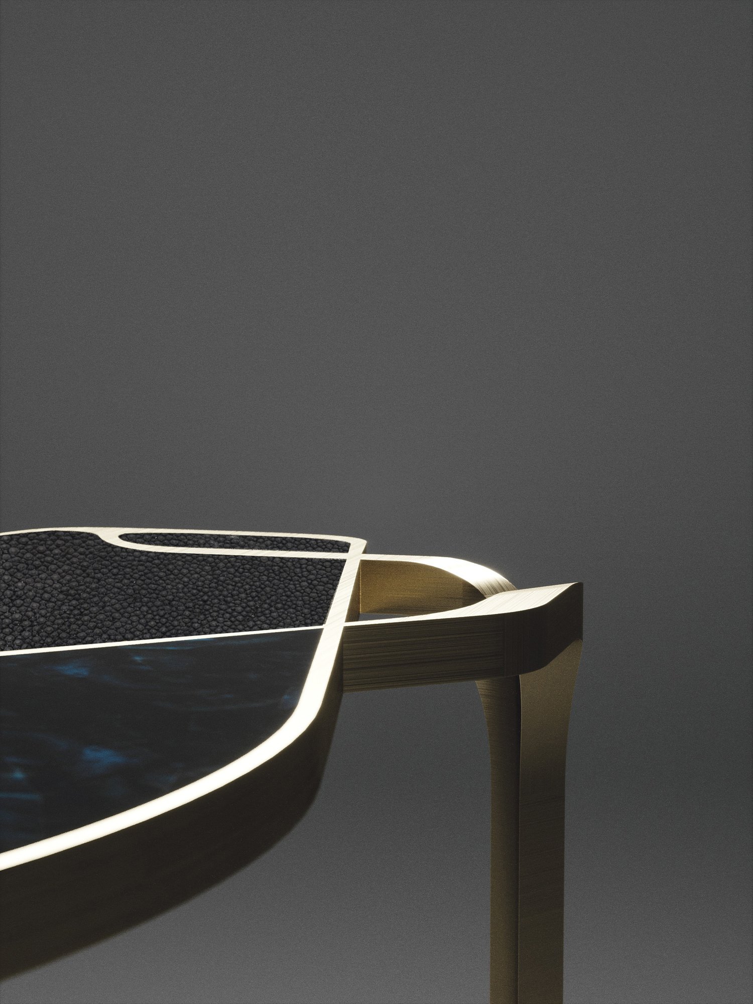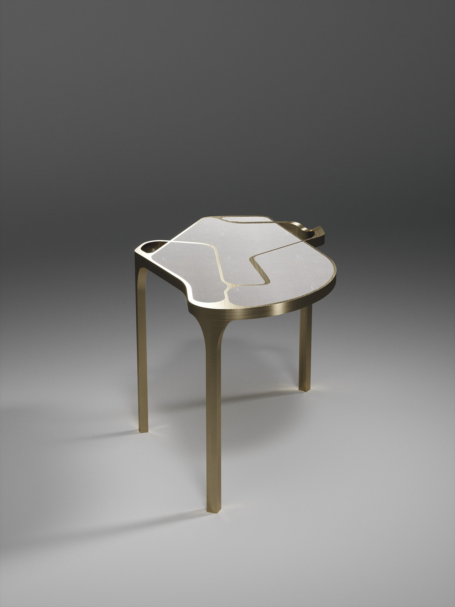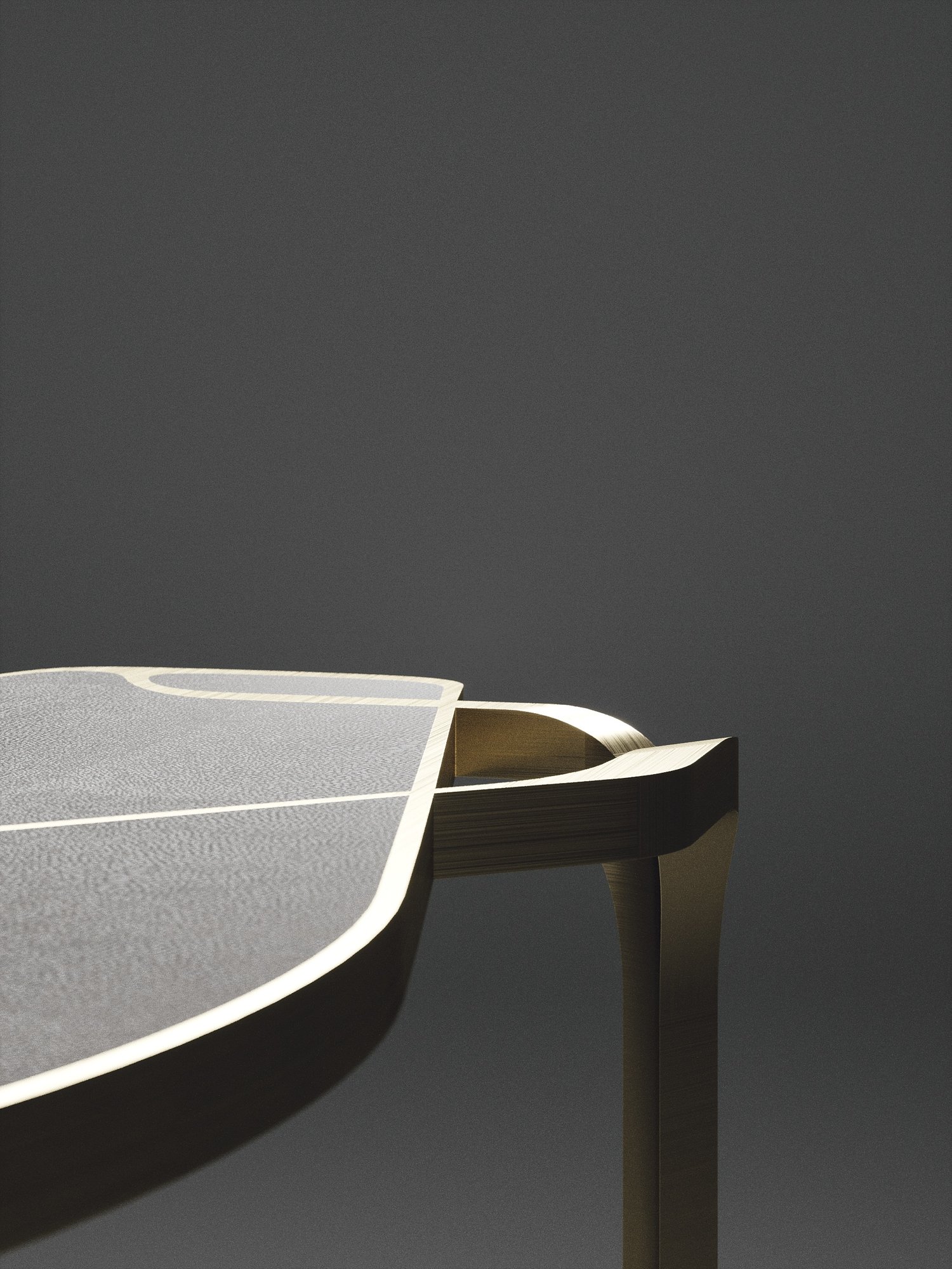The Cocteau II coffee table by R&Y Augousti is a truly one of a kind piece. The sculptural and ethereal piece has abstract forms, shapes and figures within it that one could interpret in different ways. The bronze-patina brass inserts in the cream shagreen inlaid surface "melt" organically into the floating frame and base to create this overall beautiful amorphous shape. Available in other finishes and shape variations.