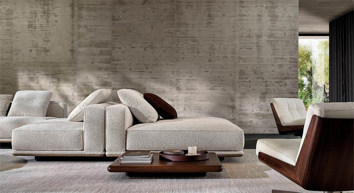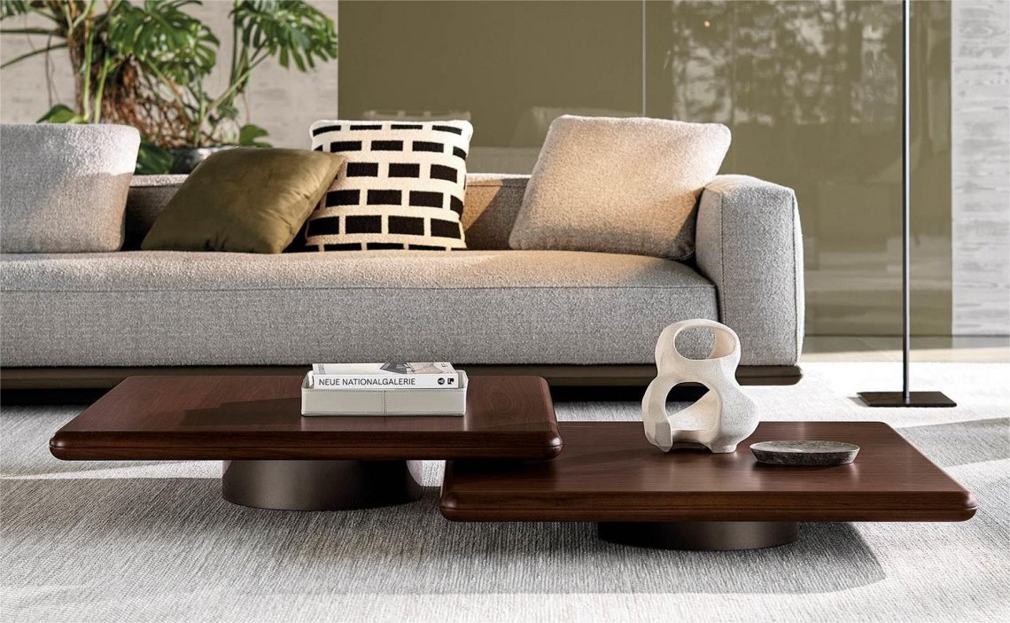 The coffee and side tables also reflect the same style, with floor support in polished Bronze varnished metal and tops in Dark Brown stained Canaletto walnut or Liquorice coloured ash. The different sizes and heights of the coffee and side tables allow for a play of superimpositions that invigorates the horizontality of the entire family.
