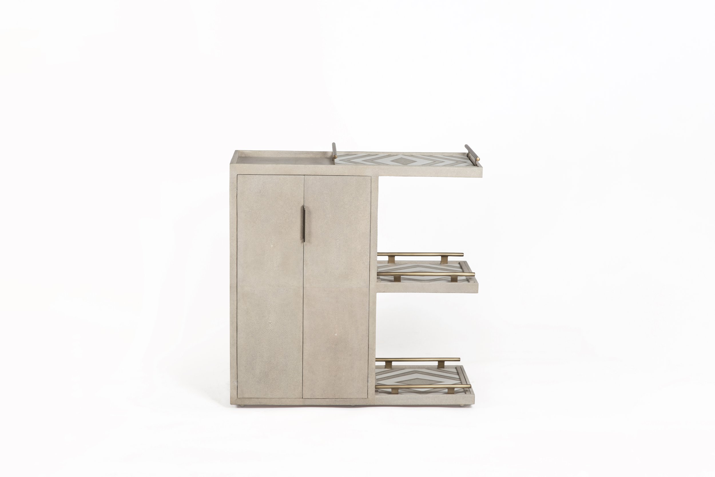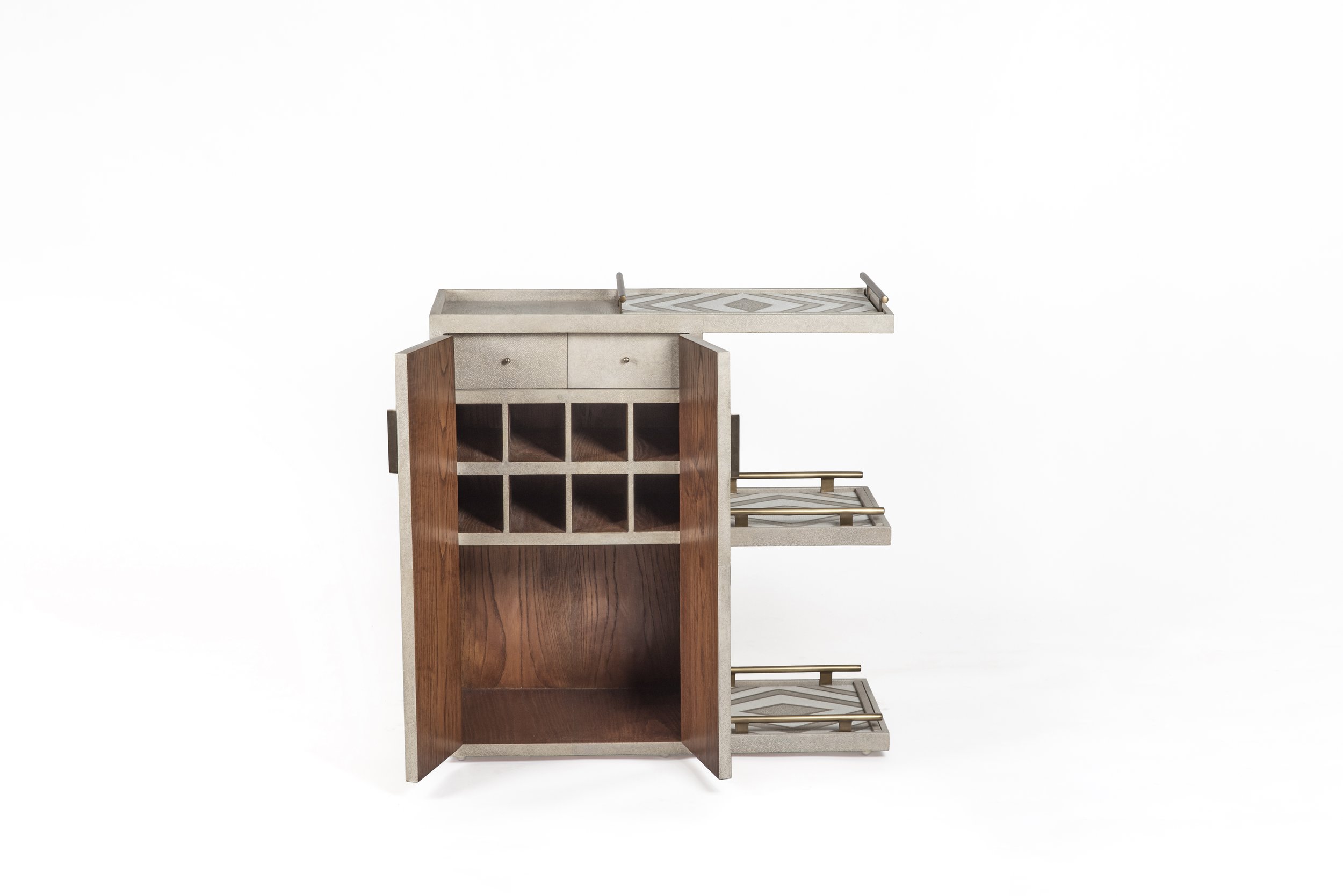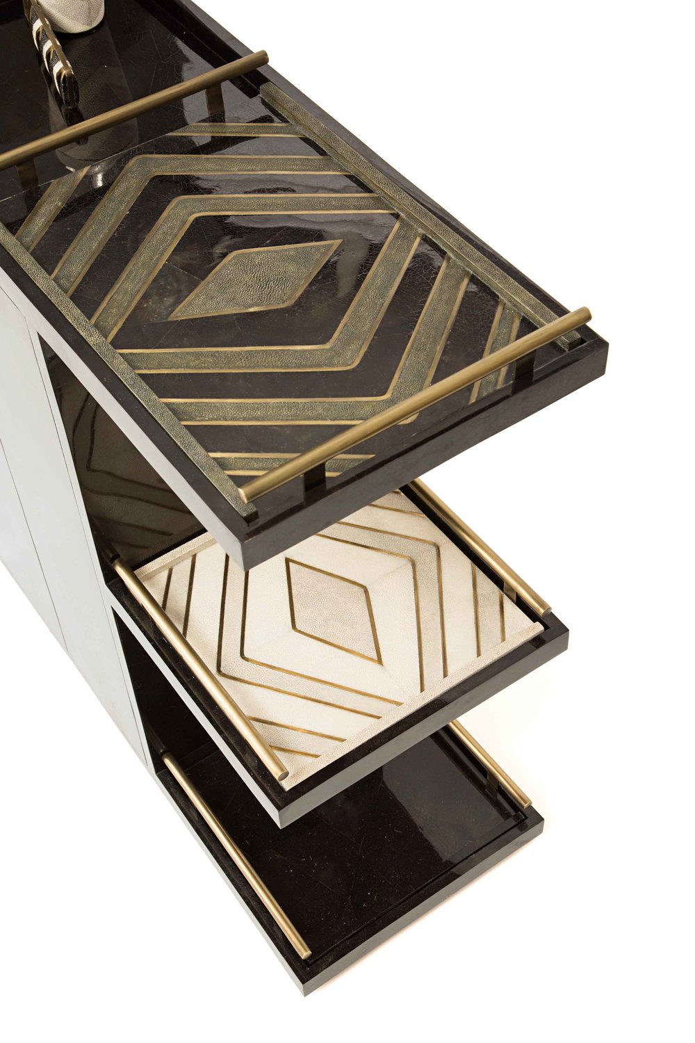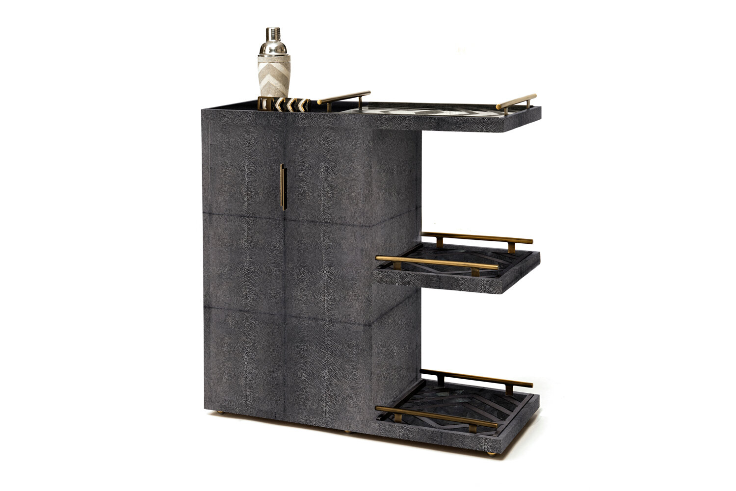 The KIFU PARIS Bar Trolley is a luxurious accent piece for any living space. Available in Antique Natural Shagreen or Black Pen Shell, this piece can be easily moved on wheels and comes with three removable trays. The interior includes two drawers and shelving.