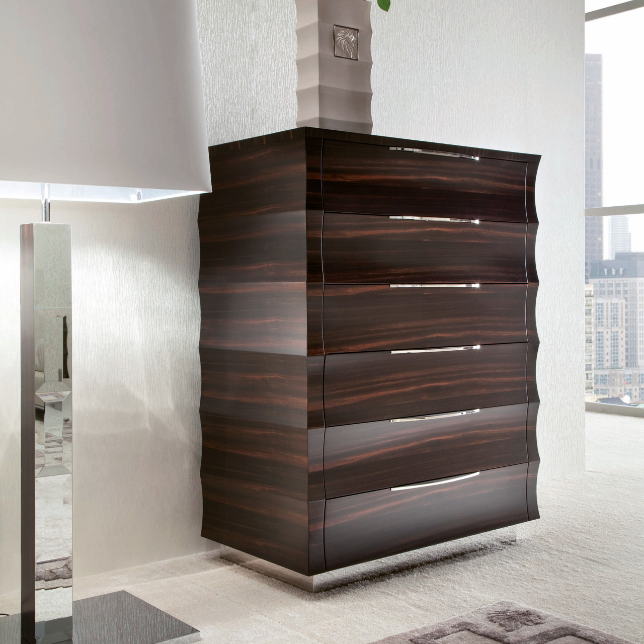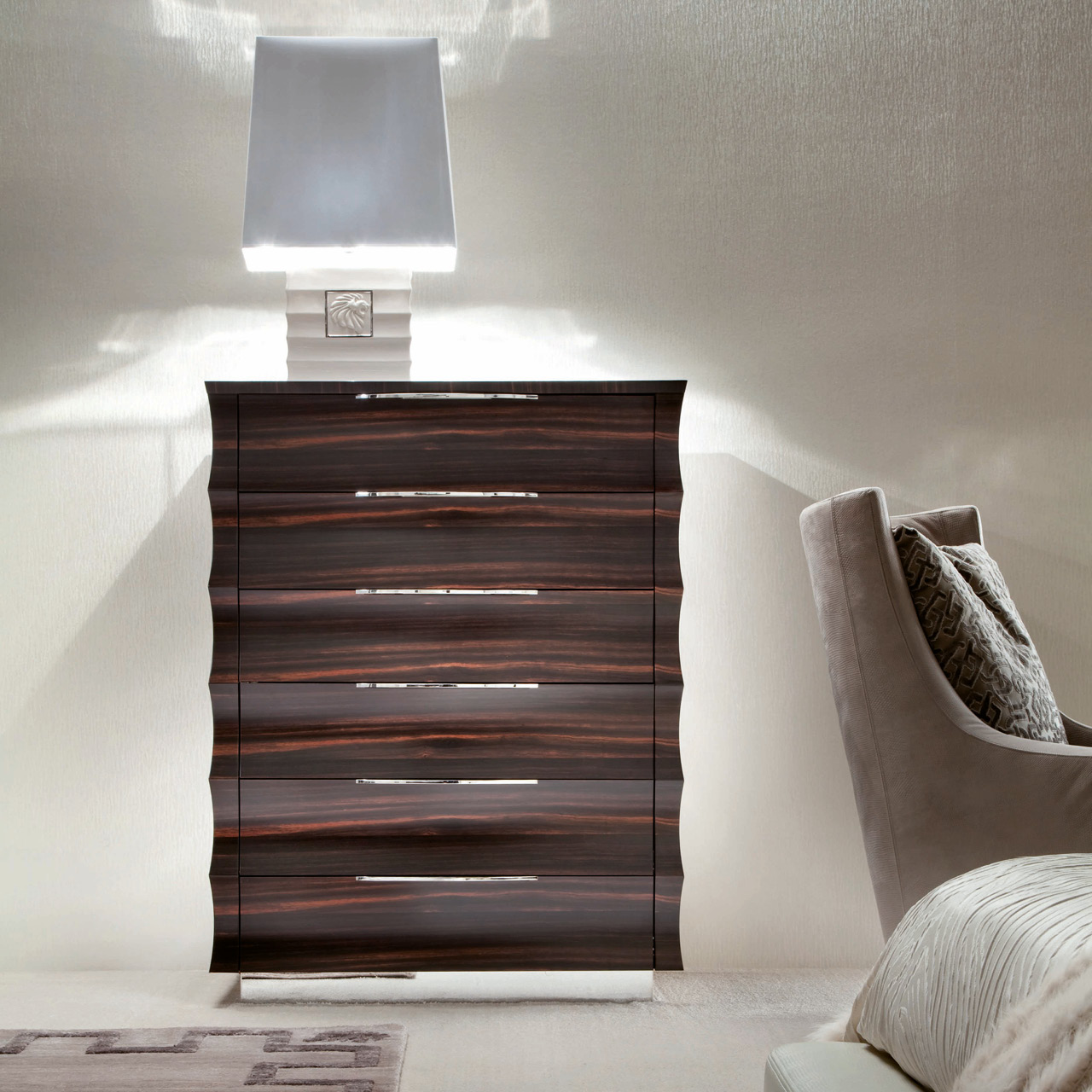 Chest in makassar ebony veneer in satin finish. 6 full extension drawers with 2 top drawers with bottom in velvet fabric. Chrome stainless steel top inlay. Chrome stainless steel handles and details.