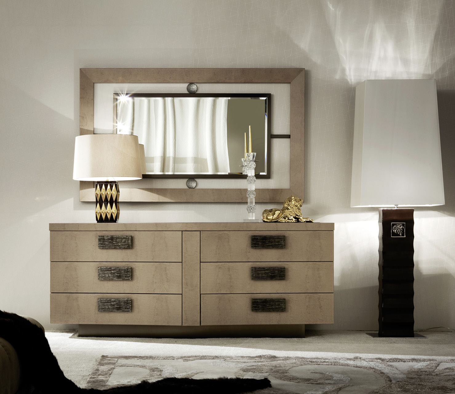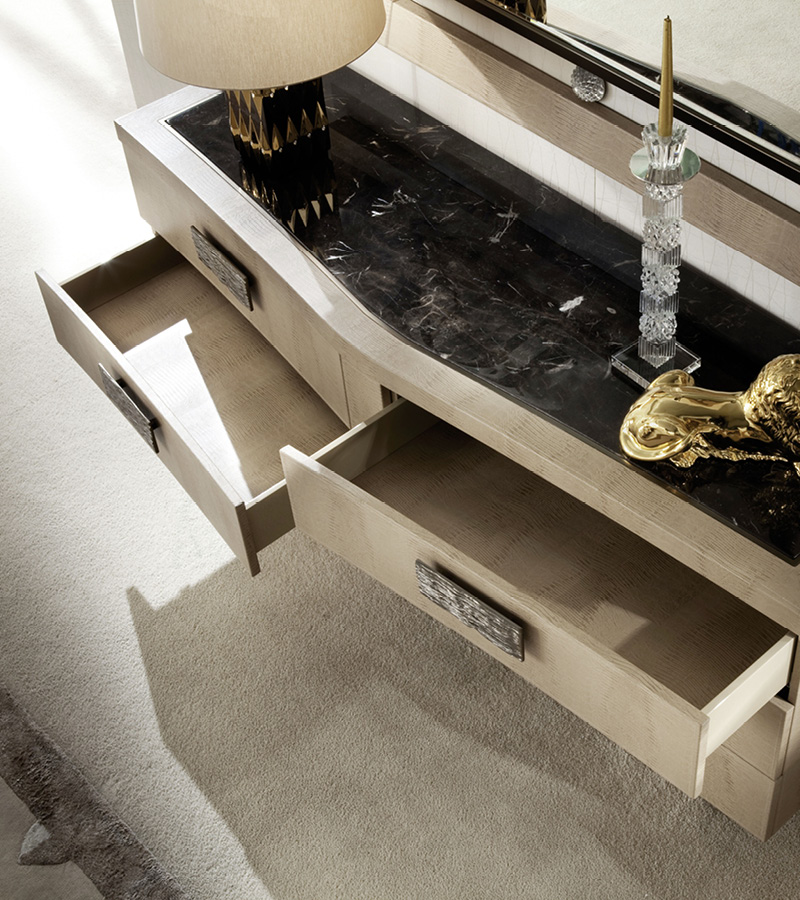 Dresser in armadillo printed leather with brown emperador marble top insert. 6 full extension double drawers with botton drawers in armadillo printed leather. Details and handles in bronzed brass.
